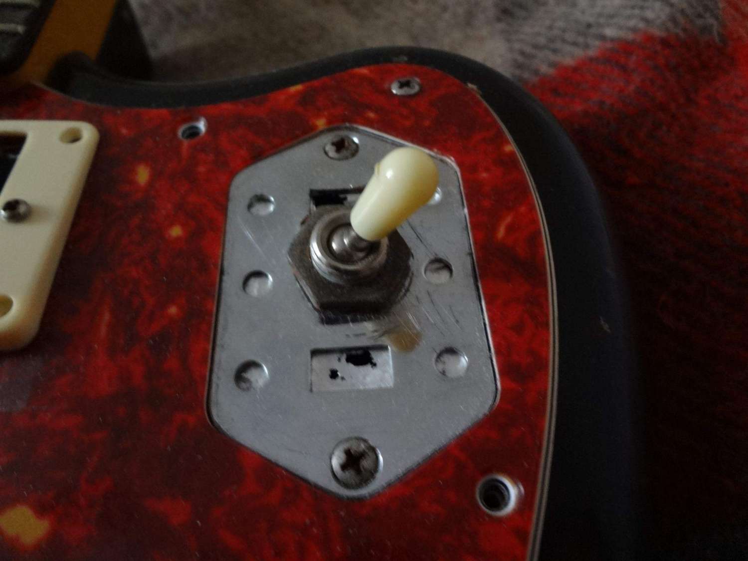 Японский Ягуар, от родной краски мало что осталось, под накладкой все выпилено дрелью, вся родная электроника выброшена на помойку, стоят датчики Seymour Duncan Alnico II Pro. По сути они вкручены прямо в деревяшку , один стоит, если не ошибаюсь, на коробочке от Тик-Така, другой на чем то похожем.