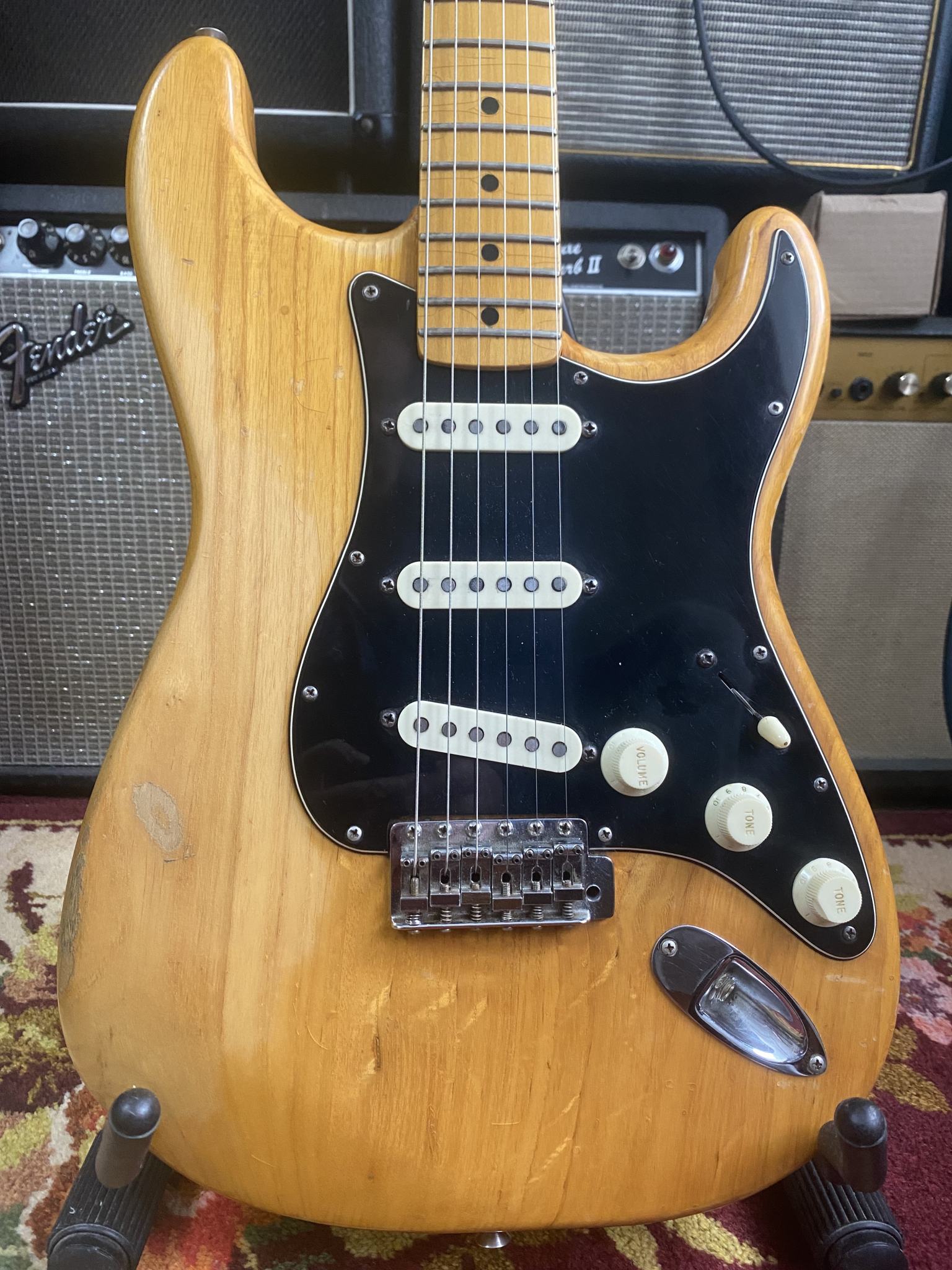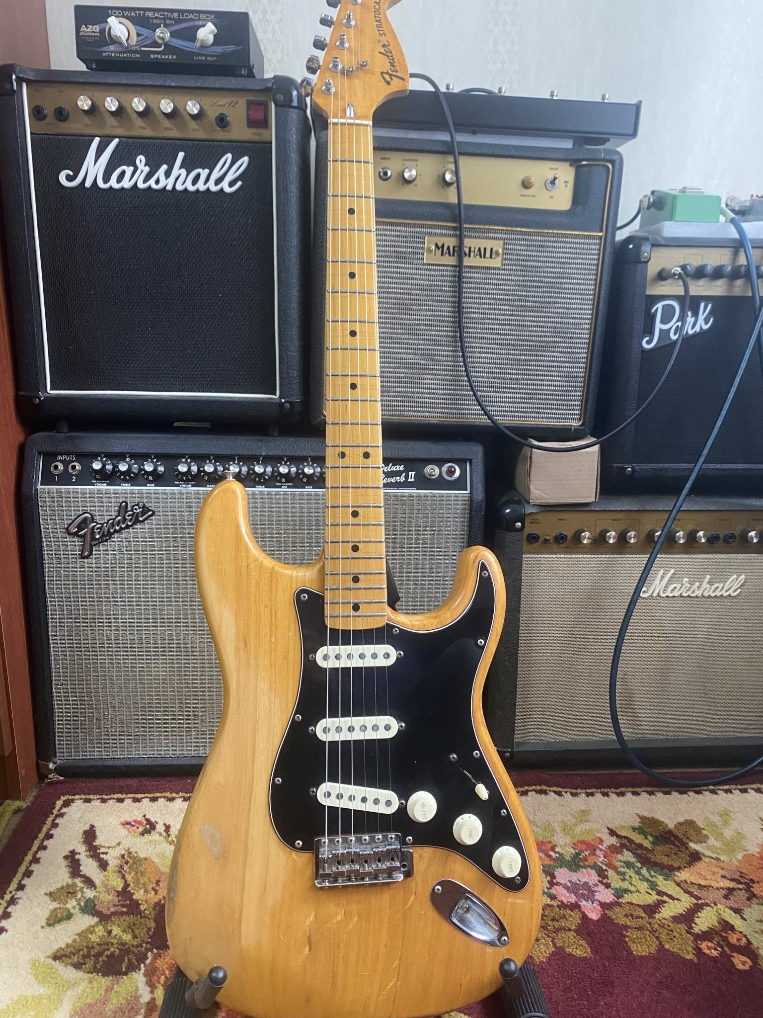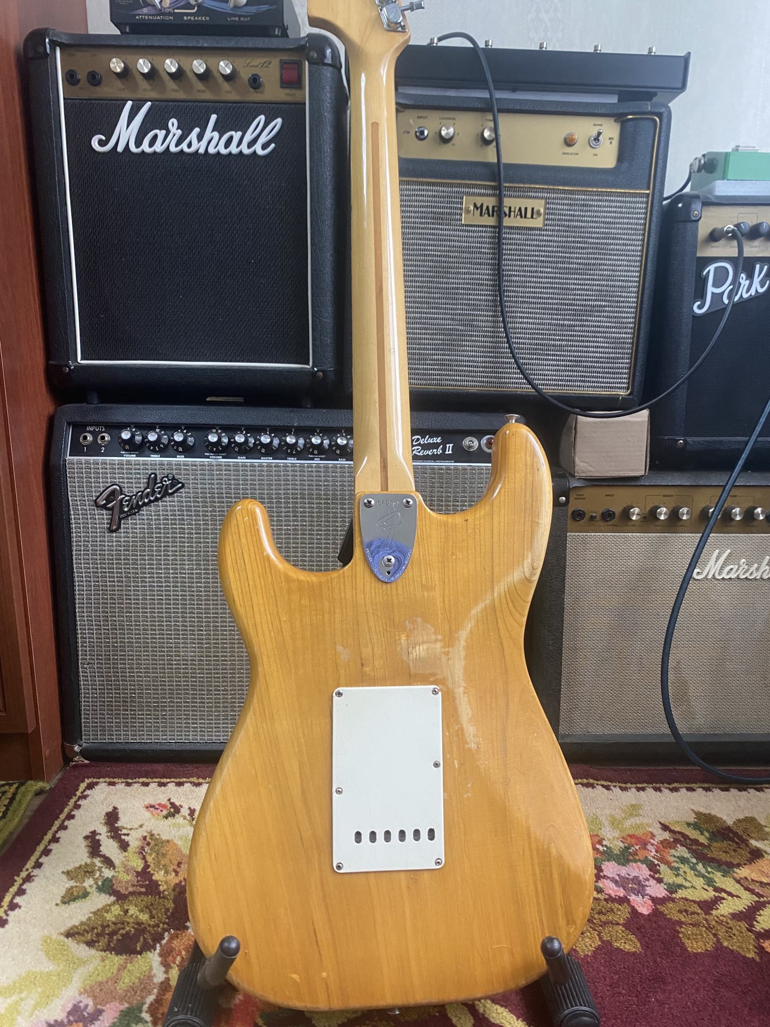 На продаже великолепный инструмент из личной коллекции - Fender Stratocaster 1975 года, в отличном рабочем состоянии. Всё родное - звукосниматели, электроника, фурнитура, 3-х позиционный переключатель. Лады Jescar, ставил Виктор Жук, они в отличном состоянии. Покрытие - очень тонкая нитра. Несмотря на то, что эта загорелая красавица разменяла шестой десяток, она легко даст фору любой более молодой сопернице. Звук просто бомба! И в лампу и в транзистор, и на чистом и на перегрузе (особенно на перегрузе), и с педалями и без, звук - эталон. Без преувеличения - уникальный инструмент, никакие "кастом шопы" и рядом не валяются. Цена - 250000руб. Без обменов.