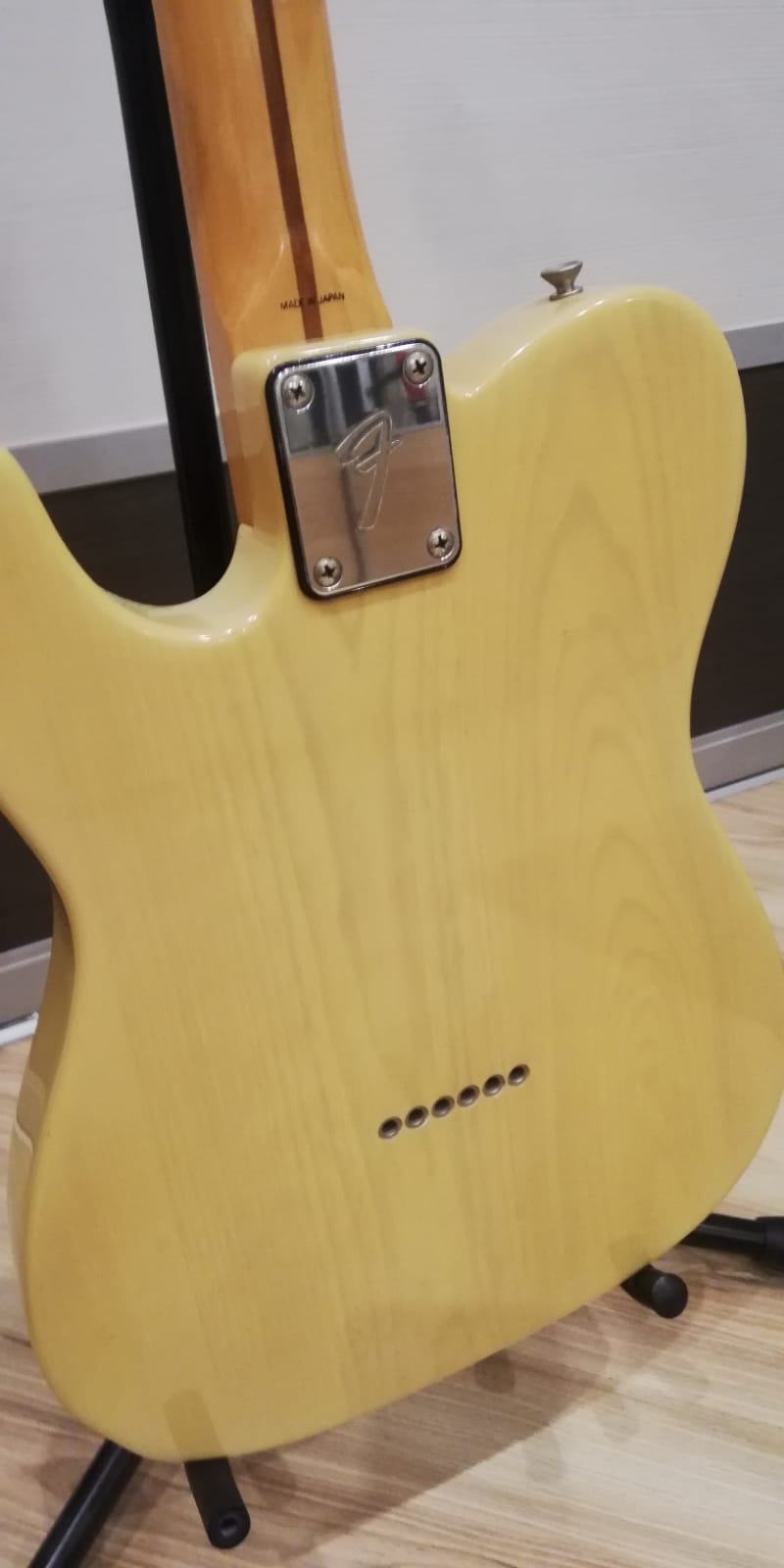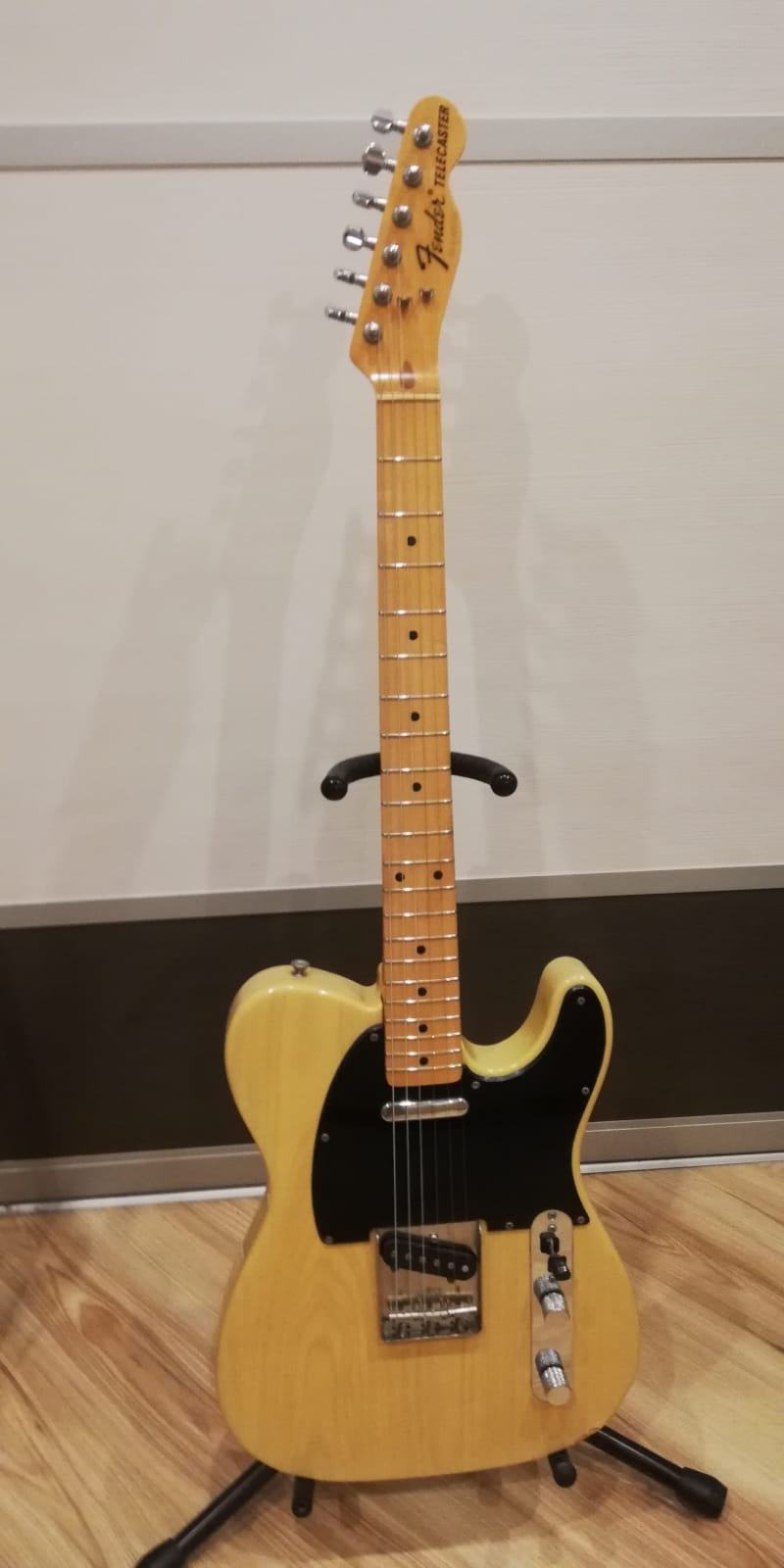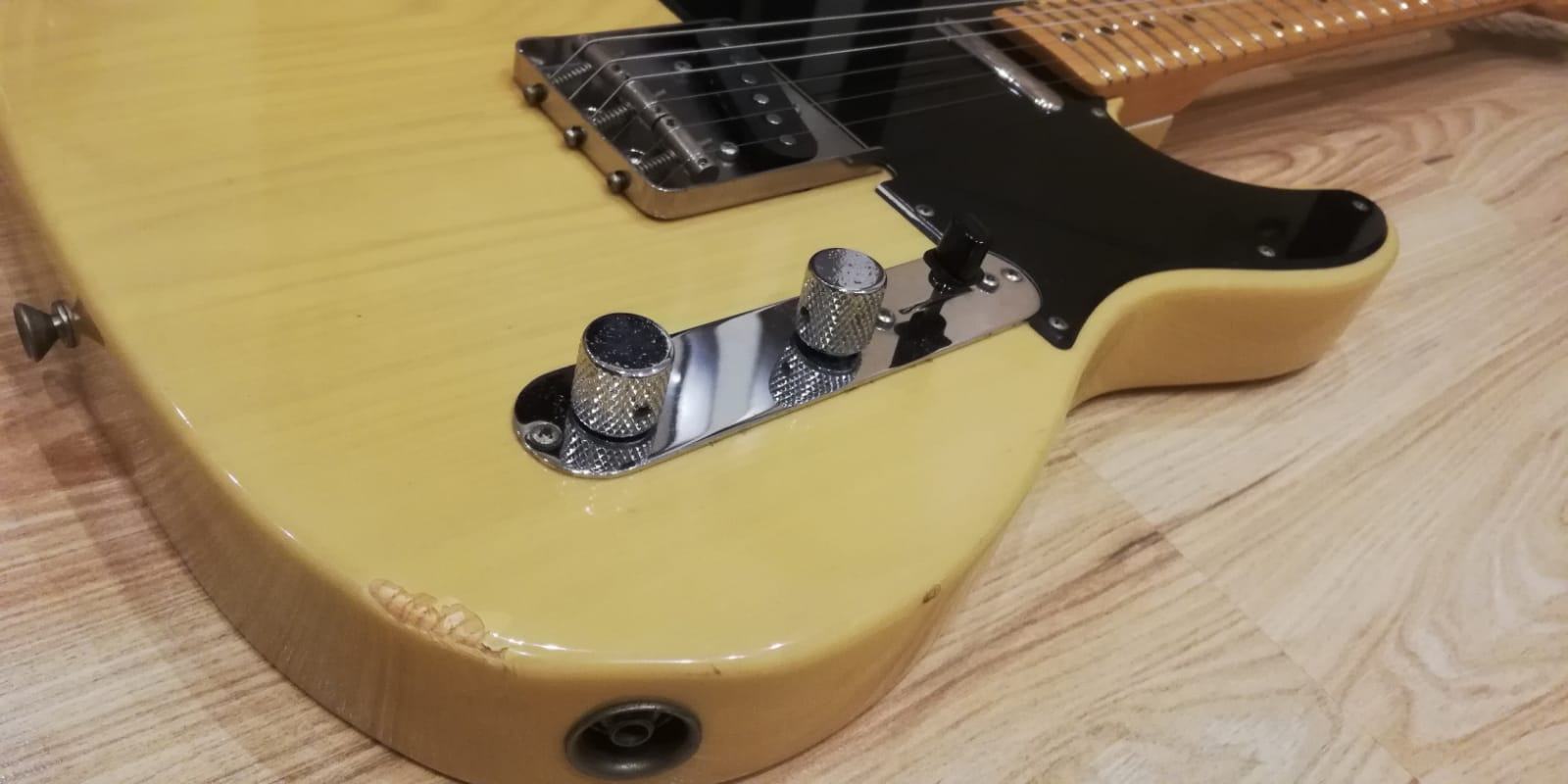 Fender Telecaster TL72-55 японского производства. Это довольно точная копия Telecaster 1972 года, которая воспроизводит звучание американских переизданий за гораздо меньшую цену. Серийный номер на головке грифа имеет префикс E (Made in Japan), что, согласно информации на сайте Fender, датирует гитару примерно 1984 - 1987 гг. Серия E была выпущена после JV и SQ, это делает инструмент одним из самых ранних, выпущенных Fujigen после JV инструментов, поэтому он довольно редкий. У этой модели потрясающая прозрачная отделка корпуса из трёх частей ясеня. На корпусе присутствует превосходный рисунок дерева, который редко встретишь ни на одном японском инструменте (да и на американском тоже). Замечательный кленовый гриф с профилем C. Лады среднего размера с небольшим износом. В целом, инструмент в хорошем состоянии. Присутствует скол лака на ребре внизу деки и небольшие следы эксплуатации, но для 40-летней гитары, это, что называется, vintage vibe.
