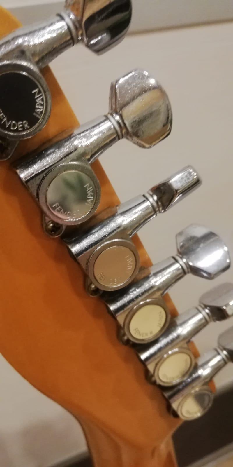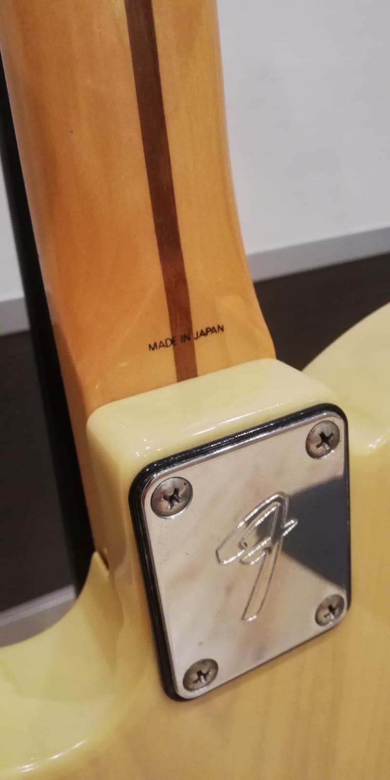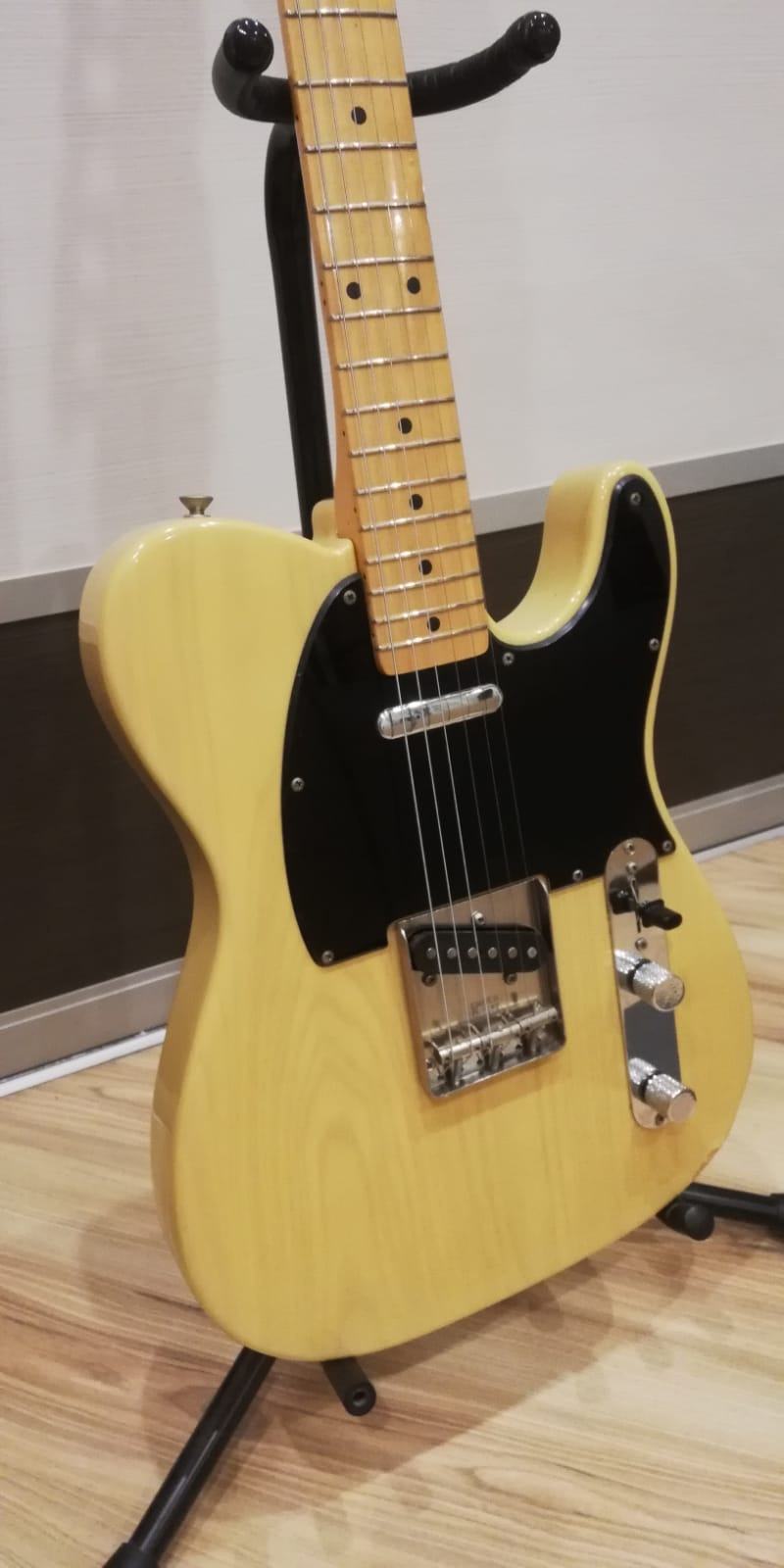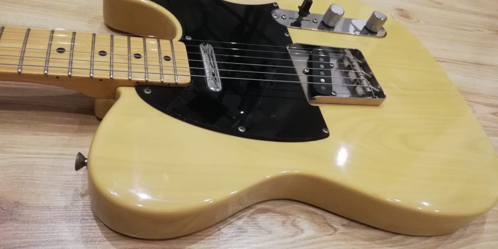 Fender Telecaster TL72-55 японского производства. Это довольно точная копия Telecaster 1972 года, которая воспроизводит звучание американских переизданий за гораздо меньшую цену. Серийный номер на головке грифа имеет префикс E (Made in Japan), что, согласно информации на сайте Fender, датирует гитару примерно 1984 - 1987 гг. Серия E была выпущена после JV и SQ, это делает инструмент одним из самых ранних, выпущенных Fujigen после JV инструментов, поэтому он довольно редкий. У этой модели потрясающая прозрачная отделка корпуса из трёх частей ясеня. На корпусе присутствует превосходный рисунок дерева, который редко встретишь ни на одном японском инструменте (да и на американском тоже). Замечательный кленовый гриф с профилем C. Лады среднего размера с небольшим износом. В целом, инструмент в хорошем состоянии. Присутствует скол лака на ребре внизу деки и небольшие следы эксплуатации, но для 40-летней гитары, это, что называется, vintage vibe.