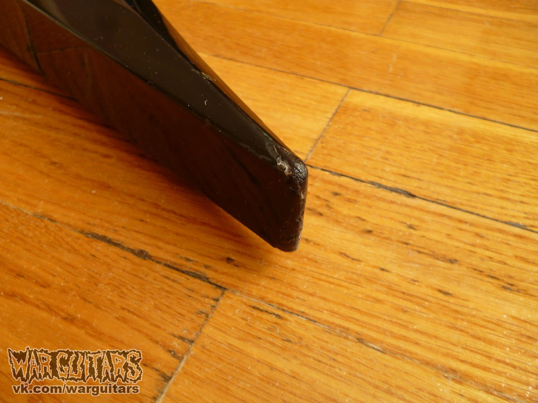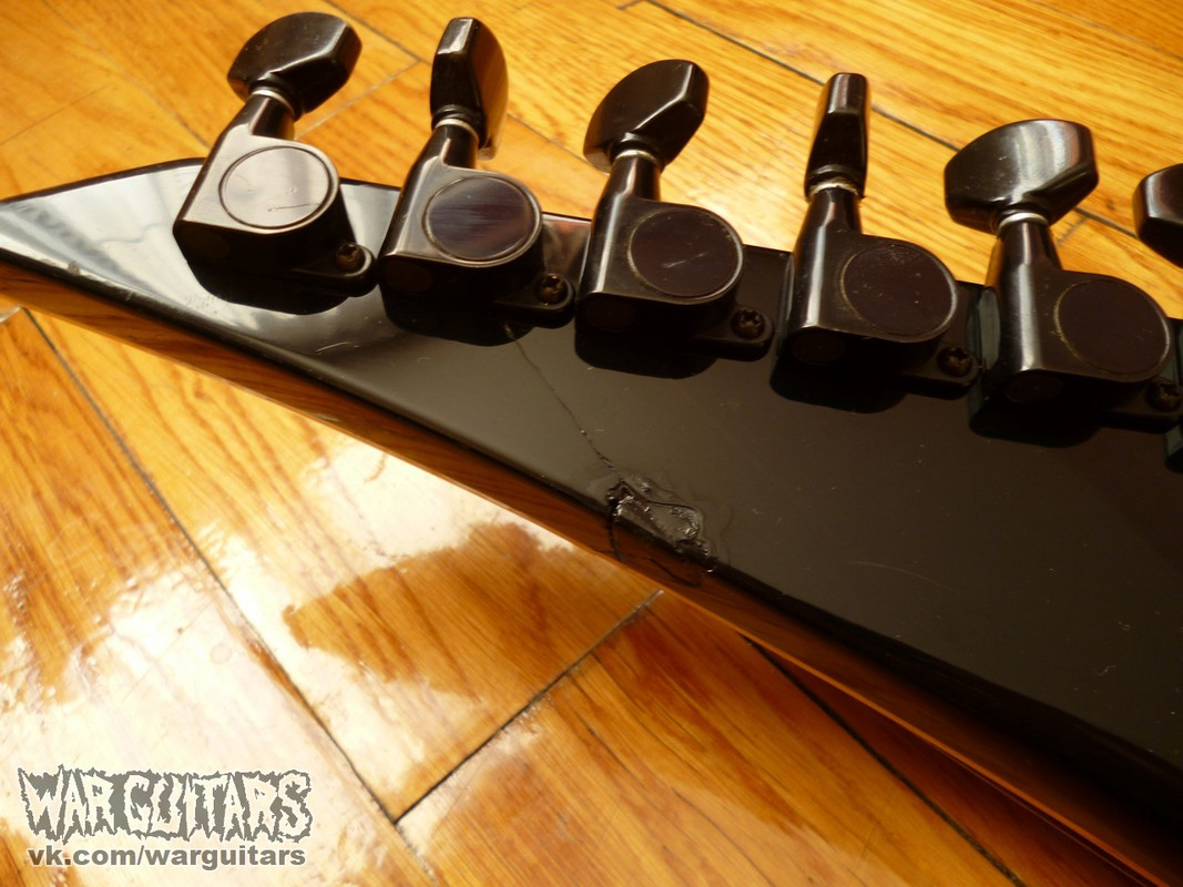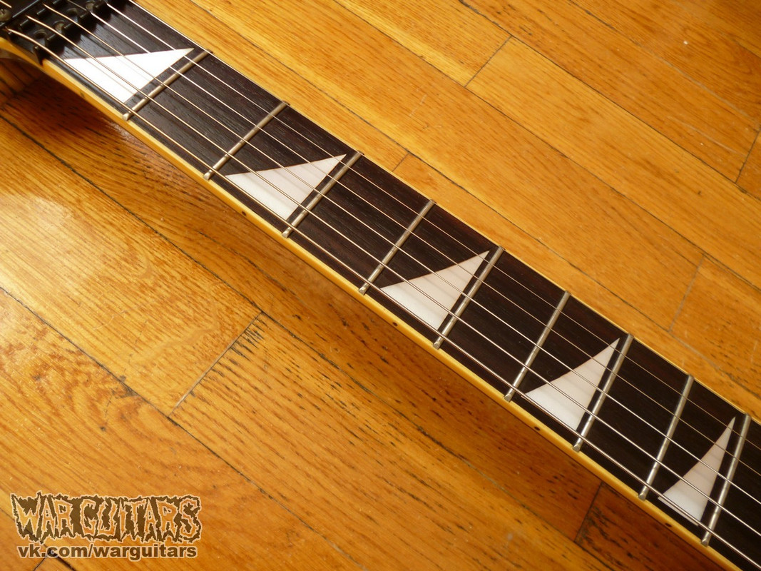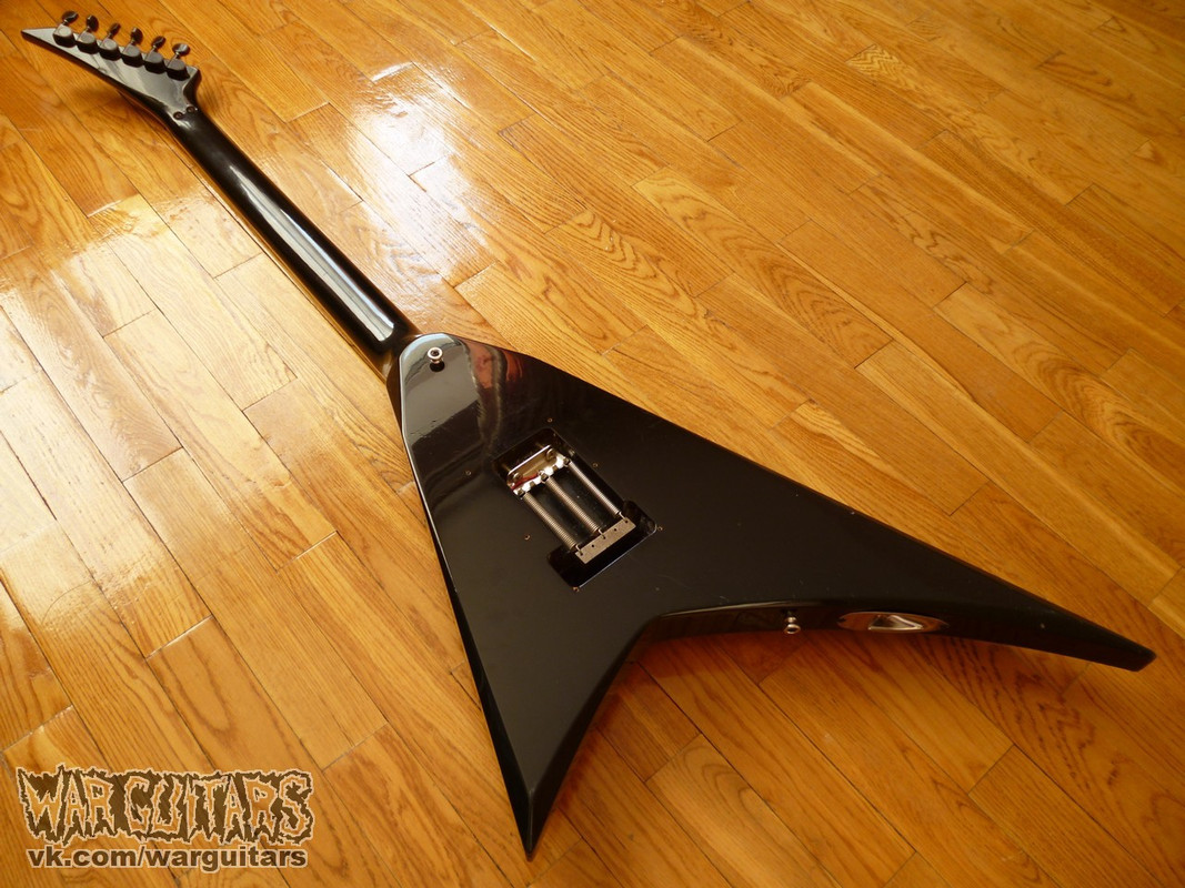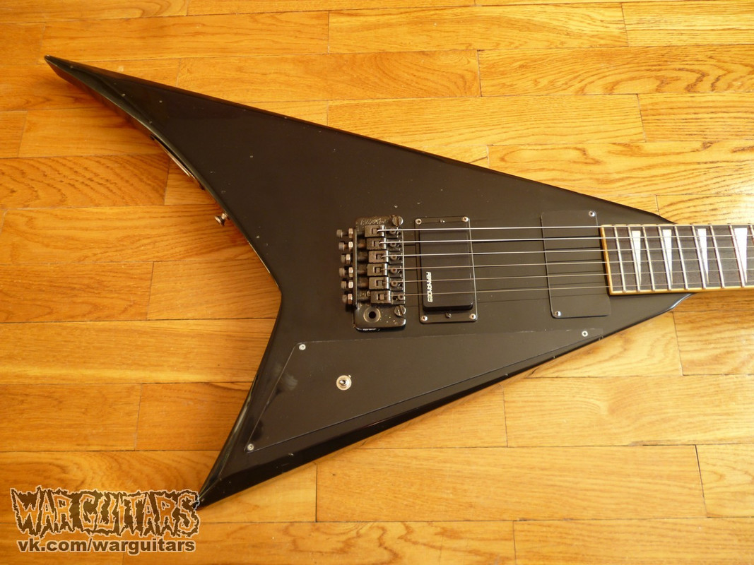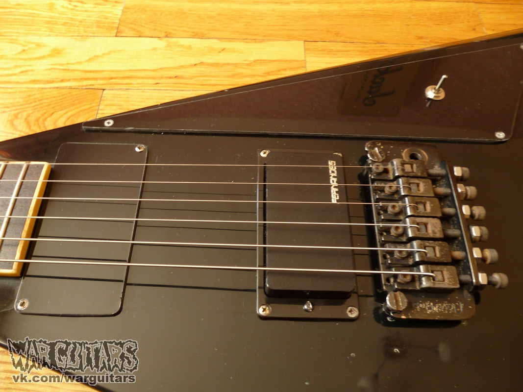 Вряд ли вам много раз в жизни встречался топор брутальнее этого - черная стрила (весь чорний, заниженний! сам чорний и окна чорний!) с зубастым окантованным вклеенным грифом и одним датчиком. Что же не так? Да вот что - здесь, черт побери, нет ни одного сраного потенциометра. Ни одного! Здесь есть то, что давно должна запилить половина миталистов на своих гитарах - выкинуть единственный пот громкости в пользу свитча, который включает и выключает гитару (да-да, наверняка кто-то узнал свои потаенные желания). Так вот, тут это уже сделано. То есть у гитары целиком и полностью два режима - аццкое мочилово и сайлент-модэ. Лаконичнее только у ряда полных маньяков, запаивающих единственный датчик на джек - но тогда между песнями фон и скрежет струн... ну да речь не про это. Косметическая сторона вопроса - у лопаты в одну пору ее жизни случилась мигрень, которая была залечена, и только - в остальном косметически для 35летнего возраста все в порядке. Технически все круто, но нет чашек топ-лока. Хотя оно и не очень актуально при наличии винтажного флойда без микроподстройки. Короче полный рок!