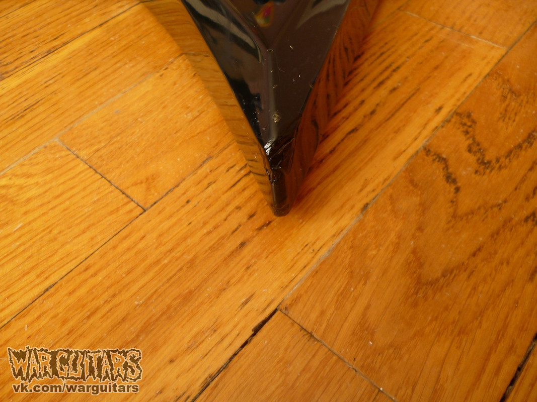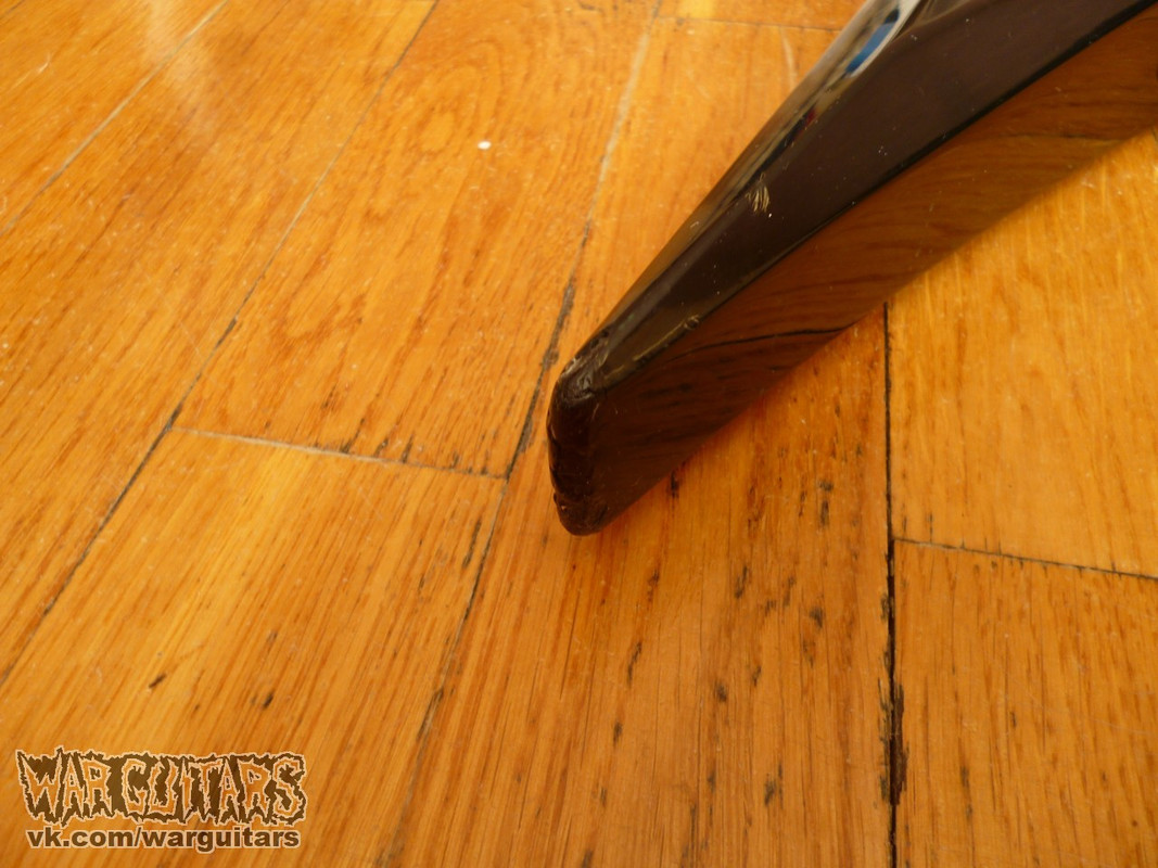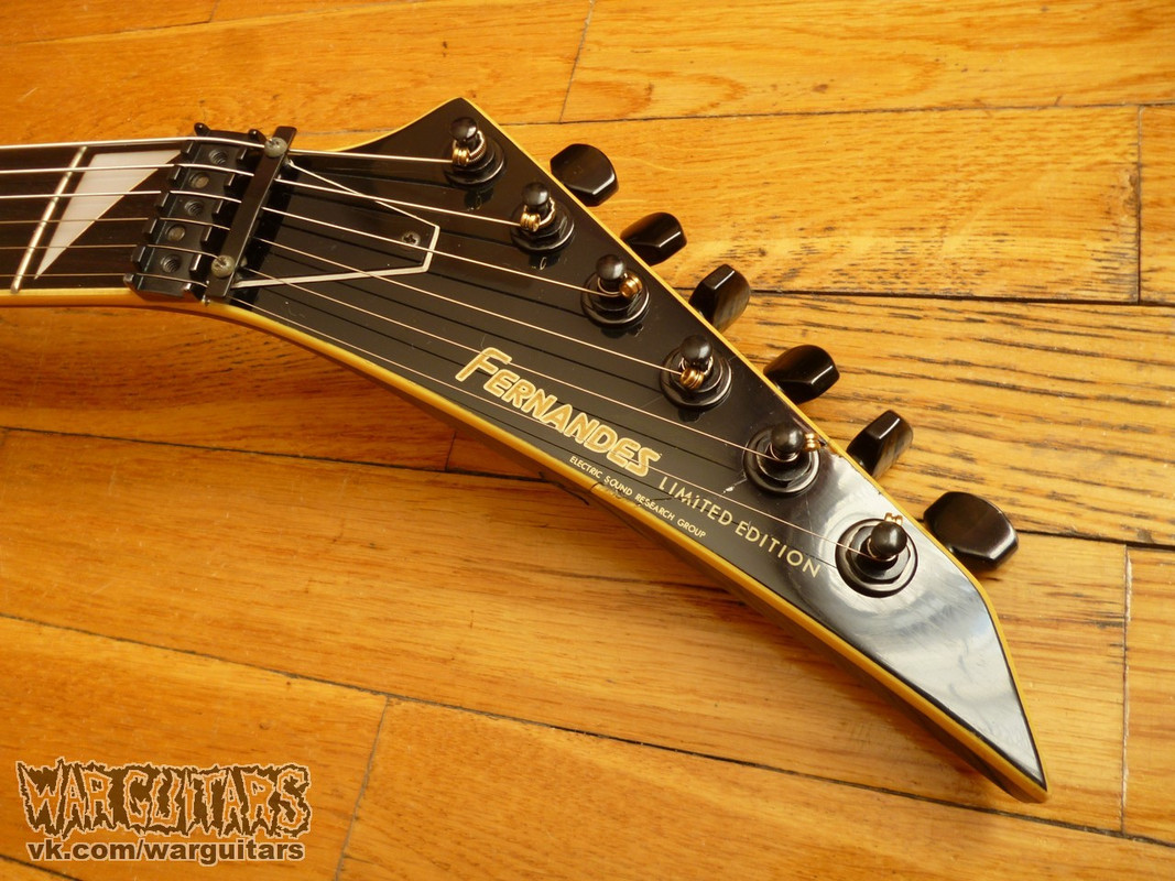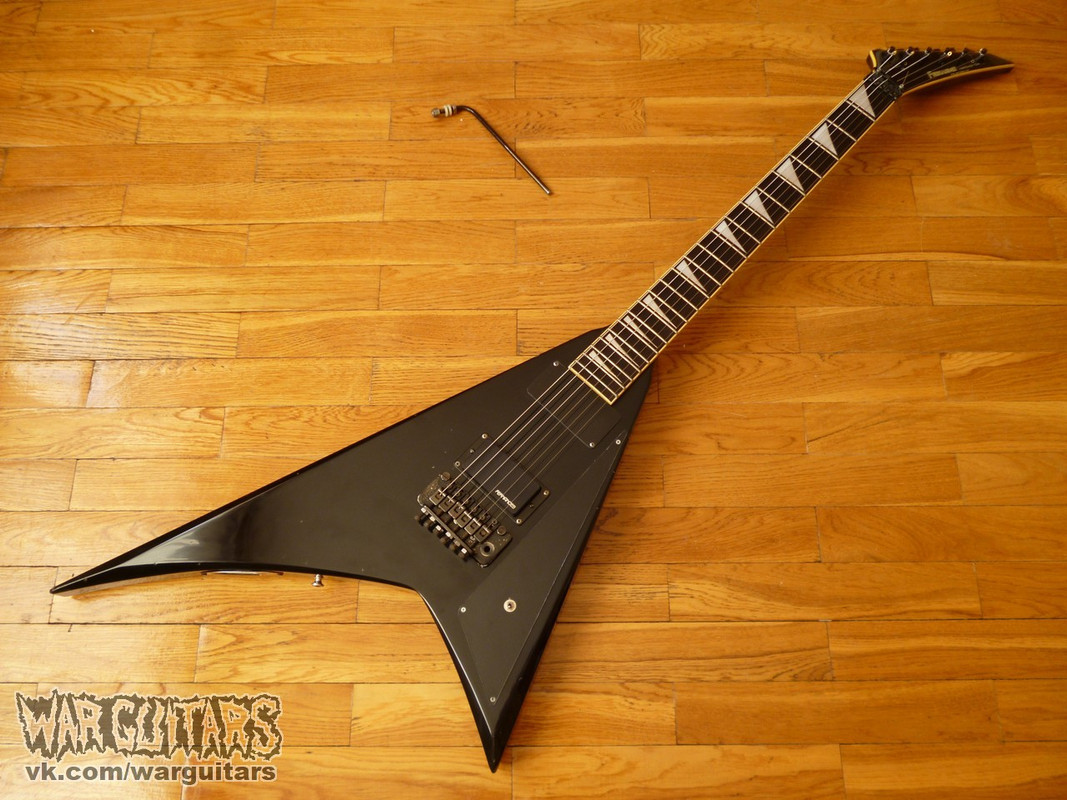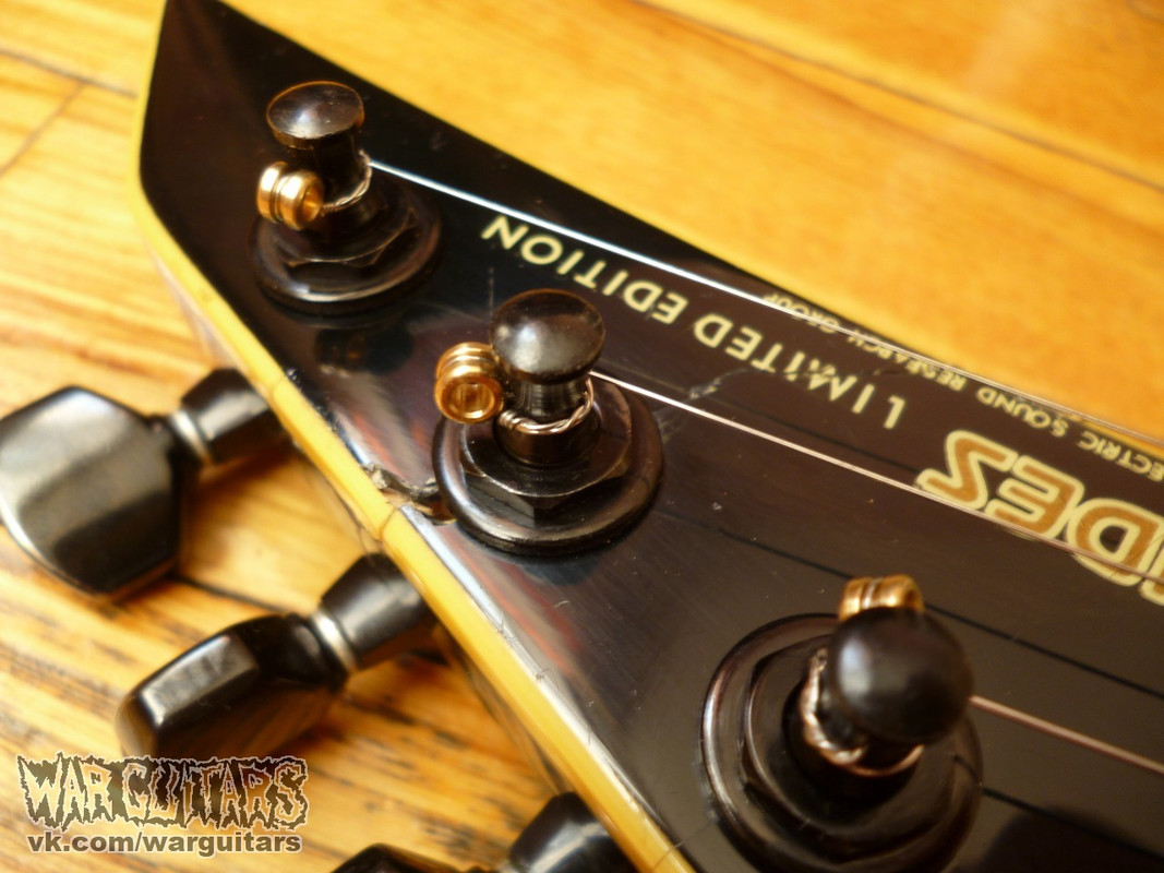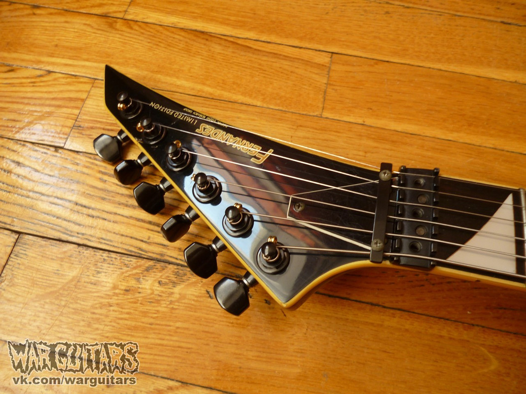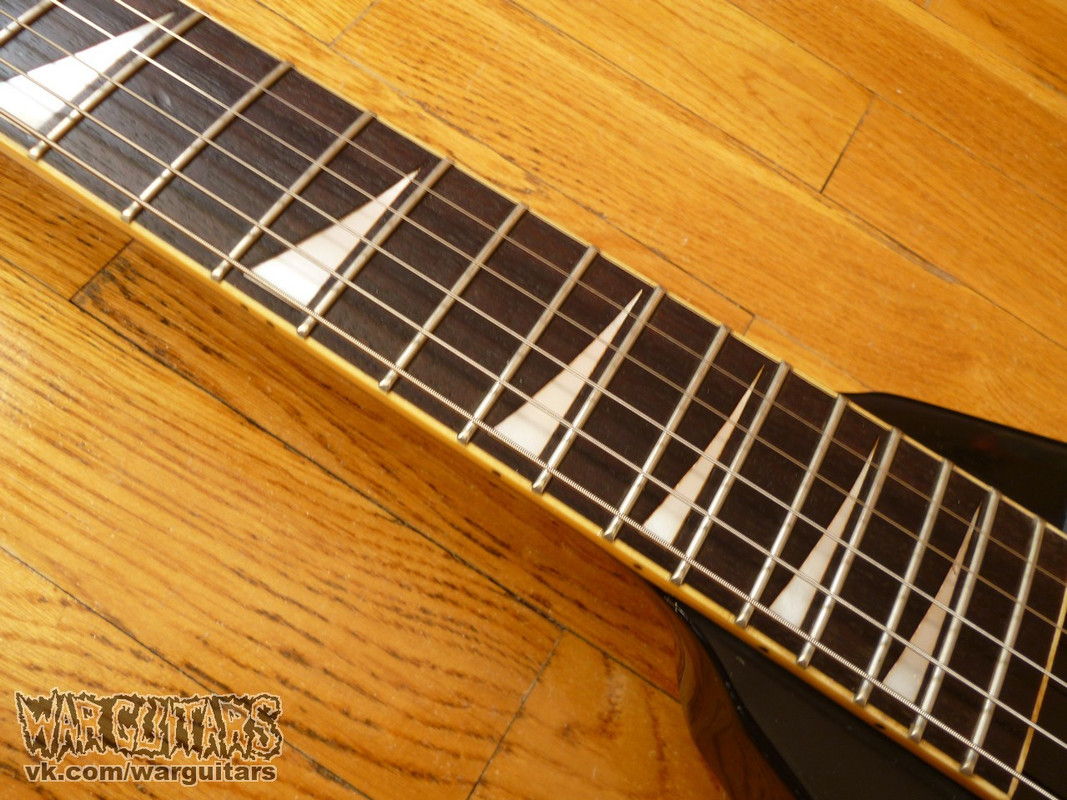 Вряд ли вам много раз в жизни встречался топор брутальнее этого - черная стрила (весь чорний, заниженний! сам чорний и окна чорний!) с зубастым окантованным вклеенным грифом и одним датчиком. Что же не так? Да вот что - здесь, черт побери, нет ни одного сраного потенциометра. Ни одного! Здесь есть то, что давно должна запилить половина миталистов на своих гитарах - выкинуть единственный пот громкости в пользу свитча, который включает и выключает гитару (да-да, наверняка кто-то узнал свои потаенные желания). Так вот, тут это уже сделано. То есть у гитары целиком и полностью два режима - аццкое мочилово и сайлент-модэ. Лаконичнее только у ряда полных маньяков, запаивающих единственный датчик на джек - но тогда между песнями фон и скрежет струн... ну да речь не про это. Косметическая сторона вопроса - у лопаты в одну пору ее жизни случилась мигрень, которая была залечена, и только - в остальном косметически для 35летнего возраста все в порядке. Технически все круто, но нет чашек топ-лока. Хотя оно и не очень актуально при наличии винтажного флойда без микроподстройки. Короче полный рок!