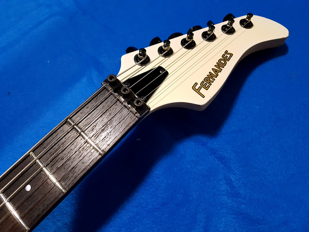 Отличный японский суперстрат начала 90-ых .Корпус выполнен из, редко применяемого для этих целей, клёна, но особой, менее твёрдой породы. По звучанию можно сравнить, как нечто среднее между ольхой и красным деревом. Звучит очень плотно и упруго, доминирует "середина", плюс очень читаемые верха, вследствие чего очень чёткая и ясная атака на хай-гейне, собственно , поэтому модель и называется Revolver. Особо стоит отметить топовые фернандесовские звукосниматели установленные на этой гитаре, очень хорошие, звук не мылят, выхлоп высокий, имеют хороший частотный баланс, прекрасны на хайгейне, не хуже Сеймуров. Плюс ещё оригинальности этому инструменту даёт, редкая комбинация звукоснимателей – 3 хамбакера, что позволяет получить множество оттенков, особенно интересеный звук на перегрузе со средним звукоснимателем. Мини хамбакеры имеют 4-х проводную разводку, т.е. есть возможность сделать отсечку.
