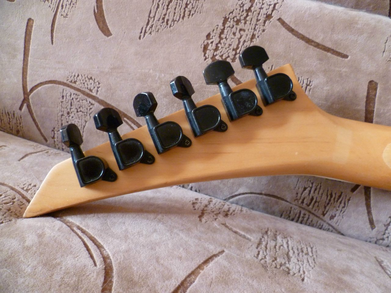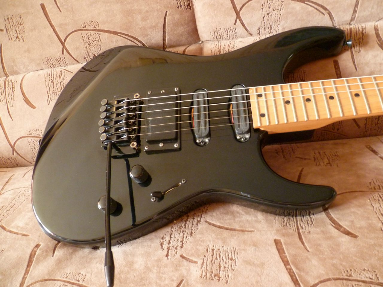 Японец предположительно 88 года. Дека - ольха, гриф - клён клён. Минихамбы Fernandes VH-7, хамб - какой-то Gotoh. На ручке тона пущ-пулл переключатель отсечки на минихамбах. Тремоло Fernandes FRT-8 модифицировано под более другой рычаг от ибанеза, в результате чего утратило свой последний единственный недостаток. Новые опоры и новые струны D'Addario 9-46 в стандартном строе. Лады в идеале. Перешлю по РФ, опыт имеется.
