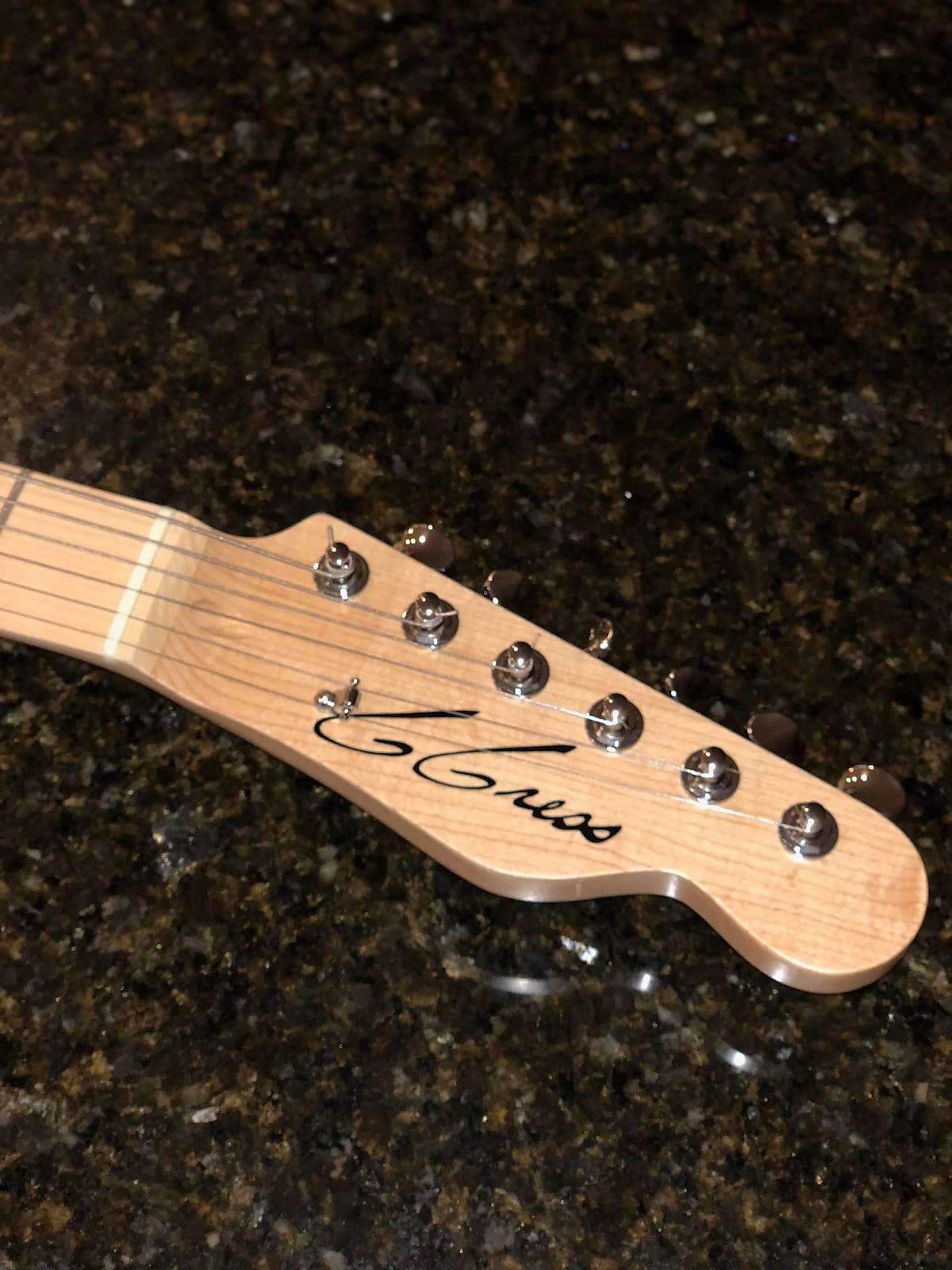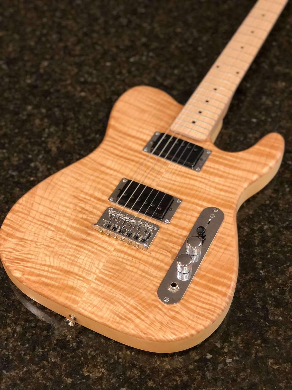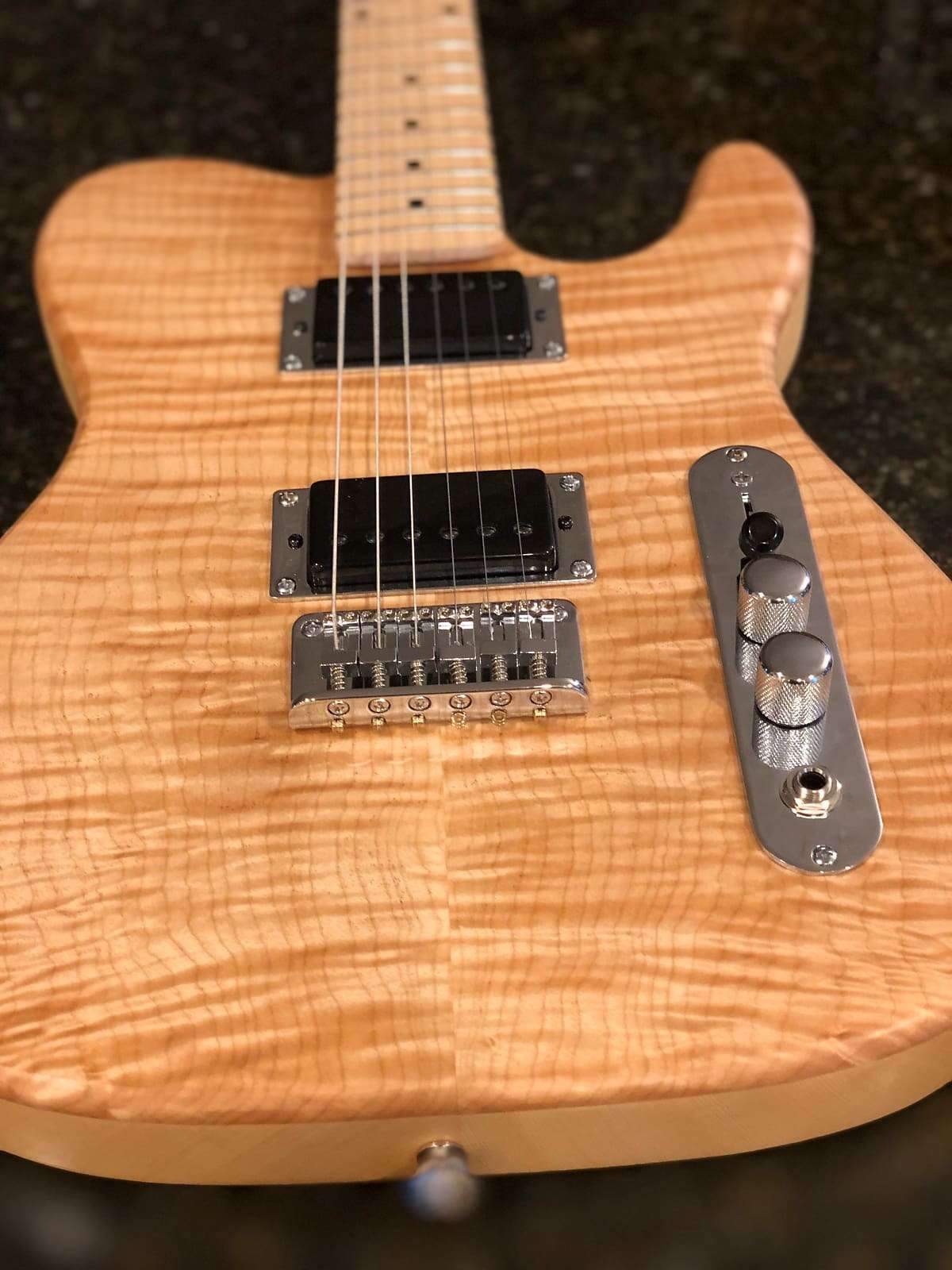 "Bookmatched Big Leaf flame maple from the Olympic Peninsula on top of a fine solid and resonant yellow cedar body, all handmade in my Alaska riverside woodshop all together make this a Northwest Coast keeper. Matched with a Canadian maple neck (16” radius and a beefy, comfortable modern C profile), it has a clean, classy look with loads of chatoyance. Gotoh tuners, Fender American Standard string tree, and fully adjustable Golden Age top loading bridge make for accurate and dependable tuning and intonation. Powerful sound comes from the Alnico 5 humbuckers (9.8k in the neck and 14.6k bridge) fed through 500k alpha pots with a treble bleed (for cleaner roll off with no loss of tone) into a quality Switchcraft output jack. 7.6 pounds for a comfortable balance that lets you know there is substance there. As with all my work, done mostly with hand tools, it’s not intended to be factory perfect or a CNC copy, merely a fine playing heritage instrument."