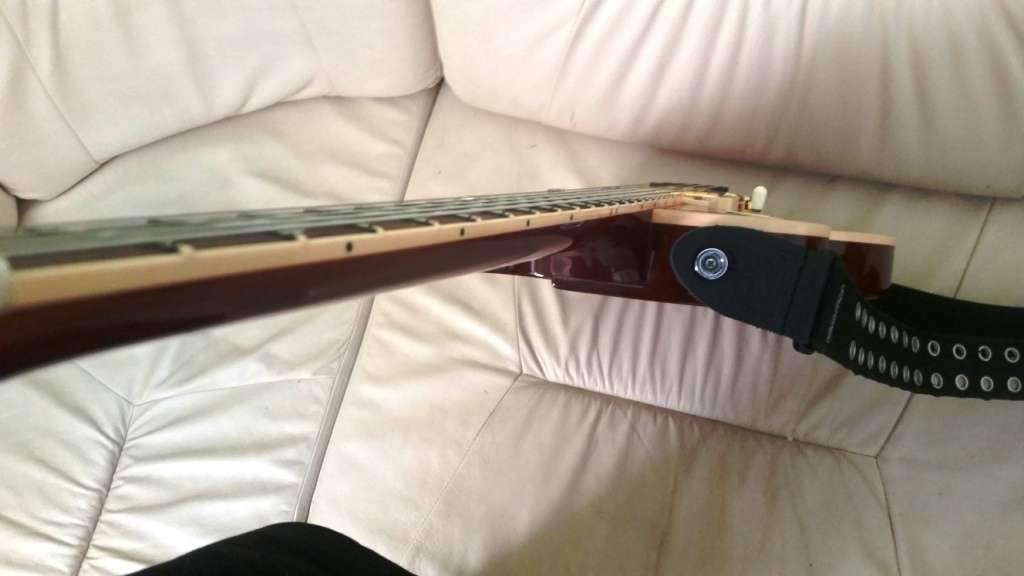 Thin single-cut solidbody, carved top, green leaf on truss-rod cover, dot inlays