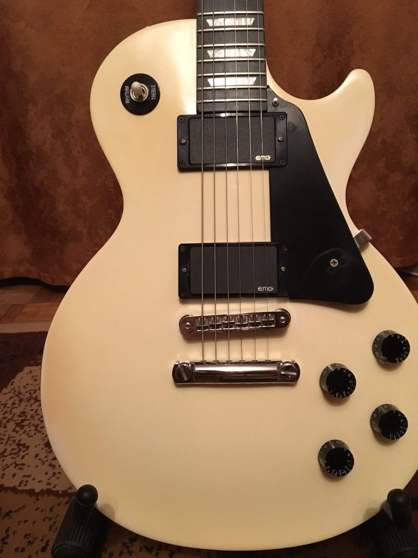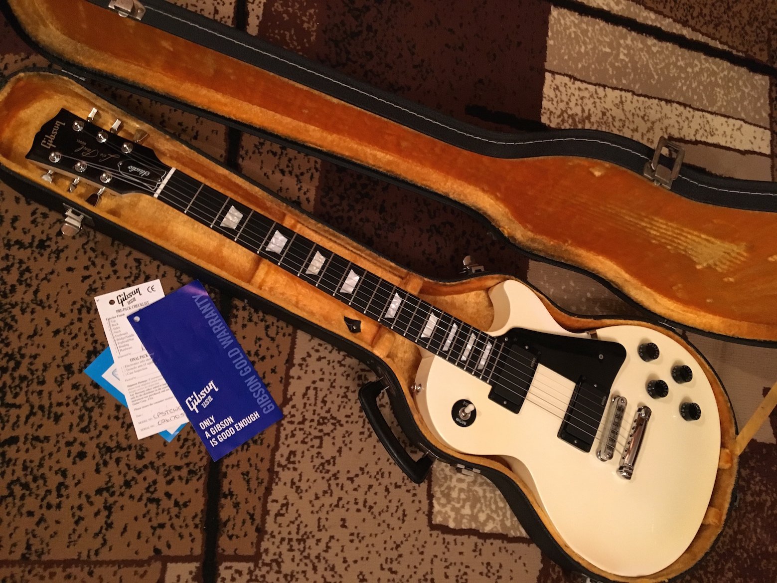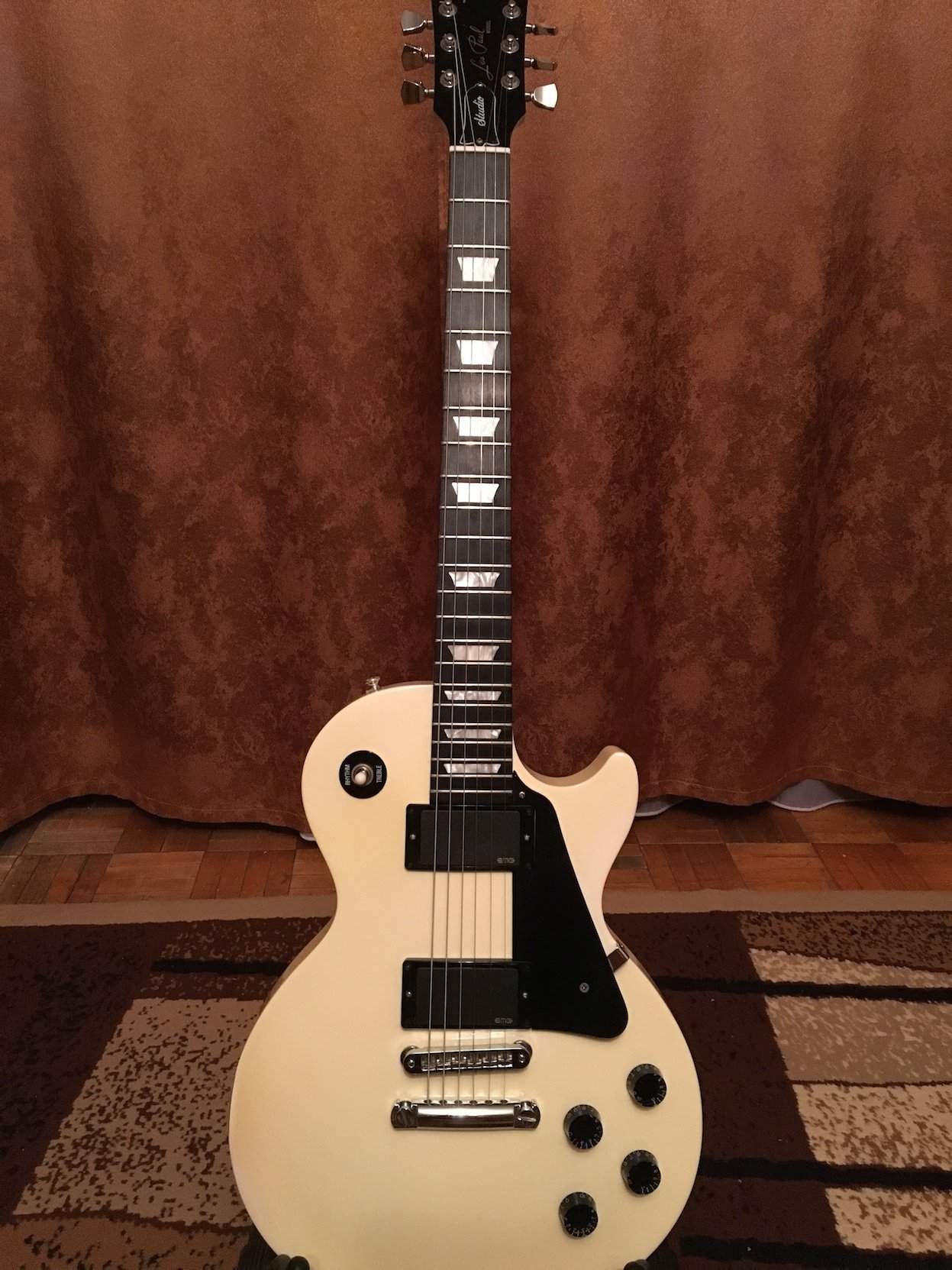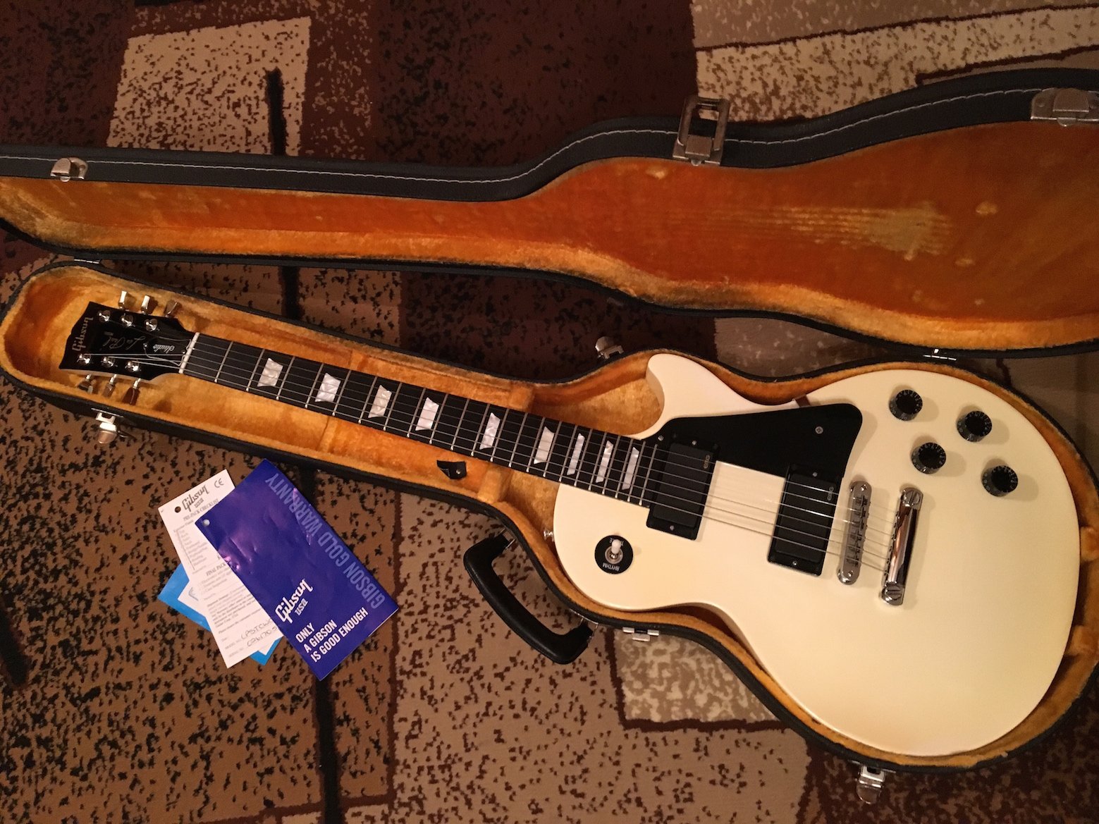 Продам классный Gibson Les Paul Studio Alpine White 2007г. В линейке Студио эта модель достаточно редкая и недешёвая. Корпус - красное дерево с кленовым топом, гриф - красное дерево, профиль грифа - Slim Taper, накладка - чёрное дерево. Гитара в отличном рабочем состоянии, косметика на 4+, есть потёртости на тыльной стороне грифа, сам гриф, лады, анкер, колки, электроника - всё в идеальном состоянии. Ещё одно отличие этой модели от остальных моделей Studio - очень тонкое покрытие нитрой, что очень положительно сказывается на звуке. Цвет белый, но не яркий, скорее кремовый винтаж со сливочным оттенком, в сочетании с чёрными элементами обвеса смотрится шикарно. Сделаны правильные апгрейты: