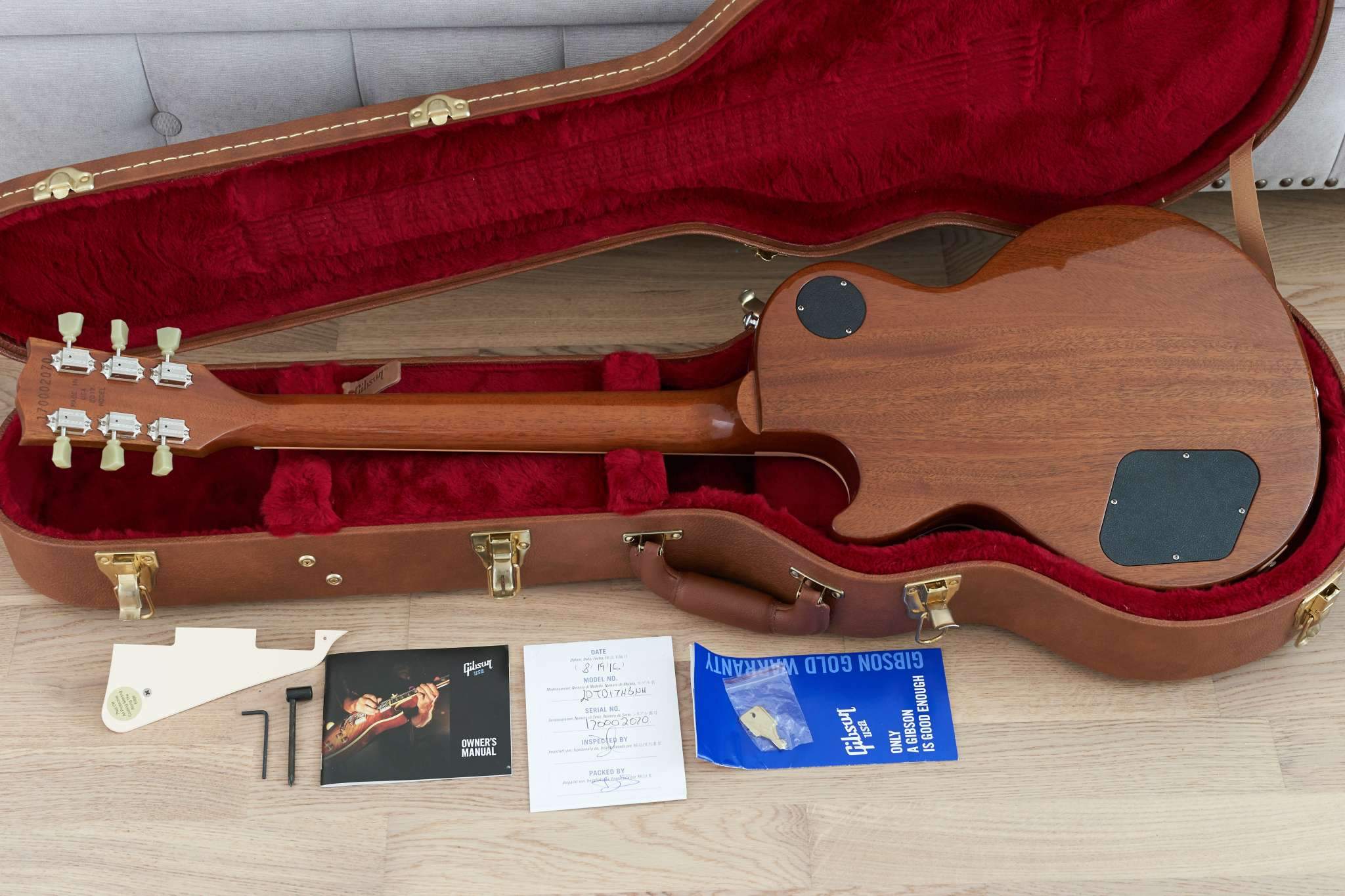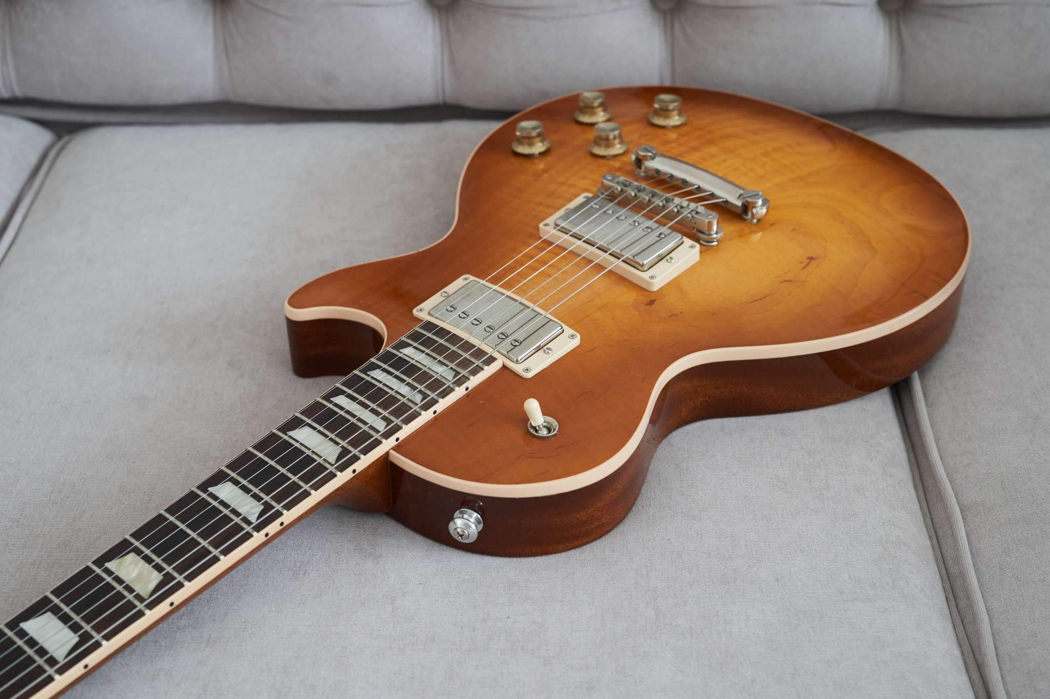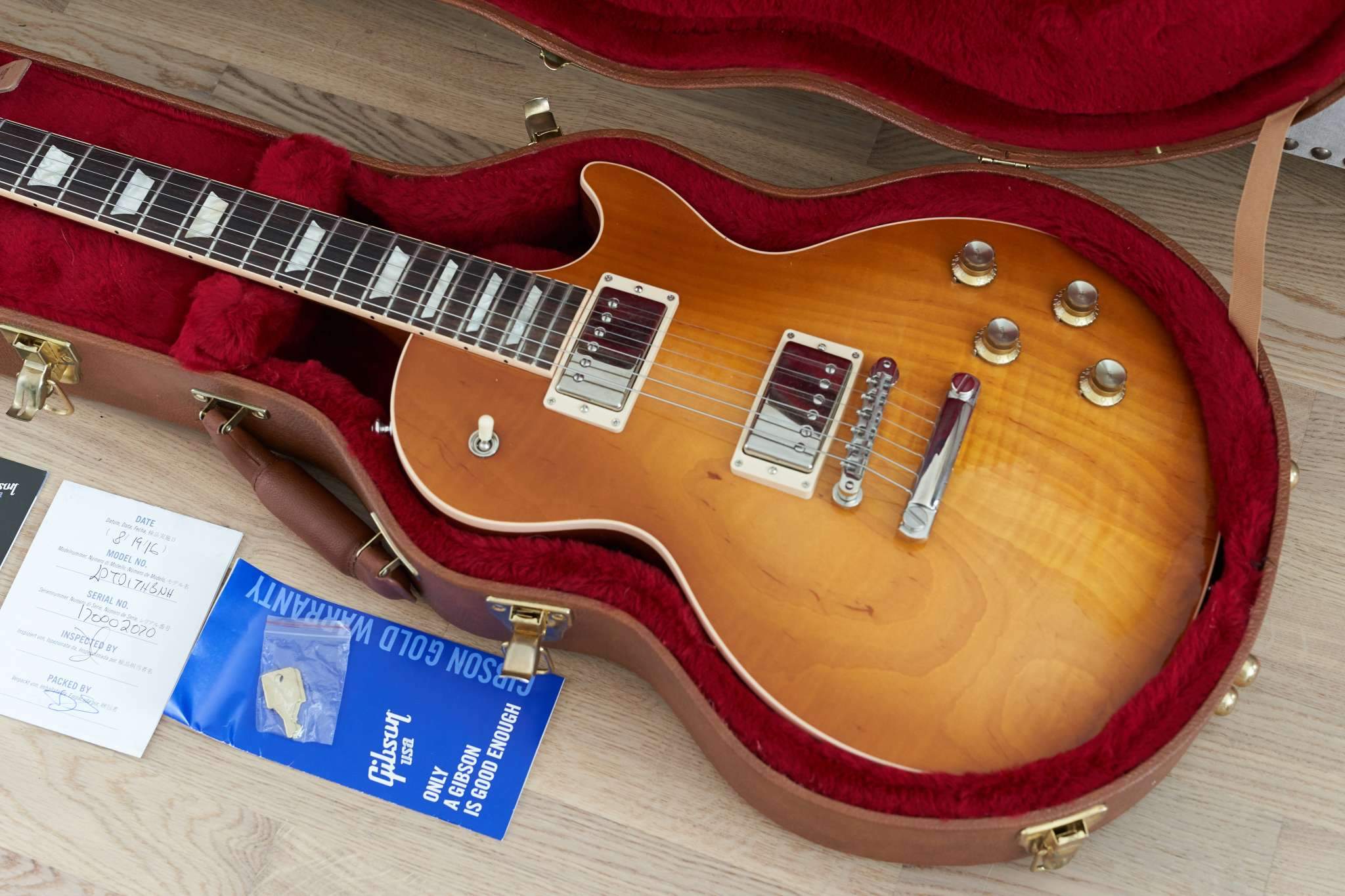 Красивейший, аутентичный топ: Antique Burst AA (именно такие были на первых оригинальных Les Paul 58, 59, 60-х годов - это сейчас пошла гонка за флеймами). Это очень удачный год для Les Paul Traditional - Gibson постарались воссоздать максимально правильный инструмент. Отсутствие полостей, звукосниматели Burstbucker 1 и 2, 59-й профиль грифа. Аутентичное, крутое "пейджевское" звучание. Полный комплект документов. Все оригинальное. Сделан для американского рынка, куплен в штатах через Валеру Guitaristforever.