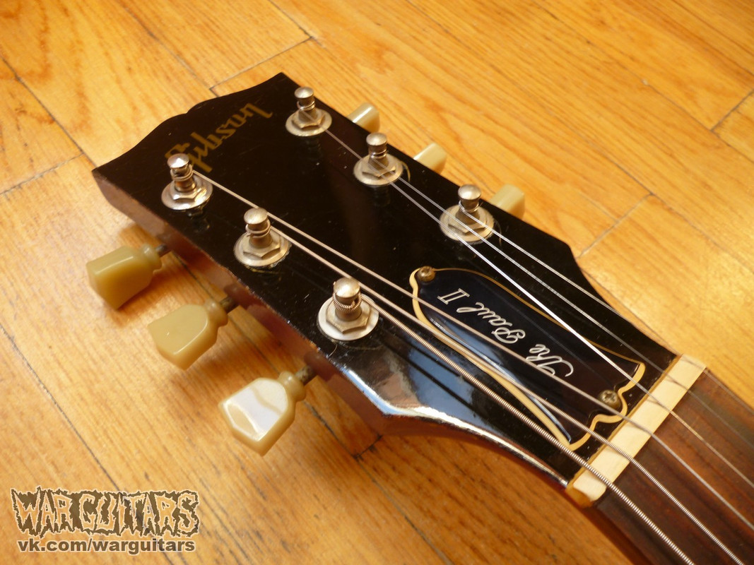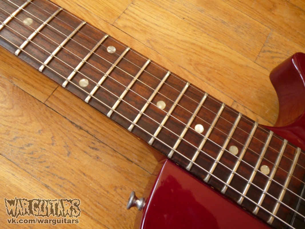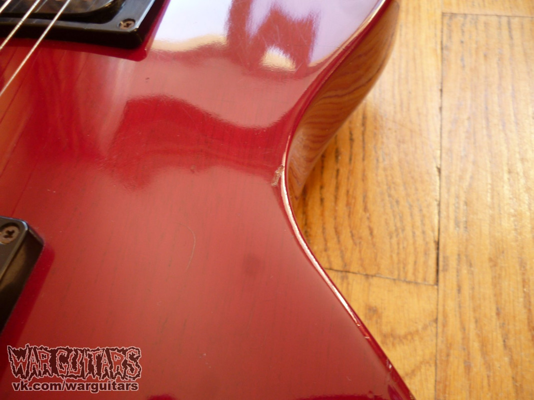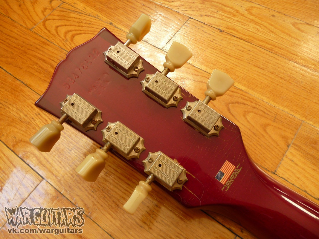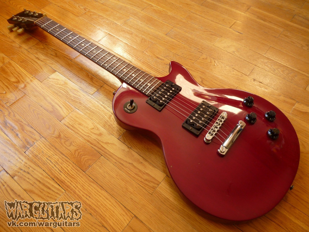 Редкий гибсач из правильных 90-х годов. Очень интересная модель, некая предтеча Les Paul Special (тоже тонкий корпус, 2/3 толщины обычного леспола), только в отличии от него еще с арчтопом, нитрой на корпусе и в клевой прозрачной расцветке Wine Red. Производилась модель с 96 до 98 (или даже по 97, если верить некоторым источникам), это первый год выпуска, с понтовым американским флажочком сзади бошки. По звуку это что-то среднее между лесполом и СГ - похоже, что засчет более тонкой деки и отсутствия кленового топа звукан более хлесткий и хулиганский. Состояние для своих лет и для гибсоновского покрытия огонь: всего пара мелких вмятинок там-сям, ровный гриф, лады с большим запасом и без ямок, электроника фурычит, выглядит все тоже круто. Отличный редкий леспол на замену немного банальным студио =)