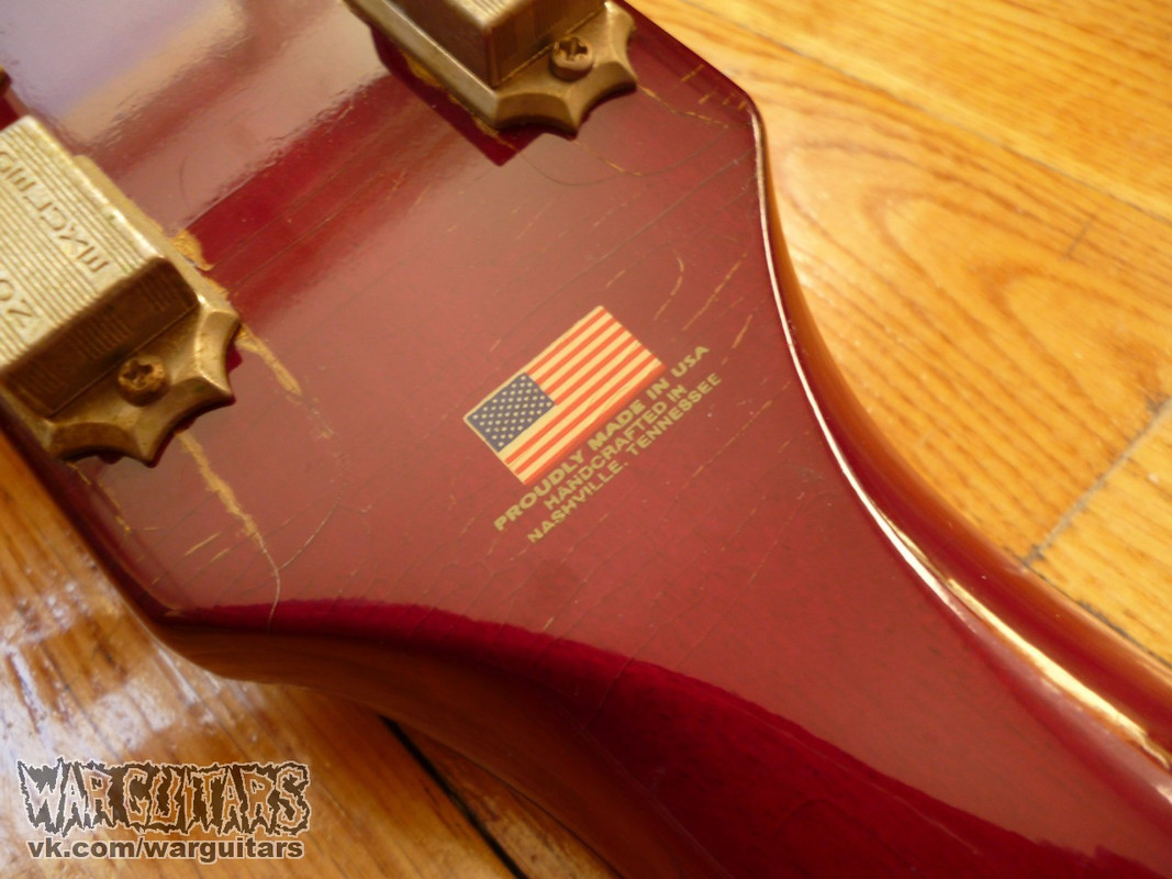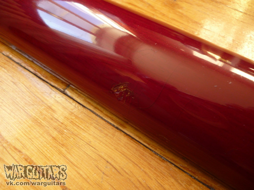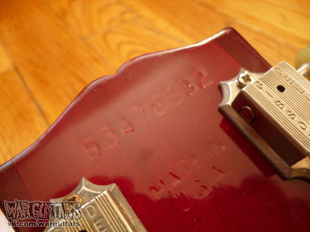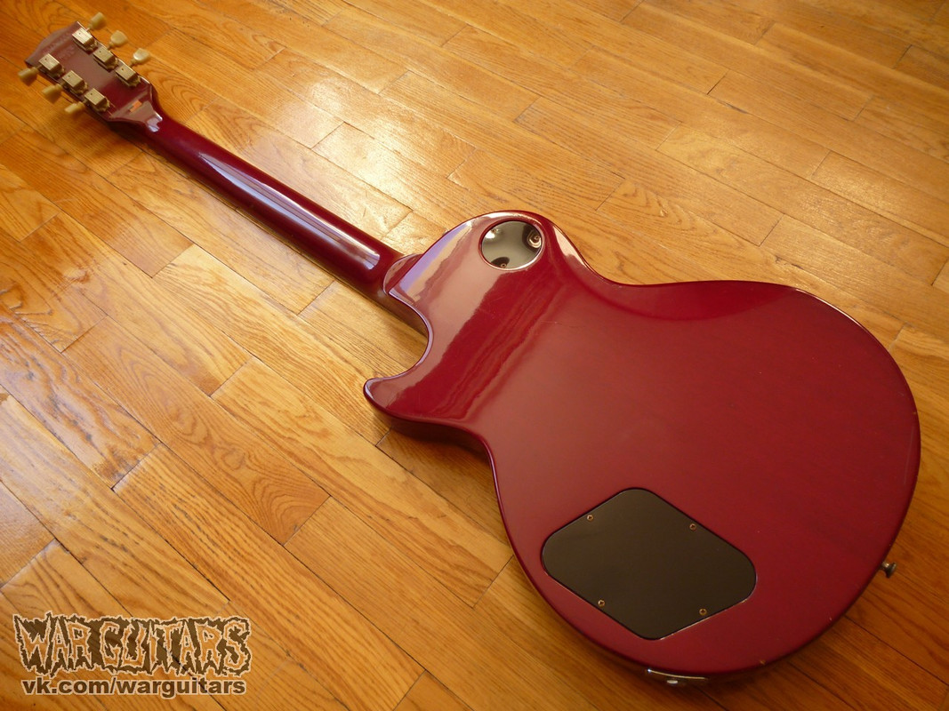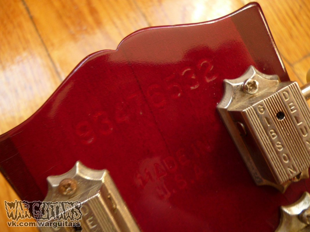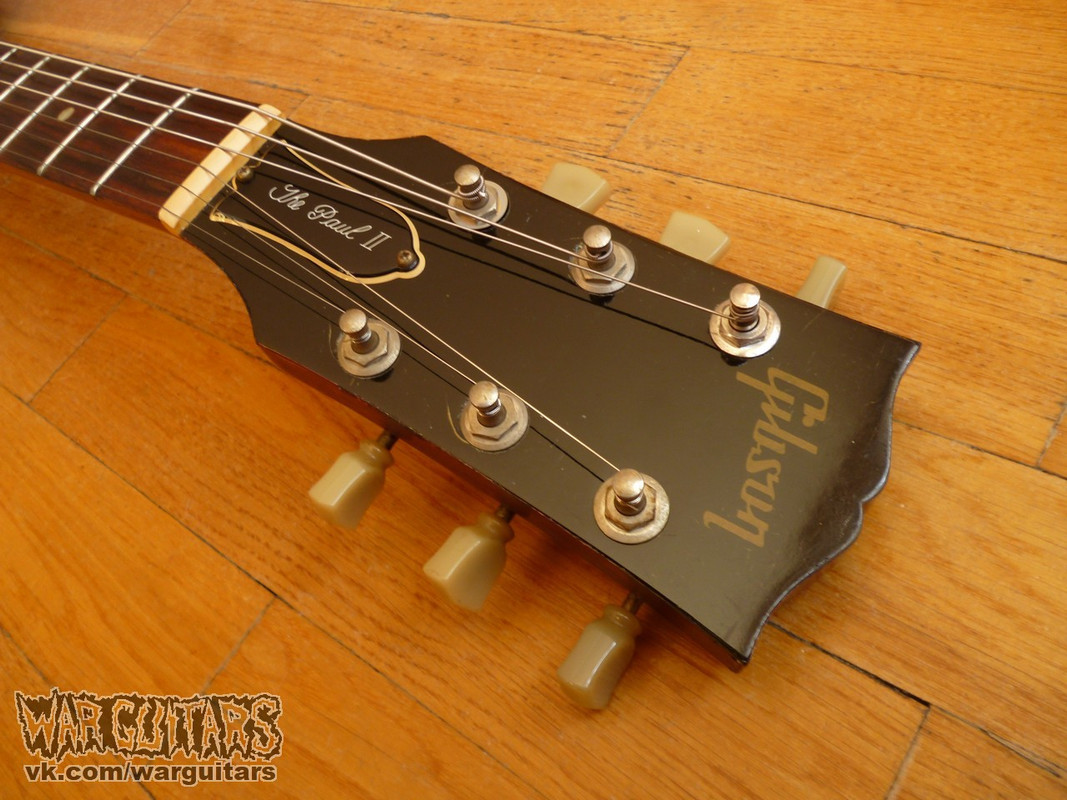 Редкий гибсач из правильных 90-х годов. Очень интересная модель, некая предтеча Les Paul Special (тоже тонкий корпус, 2/3 толщины обычного леспола), только в отличии от него еще с арчтопом, нитрой на корпусе и в клевой прозрачной расцветке Wine Red. Производилась модель с 96 до 98 (или даже по 97, если верить некоторым источникам), это первый год выпуска, с понтовым американским флажочком сзади бошки. По звуку это что-то среднее между лесполом и СГ - похоже, что засчет более тонкой деки и отсутствия кленового топа звукан более хлесткий и хулиганский. Состояние для своих лет и для гибсоновского покрытия огонь: всего пара мелких вмятинок там-сям, ровный гриф, лады с большим запасом и без ямок, электроника фурычит, выглядит все тоже круто. Отличный редкий леспол на замену немного банальным студио =)