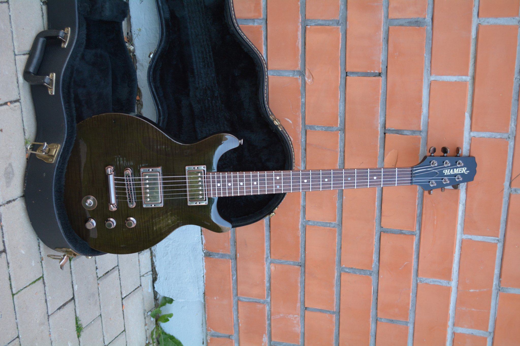 Весьма интересный Hamer double cut, уровня Gibson Les Paul Classic / Standard ,удобный и достаточно мощный за счет датчиков Gibson (Alnico 5). Играть одно удовольствие, струны можно опустить экстремально низко, всё звучит !