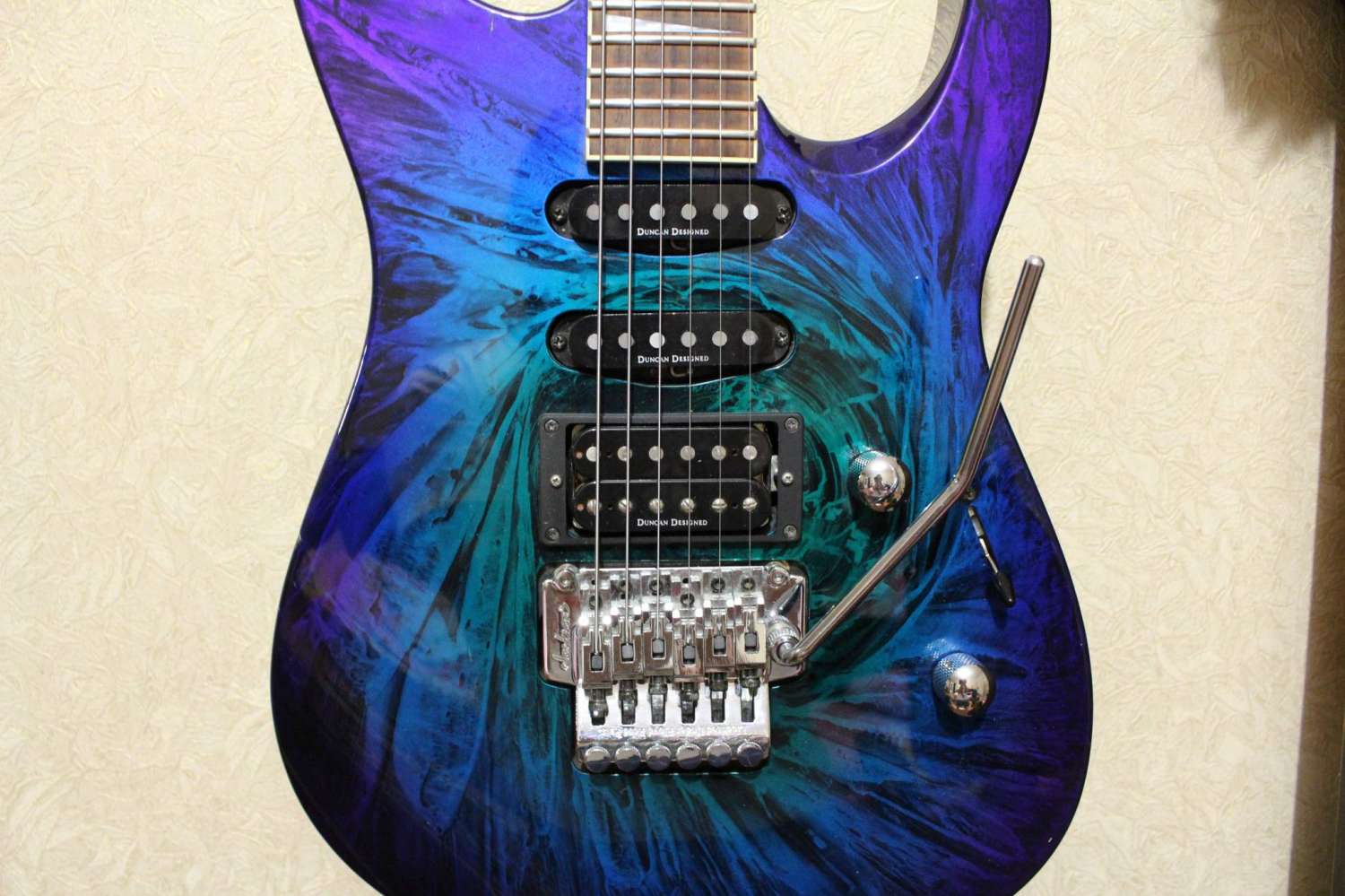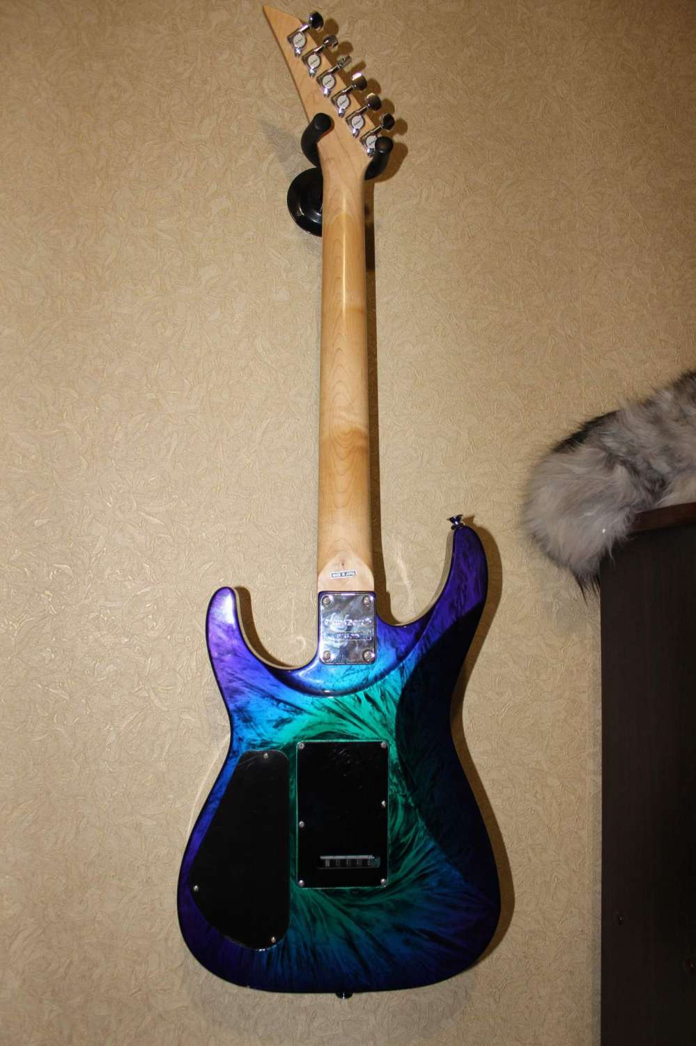 Jackson DK2 EDS 2007 Япония. Дека ольха (дает плотный густой рык на перегрузе, наряду с плотностью имеет яркий разнообразный звук), гриф клен на болтах, накладка палисандр, 24 лада, Флойд родной - Jackson (практически не пользовался, ножи целые), колки Jackson (претензий тоже нет), звукосниматели Duncan Designed, H-S-S (нековый сингл стал находкой, когда от бескомпромиссного рыка одним щелчком гитара начинает петь подобно стратокастеру, особенно на чистом звуке) Кейс Deluxe Molded (в стоимость входит).
