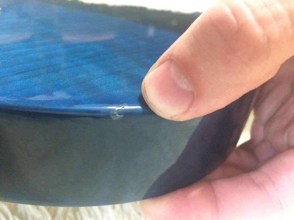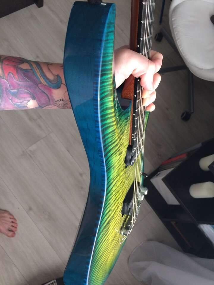 По лкп два крайне незначительных недочета - микро скол лака на задней стороне ( дерево не повреждено ) , а также микроцарапка в месте крепления грифа. Все это видно на фото.