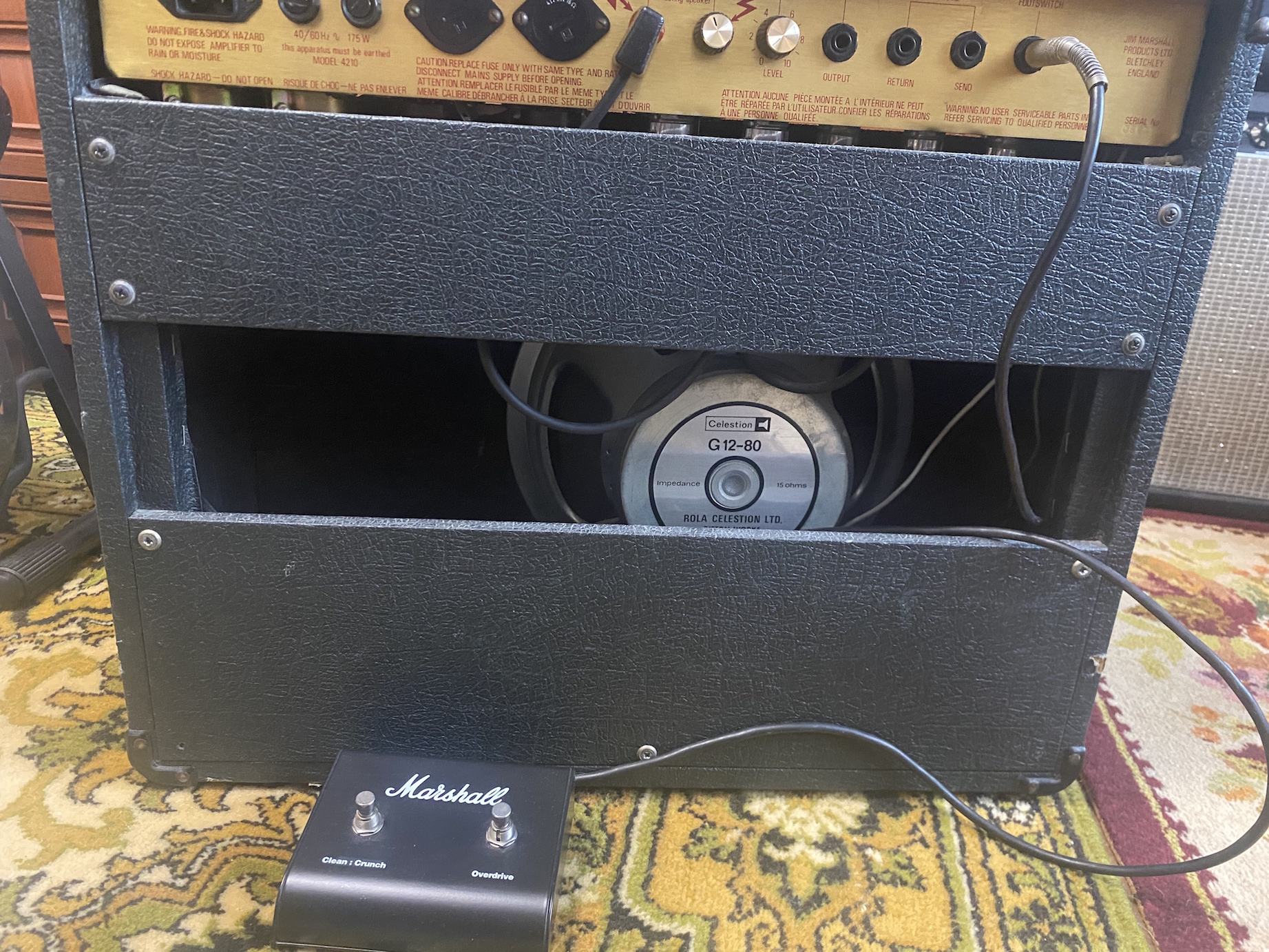 Продам очень классный, редкий, винтажный комбоусилитель Marshall JCM800 Combo 4210 (2205), Англия, 1983 год, 50Вт, ревербератор, Мастер громкость. Привезён из Америки в 2008 году. Со временем замечательным мастером AZG были сделаны правильные моды: в канале перегруза диодный мост заменён на тру-ламповый перегруз, добавлен Presens, вынесен на заднюю панель. В преде установлены новые лампы ECC83 Tesla JJ, в оконечнике - винтажные Tesla EL34, Чехословакия, 70-е гг. Звук - бомба! Чистый - красивый, глубокий и упругий, кранч - колкий, хрустящий, дерзкий, драйв - зверюга, не дающий выпускать гитару из рук. Шикарный ревер, чёткий и прозрачный, без уханья и гула. Видосов в сети много, выкладываю не своё, но характер звука понятен. В комплекте футсвич. Цена - 130000руб.
