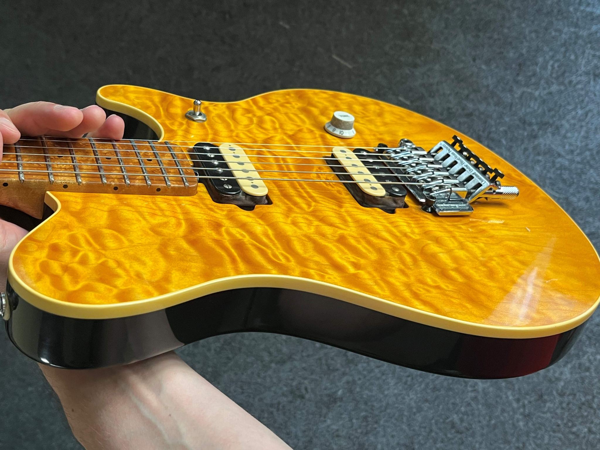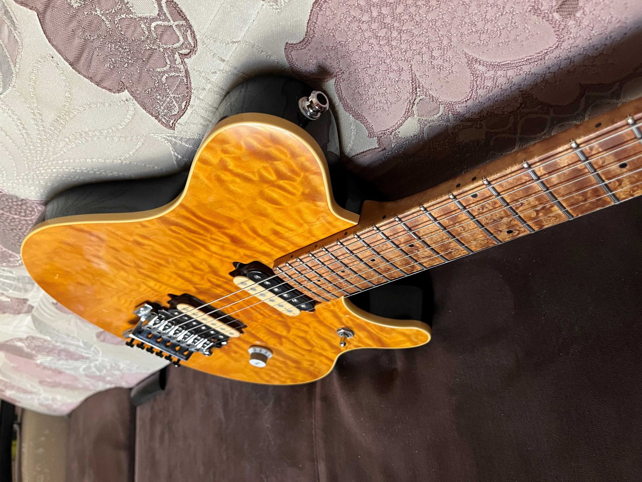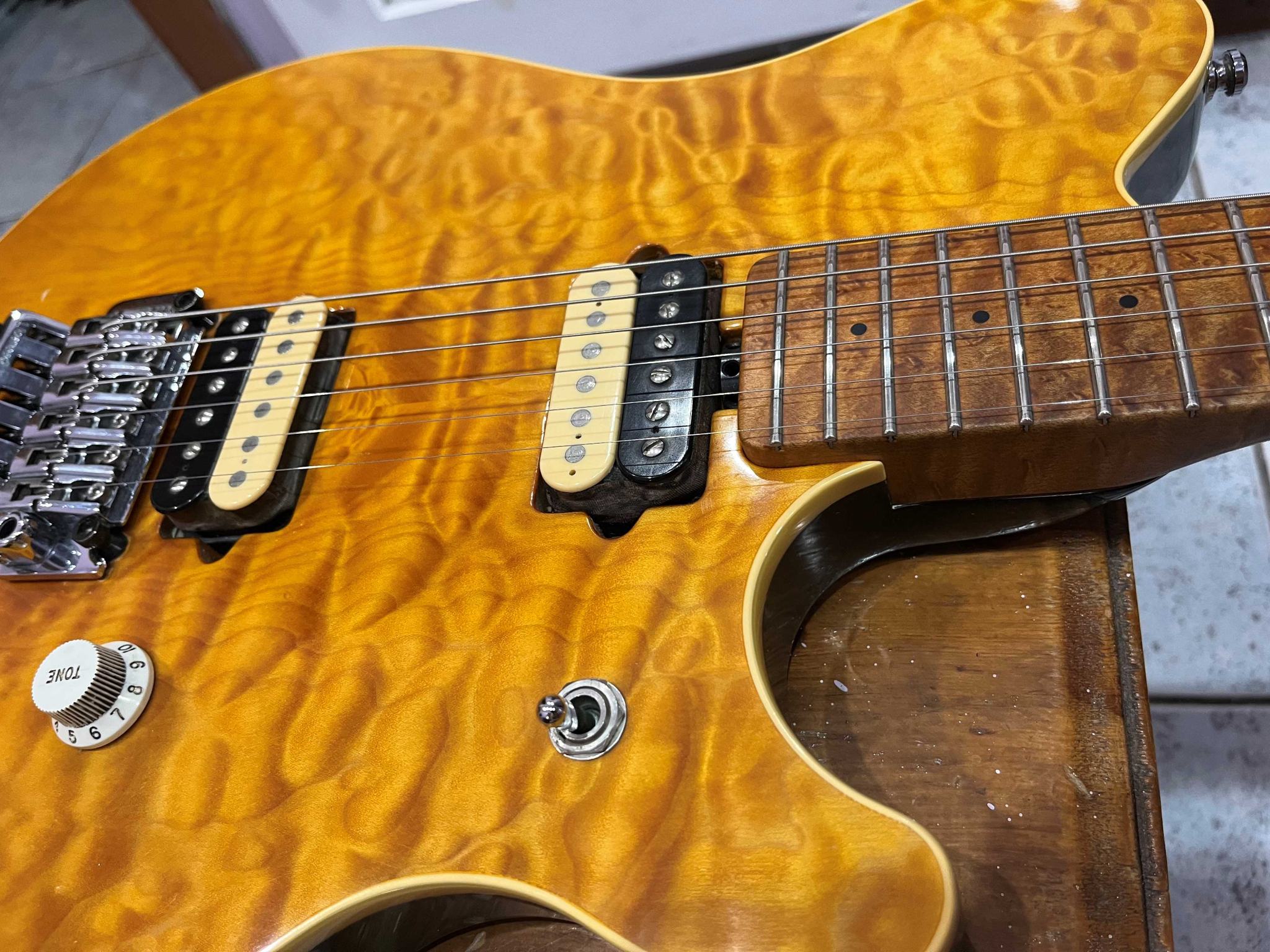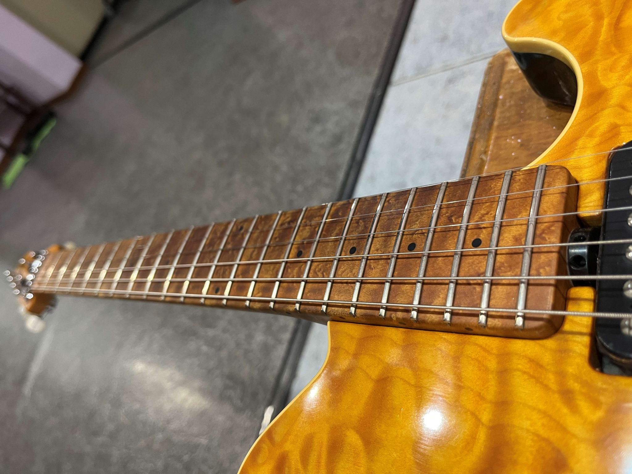 Корпус - липа с кленовым топом, гриф - клен птичий глаз с такой же накладкой (топ и гриф очень красивые, вообще это сочетание дерева любимое у Джона Сура по его признанию).
