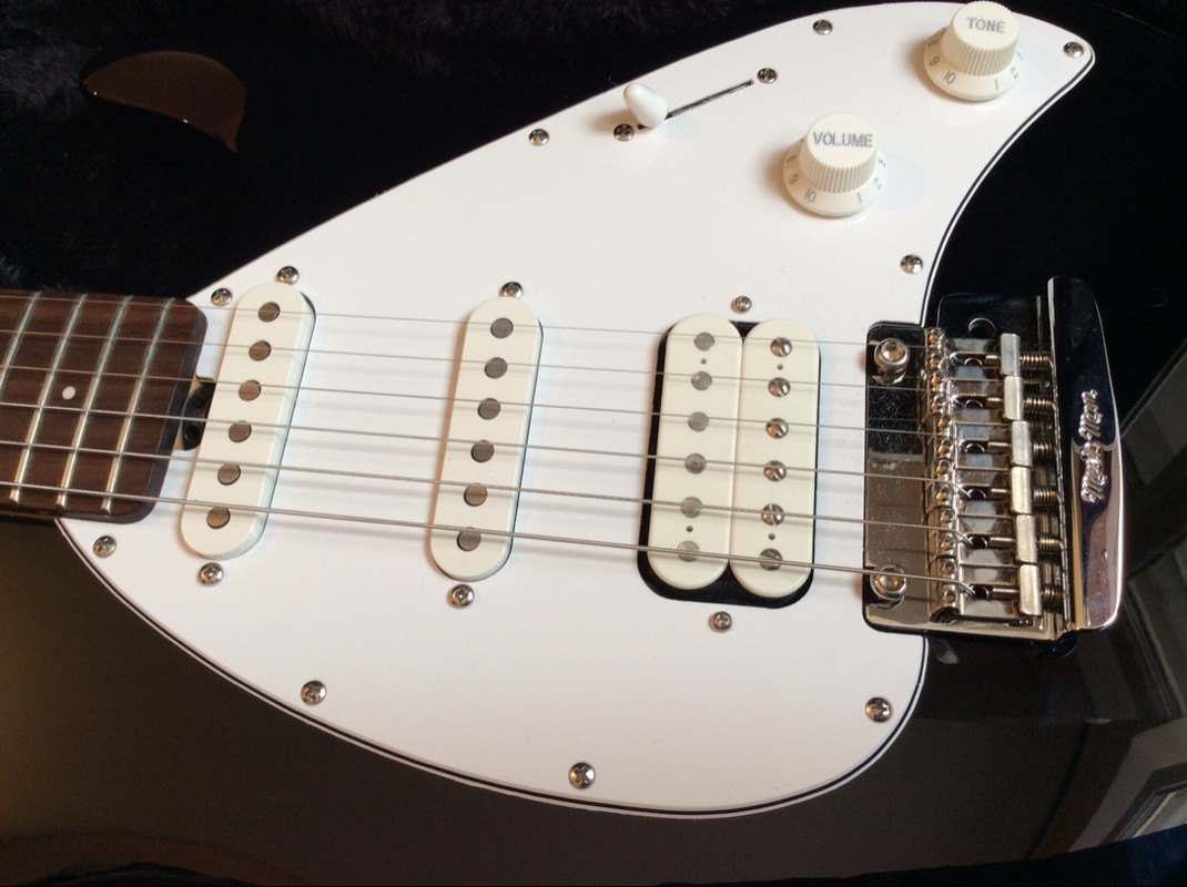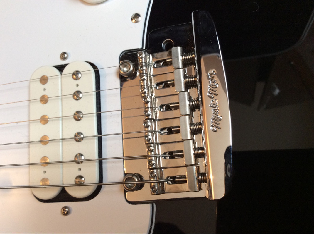 Music Man® vintage tremolo of chrome plated, hardened steel with bent steel saddles