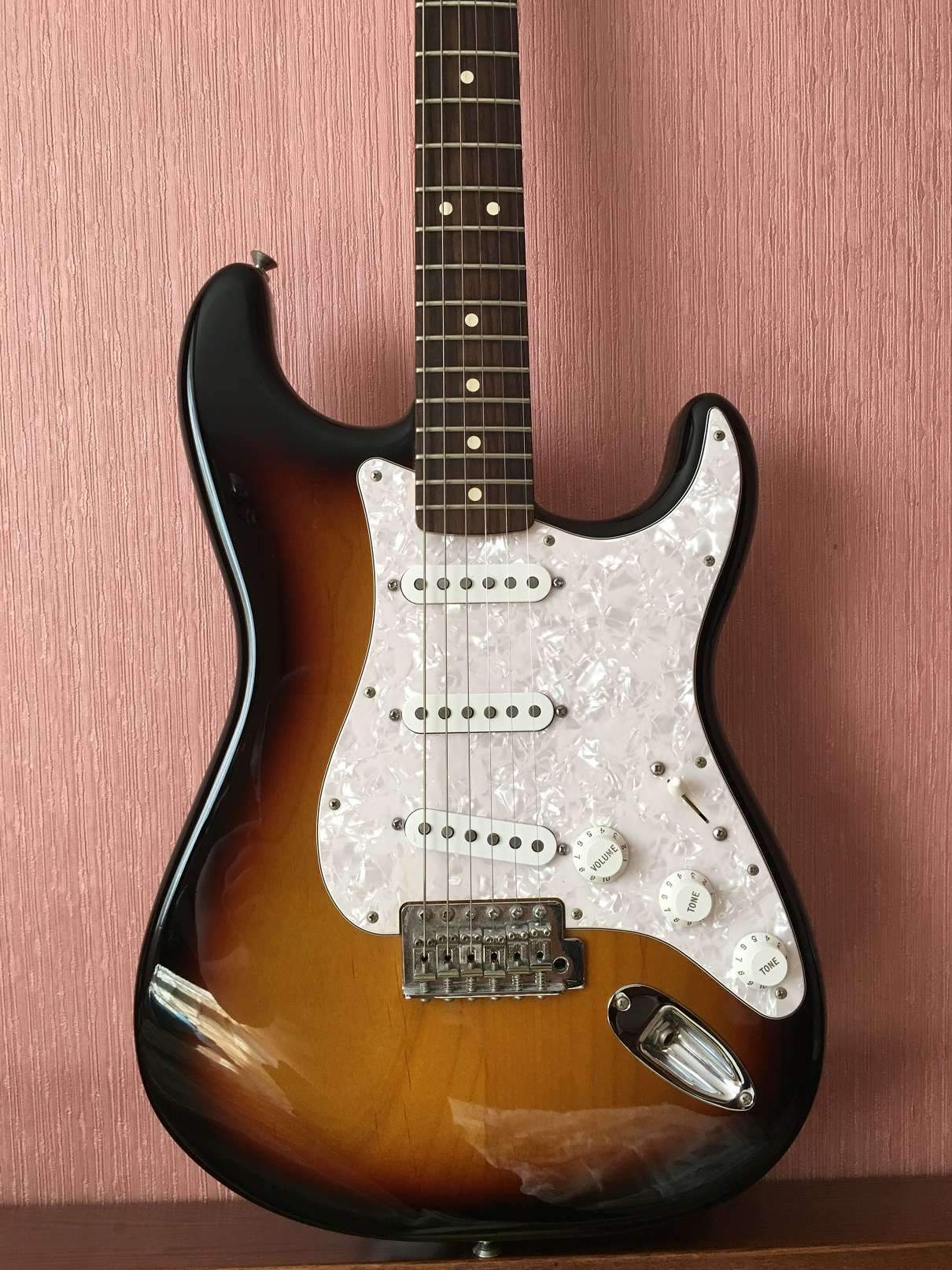 Ольха, клен, палисандр, 21 лад, 3 tone Sunburst. Нестареющая классика. 2013 год. Покупался новым в конце 2013 года. Фурнитура вся родная. Установлен кастомный пикгард с датчиками Fender Custom Shop FAT 50s, родной пикгард с неснятой пленкой также имеется (см. фото). Ключи и рычаг имеются. Отшлифованы лады. Гитара из дома не выходила, хранилась в чехле. Последние полгода лежит без дела.