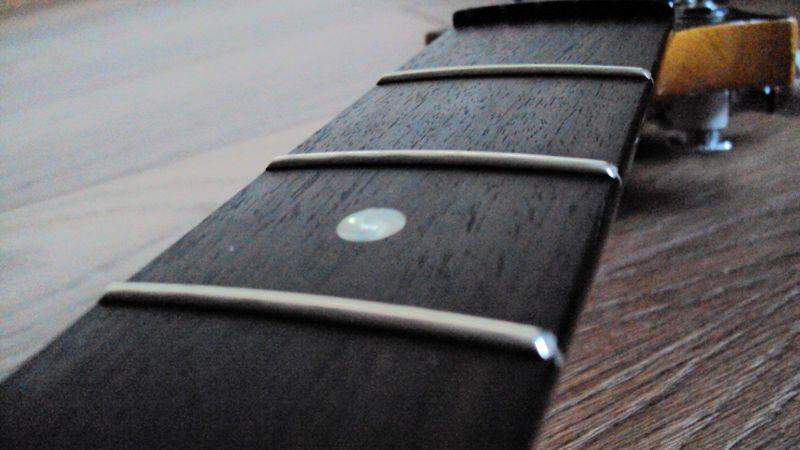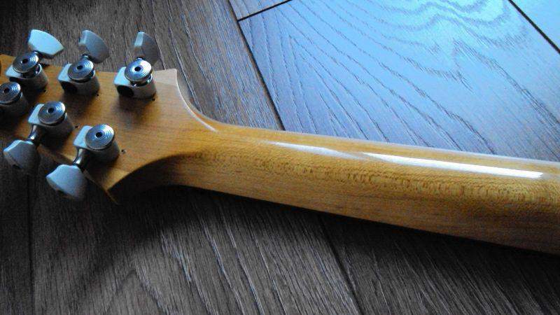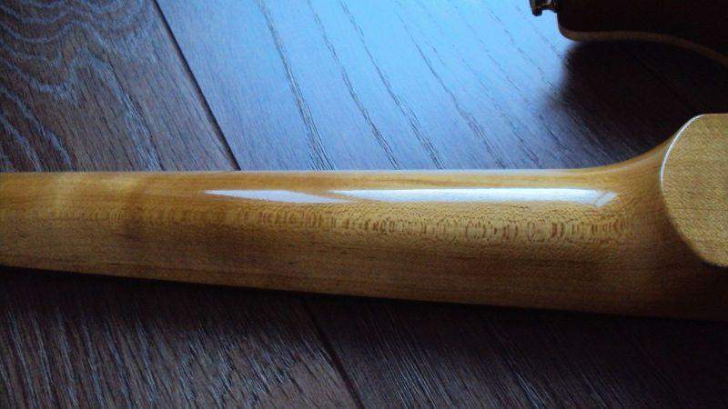 Косметическое состояние гитары оцениваю примерно на 8/10. Кое-где немного отслаивается лак и есть небольшие царапины. Лады в нормальном состоянии, лак на грифе не стерт, вмятин на нем тоже нет.