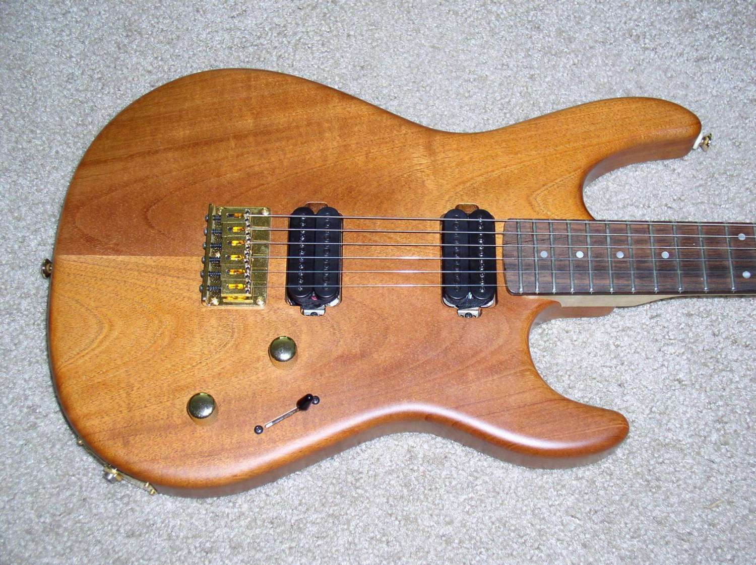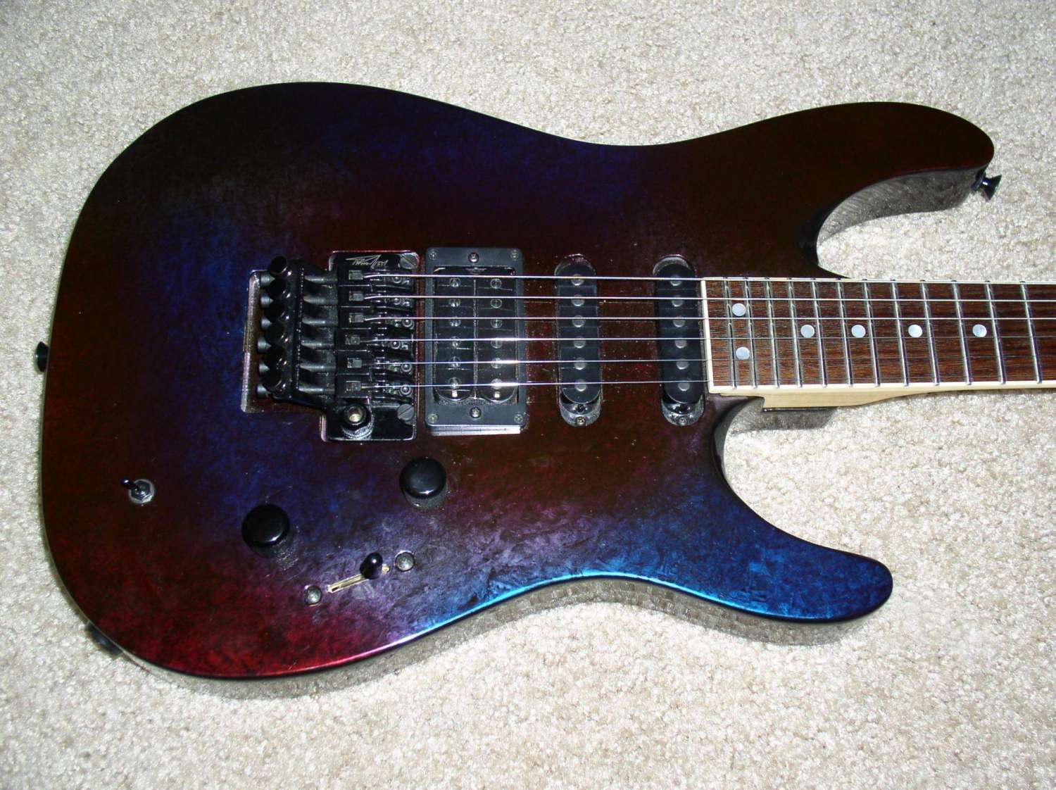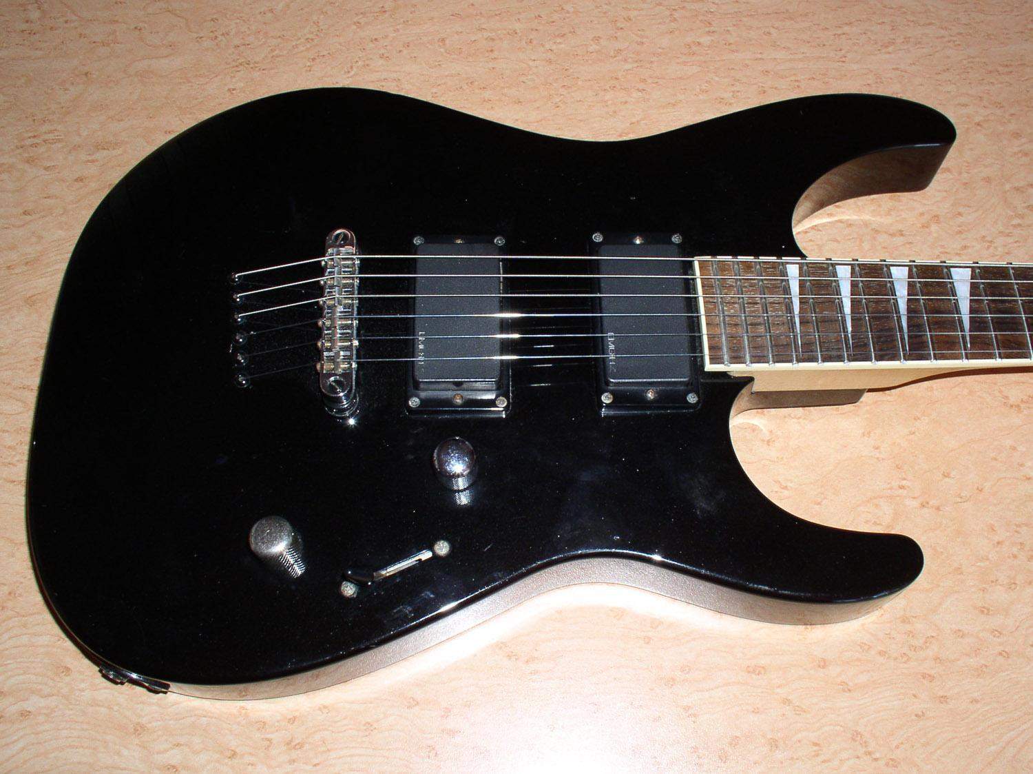 Peavey Limited HB Custom Shop (USA) $800 Очень универсальный американский суперстрат 91 года сделанный в Ликсвил, Миссисипи, США. Ольховый корпус с кленовым АААА топом. Вощеный кленовый гриф с палисандровой накладкой с радиусом 12". 22 лада, лады в хорошем состоянии. Мензура: 25,5". Крепление грифа на пяти болтах. Пятка очень грамотно выполнена, так что очень комфортно играть близко к нековому датчику. Анкер работает. Хотя анкерная "гайка" и страшновато выглядит, но это очень грамотное решение. В 100500 практичнее, чем шестигранники или отвертки. Головка грифа параллельно корпусу, как на фендерах, но без ретейнеров! Локовые колки Grover 18:1, врезаны в дерево на разную глубину, это видно на фото. Бридж Peavey Hipshot Ultra Glide Tremolo System. Эта машинка может работать как двусторонняя, но изначально спроектирована "лежать" на деке для увеличения сустейна. Звукосниматели оригинальные хамбакеры Peavey, зебра 11.4 / 13.8 кОм. Общая громкость, общий тон, пяти позиционный переключатель без пулпушей (нэк, дальние катушки, бридж+нэковая дальняя катушка, ближние катушки, бридж). Очень универсальный инструмент! Певучий нэк, злобный бридж! Гитара звучит и у как телик и как страт!