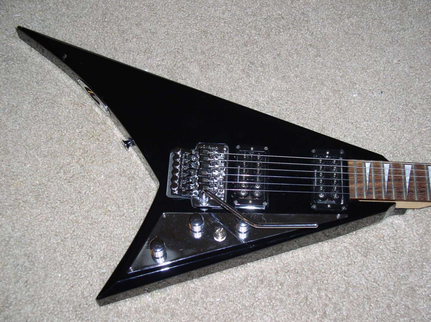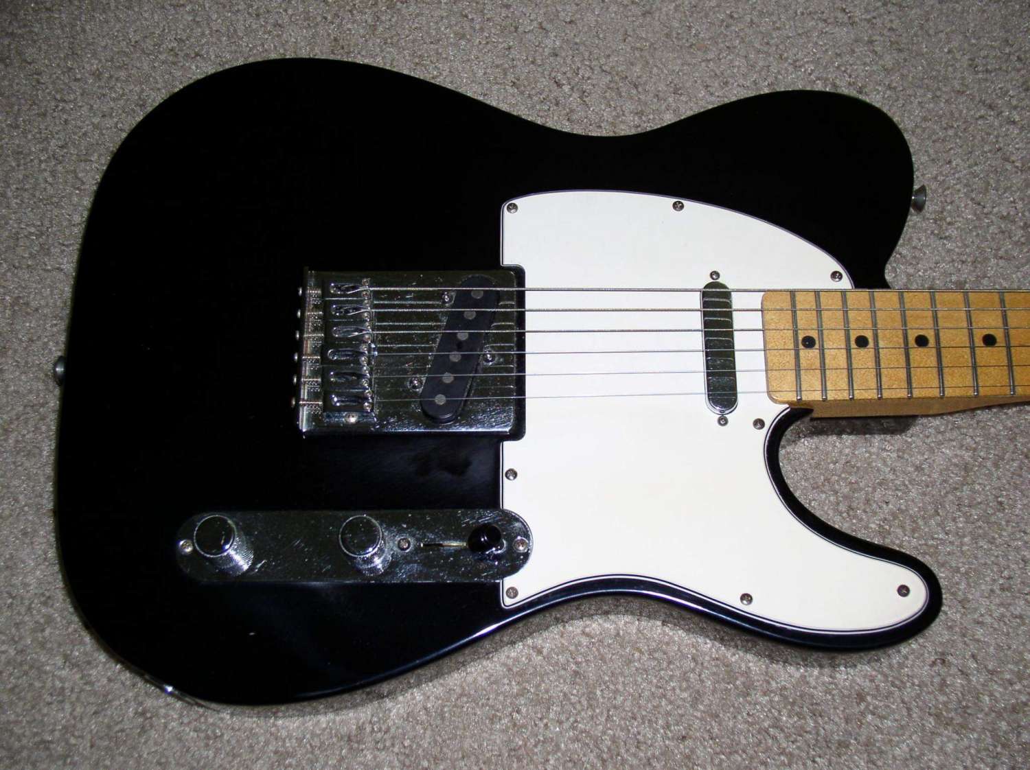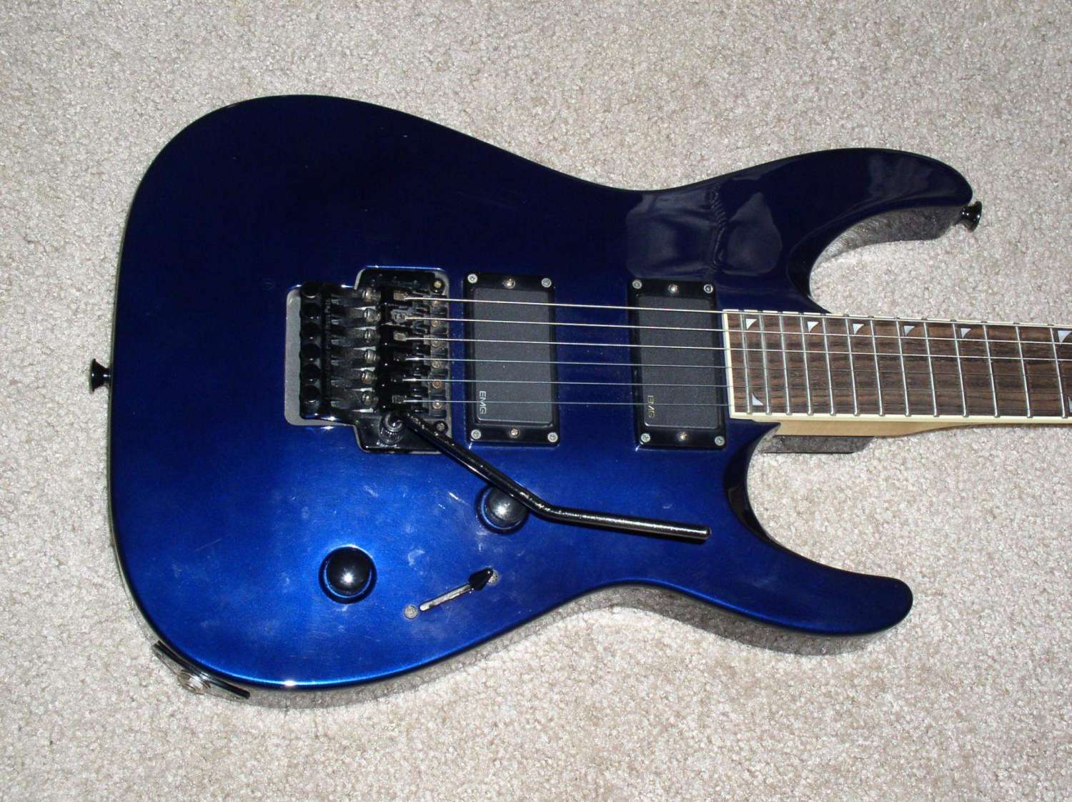 Peavey Limited HB Custom Shop (USA) $800 Очень универсальный американский суперстрат 91 года сделанный в Ликсвил, Миссисипи, США. Ольховый корпус с кленовым АААА топом. Вощеный кленовый гриф с палисандровой накладкой с радиусом 12". 22 лада, лады в хорошем состоянии. Мензура: 25,5". Крепление грифа на пяти болтах. Пятка очень грамотно выполнена, так что очень комфортно играть близко к нековому датчику. Анкер работает. Хотя анкерная "гайка" и страшновато выглядит, но это очень грамотное решение. В 100500 практичнее, чем шестигранники или отвертки. Головка грифа параллельно корпусу, как на фендерах, но без ретейнеров! Локовые колки Grover 18:1, врезаны в дерево на разную глубину, это видно на фото. Бридж Peavey Hipshot Ultra Glide Tremolo System. Эта машинка может работать как двусторонняя, но изначально спроектирована "лежать" на деке для увеличения сустейна. Звукосниматели оригинальные хамбакеры Peavey, зебра 11.4 / 13.8 кОм. Общая громкость, общий тон, пяти позиционный переключатель без пулпушей (нэк, дальние катушки, бридж+нэковая дальняя катушка, ближние катушки, бридж). Очень универсальный инструмент! Певучий нэк, злобный бридж! Гитара звучит и у как телик и как страт!