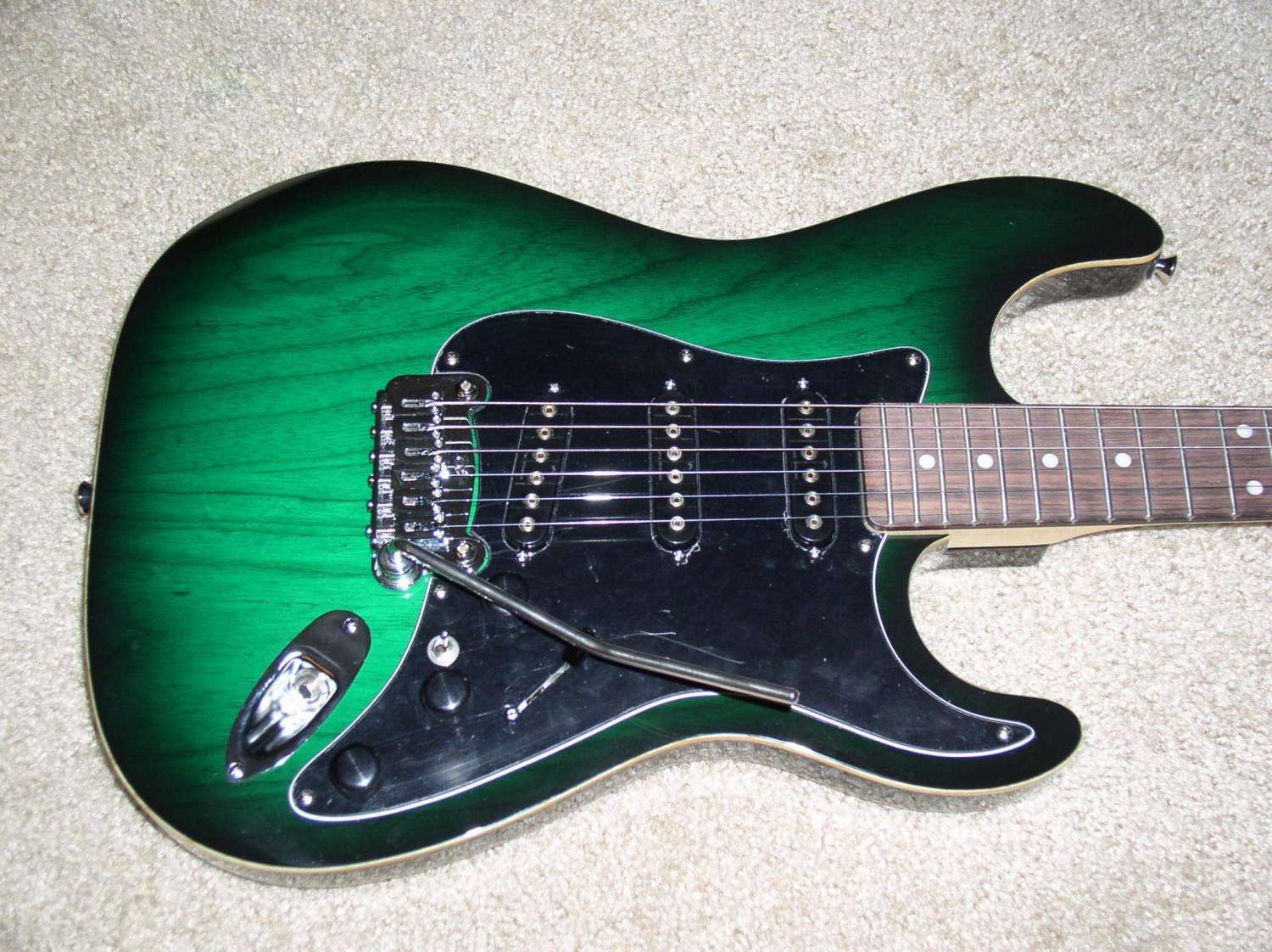пишите на почту gafad.gp@bk.ru в личке и в посте не отвечаю Peavey Limited ST Custom Shop (USA) $800 Шикарный суперстрат 91 года сделанный в Ликсвил, Миссисипи, США. Ясеневый корпус с кленовым АААА топом. Вощеный кленовый гриф с палисандровой накладкой с радиусом 12". Лады Jambo, 22шт в хорошем состоянии. Мензура: 25,5". Крепление грифа на пяти болтах. Пятка очень грамотно выполнена, так что очень комфортно играть в вернем регистре. Анкер работает. Хотя анкерное колесико и страшновато выглядит, но это очень грамотное решение. В 100500 практичнее, чем шестигранники или отвертки. Головка грифа выполнена параллельно корпусу, как на фендерах, но без ретейнеров! Локовые колки Grover 18:1, врезаны в дерево на разную глубину, это видно на фото. Бридж Peavey Hipshot Ultra Glide Tremolo System. Эта машинка может работать как двусторонняя, но изначально спроектирована чтобы "лежать" на деке для увеличения сустейна. Звукосниматели оригинальные Peavey. Общая громкость, общий тон, пяти позиционный переключатель без пулпушей (нэк, нэк + мидл, мидл, мидл + бриджевая дальняя катушка, бридж).