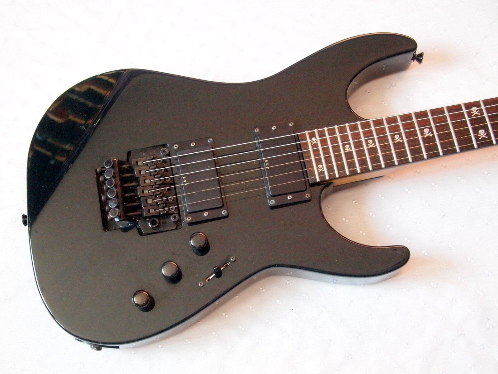 Модель имени Kirk Hammett из поистине народной группы Metallica,произведенная на фабрике ESP. Радикально черный цвет, черепа на накладке, 24 лада, два хамбакера-стопроцентное соотношение звука и имиджа!!! Инструмент из самых первых годов выпуска, на некплейте еще надпись ESP, лого Produced by ESP на голове
