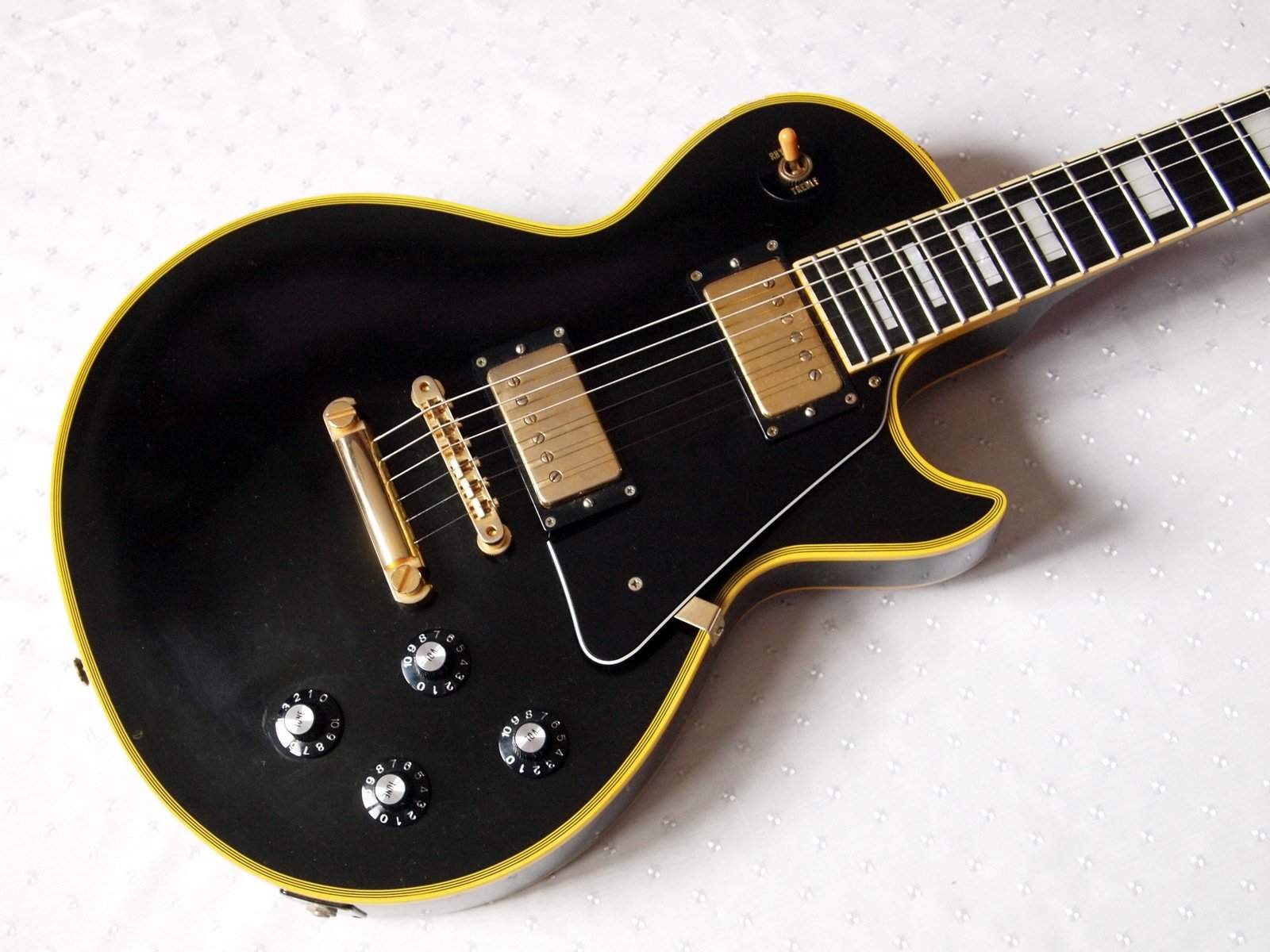 Отличная японская реплика Les Paul Custom от знаменитой фирмы ESP в духе Black Beauty, выполненная со всей тщательностью, с желтыми окантовками и матовым лаком