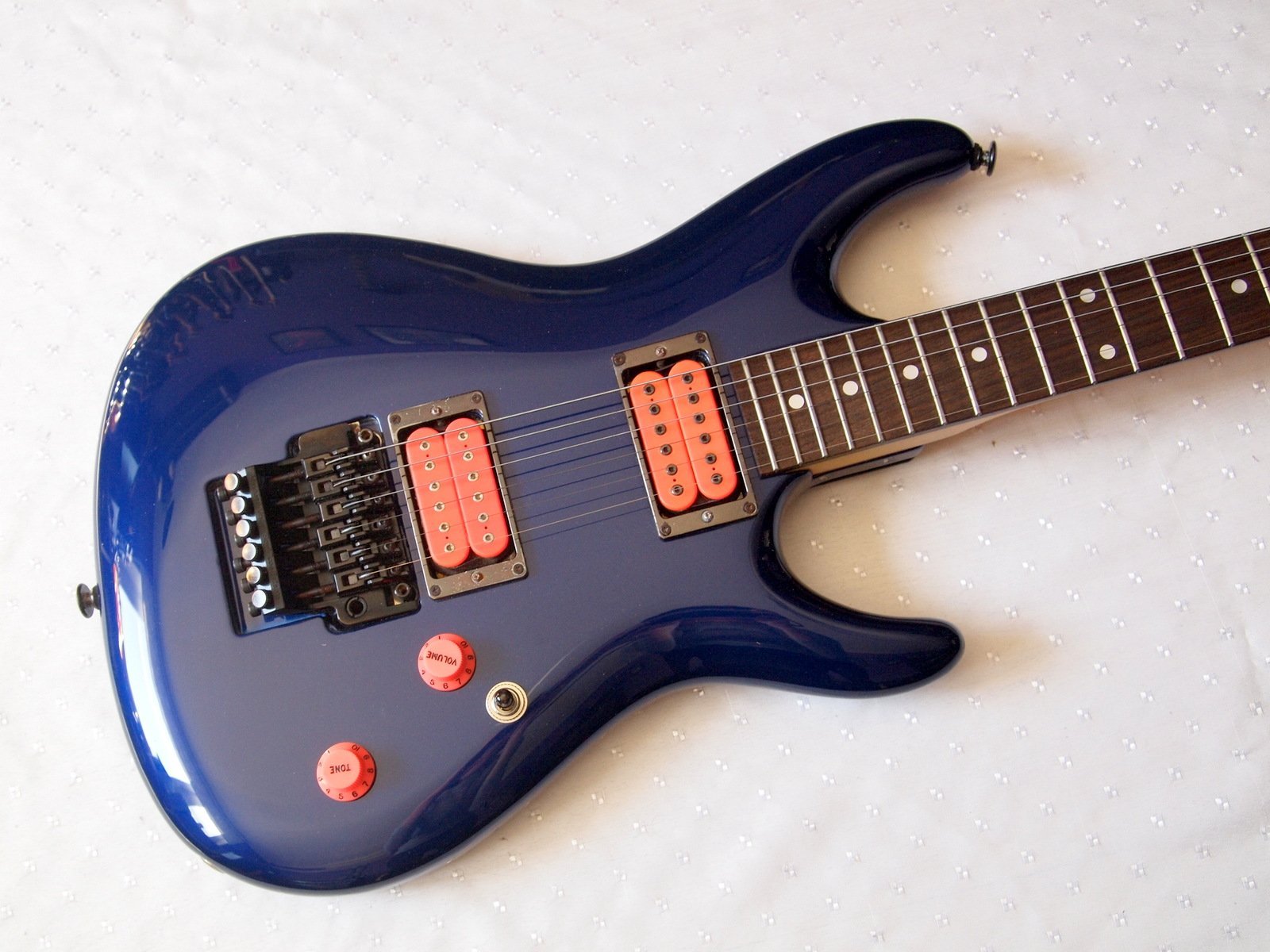Инструмент творчески замоден-установлены звукосниматели Dimarzio Fred и Paf Pro розового цвета и такие же розовые ручки громкости и тембра , что в сочетании с неоново синей декой дает полное погружение в 80-е.