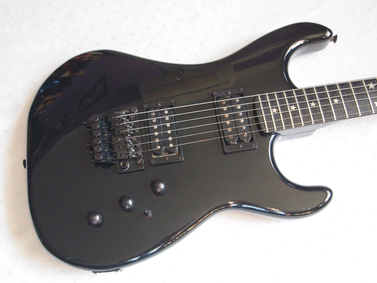 Отличный и очень редкий суперстрат от Kramer — полностью черный с маркерами ладов в виде звезд и тремя ручками в темброблоке!!! Это гитара cо знаменитыми лекалами Pacer , форму головы которых безо всякого стеснения использовали Suhr и Tom Anderson(но второй хотя бы имеет на это право, так как работал на Kramer и приложил руки ко многим моделям, в том числе и этой серии) Изготовленный со всей тщательностью на фабрике ESP, оснащенный Schaller Floyd Rose и двумя хамбакерами в неке стоит Kramer KP-1000, а в бридже Seymour Duncan 59 изготовленный тоже в конце 80-х. Звук ломовой, именно такой как привыкли слышать на пластинках из конца 80-х, яркая середина, плотный, упругий низ, звонкий верх, впечатляющий сустейн , яркая атака, обертона и флажолеты. По поводу качества звучания могу сказать так — вы можете купить Suhr Modern , а можете эту гитару по цене в три раза дешевле и она не намного ему уступит!!!
