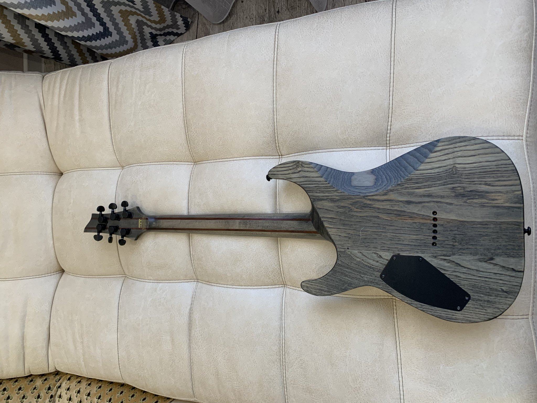 Как и многие другие электрогитары с конструкцией "гриф сквозь корпус", инструмент не сбалансирован - гриф тяжелый, "уши" легкие, в итоге заваливается влево при игре сидя. При игре стоя, когда гитара на ремне, такой проблемы не возникает.