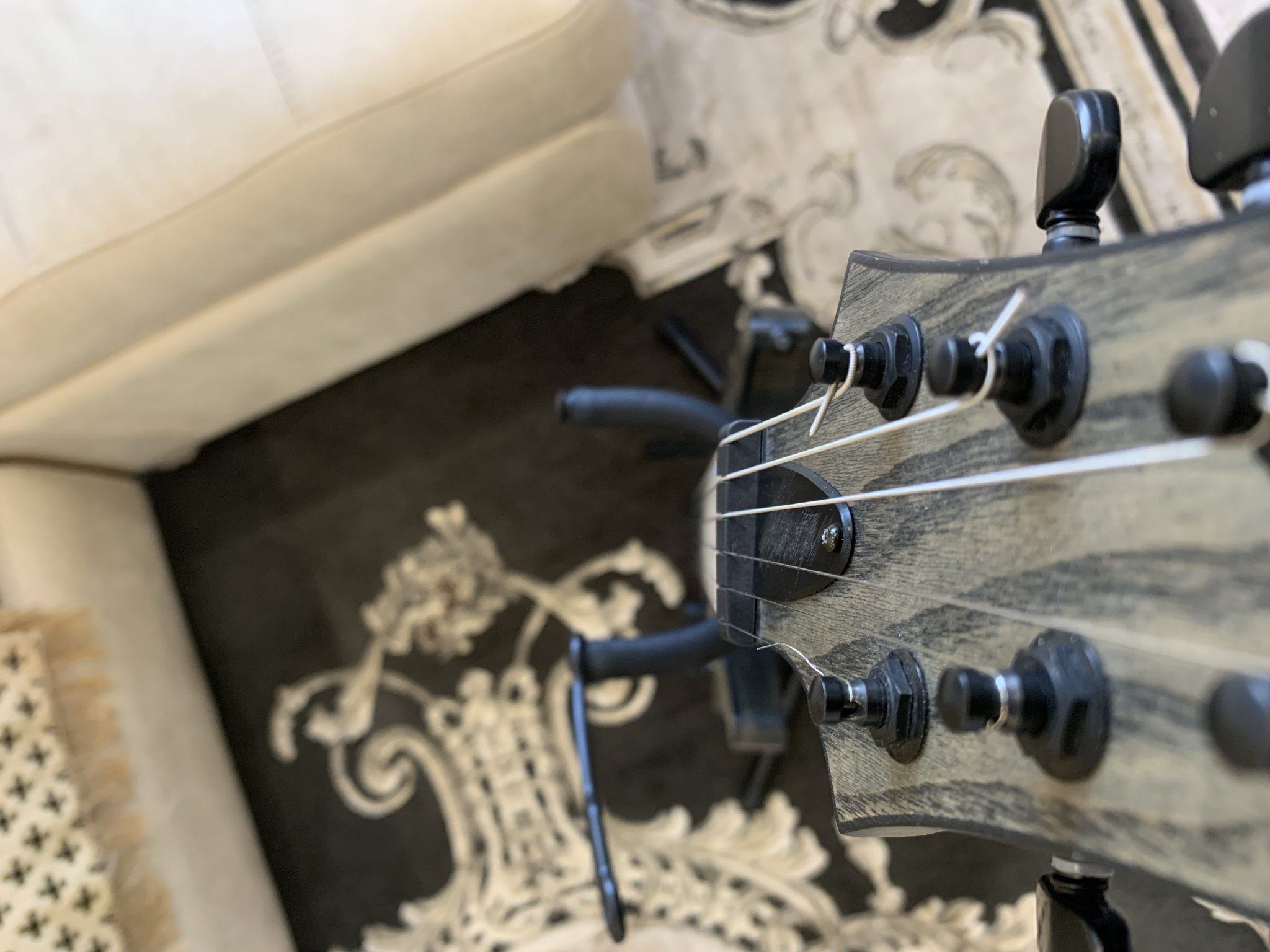 Инструмент отлично держит строй (в том числе, благодаря локовым колкам), высоту струн над грифом можно настроить любую (конструкция бриджа это позволяет);
