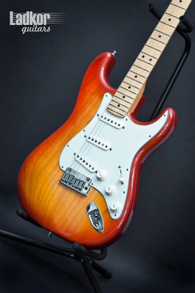 Настоящий американский Fender Custom Shop. Сразу чувствуется крутость инструмента даже по фото - дека по рисунку идеально выбрана - красивейший рисунок ясеня с обоих сторон деки, все детали вылизаны. Не зря кастом шоп берут в два раза больше денег чем за серийные гитары, тут виден индивидуальный подход мастера к гитаре, что ее сделали с любовью. Звучит гитара так же на порядок выше обычных делюксов - дерево, электронка и остроенность инструмента на фабрике играют не малую роль в цене и звуке страта, фона от синглов даже на гейне почти нет.