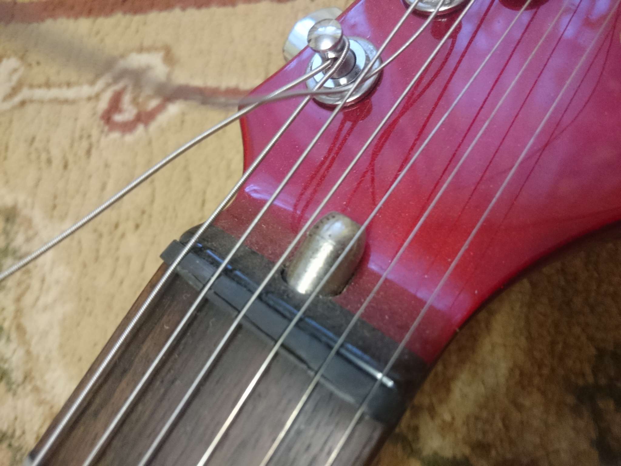 Стоят свеженькие струны, гитара отполирована и отстроена, цвет красный.