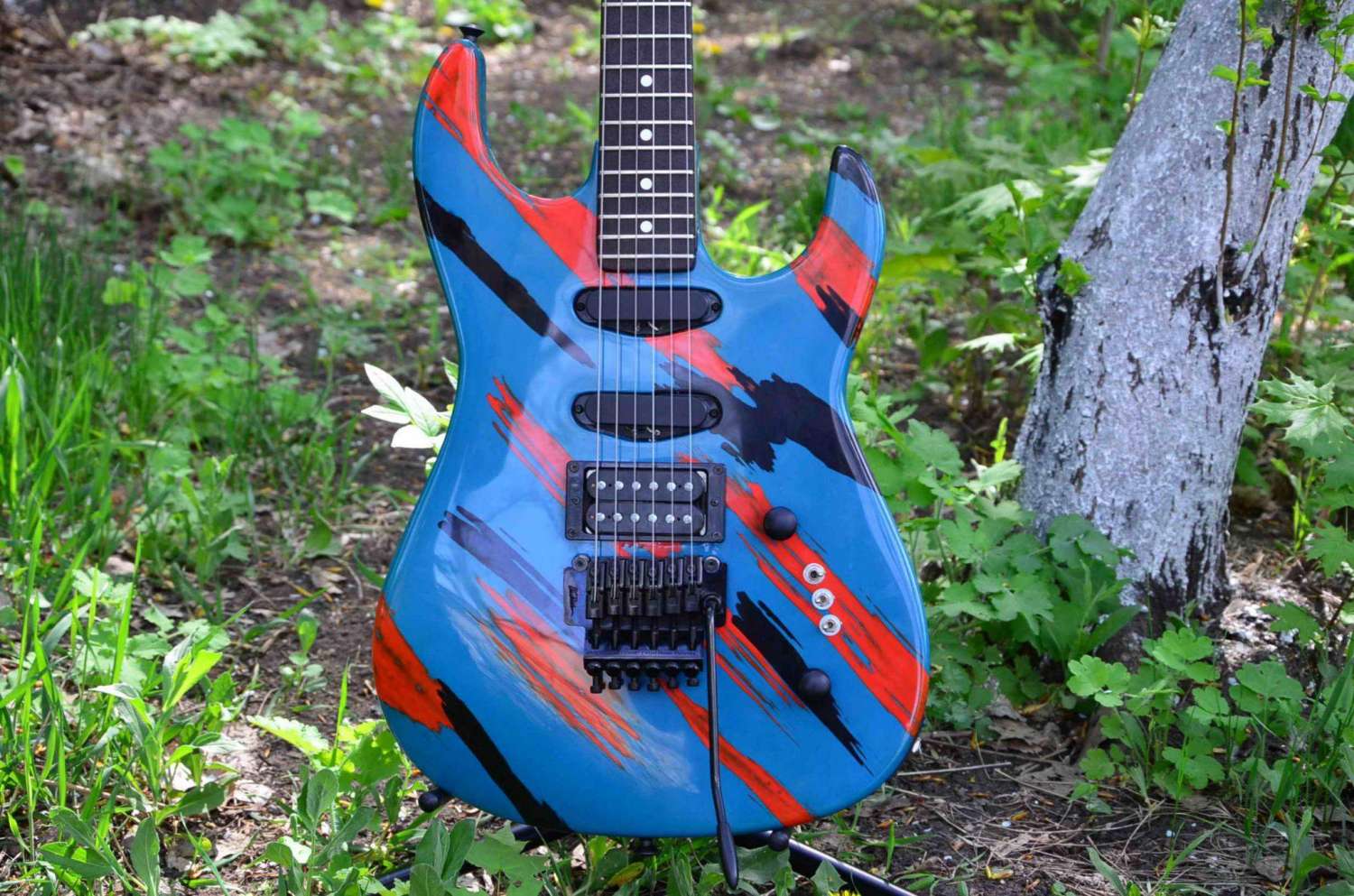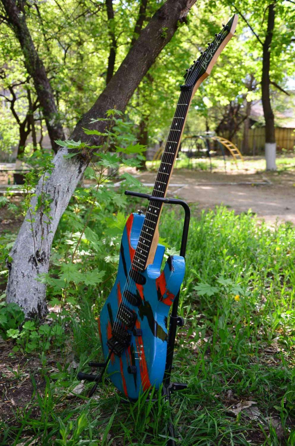 Сразу скажу - гитара меня ни в чем не разочаровала. С самых первых мгновений доставляет окраска гитары - берешь в руки и они сами начинают играть "Kickstart my Heart" или "Dr.Feelgood". Да,да - эта гитарка родом оттуда,из того славного времени,когда крутые парни выходя на сцену не считали западло покрепче затянуть на себе спандекс и как следует намазаться тенями для век и помадой