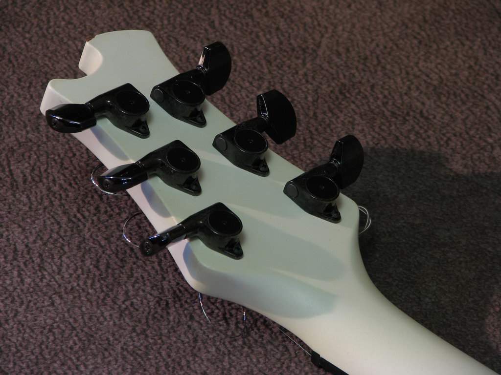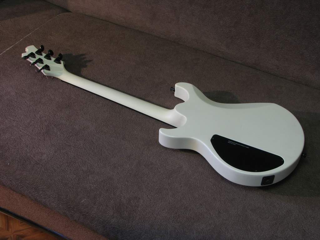 Косметическое состояние гитары я бы описал как "отличное". См. фото. Визуально когда инструмент вместе с вами на сцене - он выглядит почти как новый. Если близко присмотреться - на поверхности деки можно найти пару небольших вмятинок (попробовал показать на фото), они не заметны при реальных условиях и освещении на концертах благодаря матовому покрытию деки Pro White. Есть два мизерных скола, один в месте где правая рука лежит на деке, второй - на задней стороне края головы грифа. При игре эти сколы не видны ни вам ни зрителям.