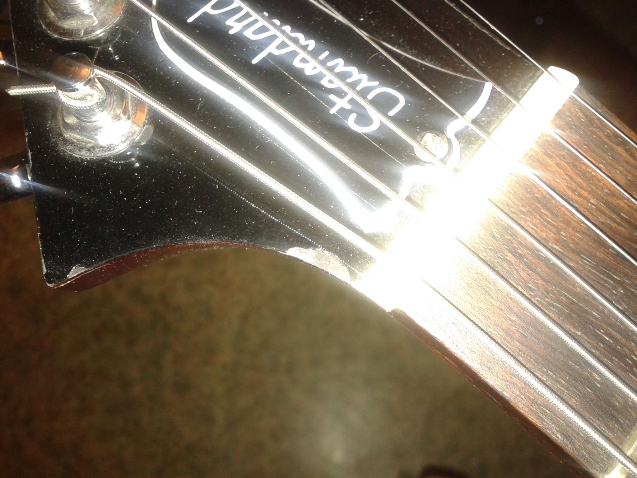 4) Верхний стрэп-пин ранее был перемещён на ребро деки (видно на фотографиях), сейчас он на месте, а на ребре деки отверстие.