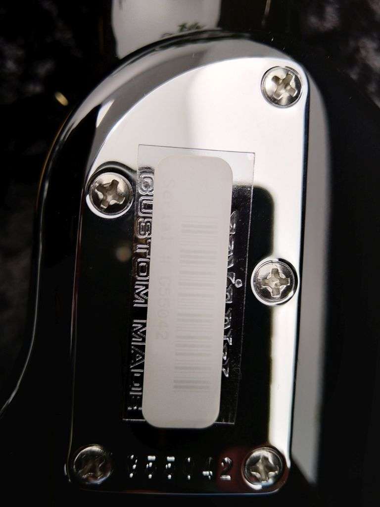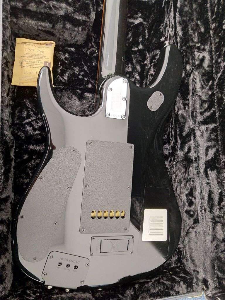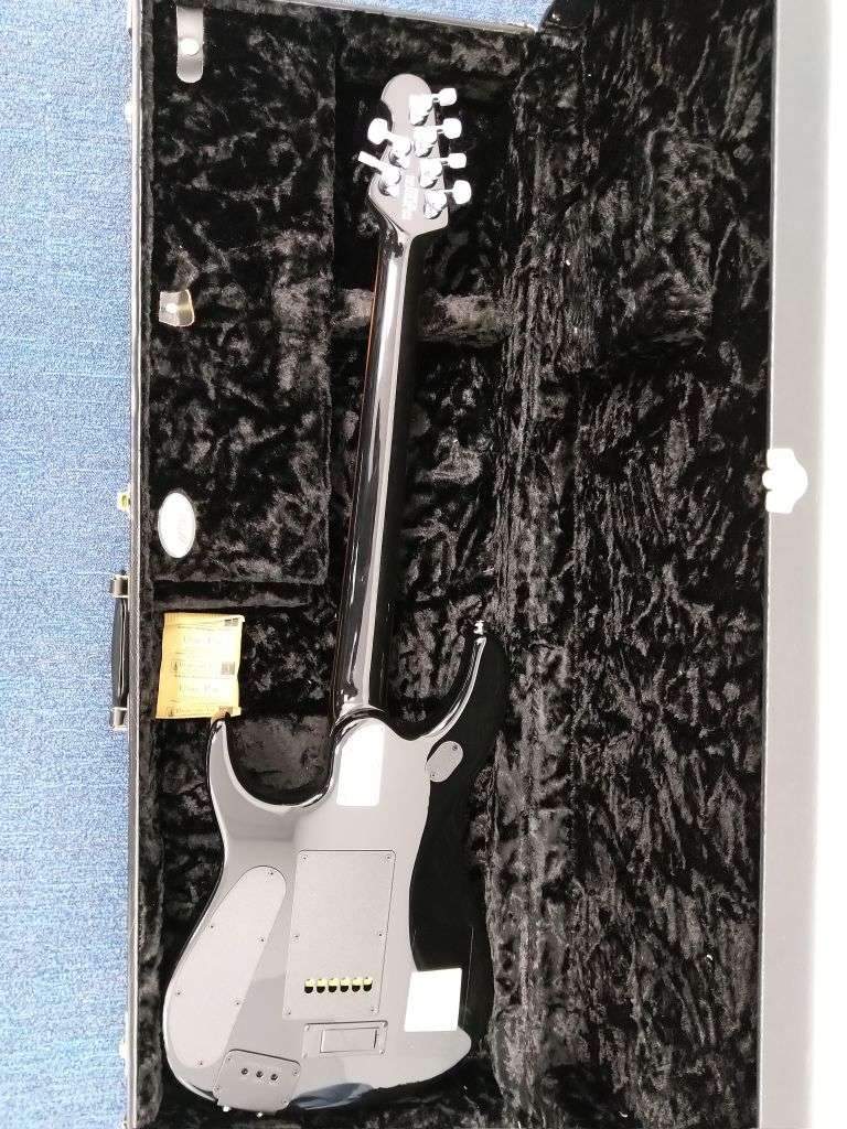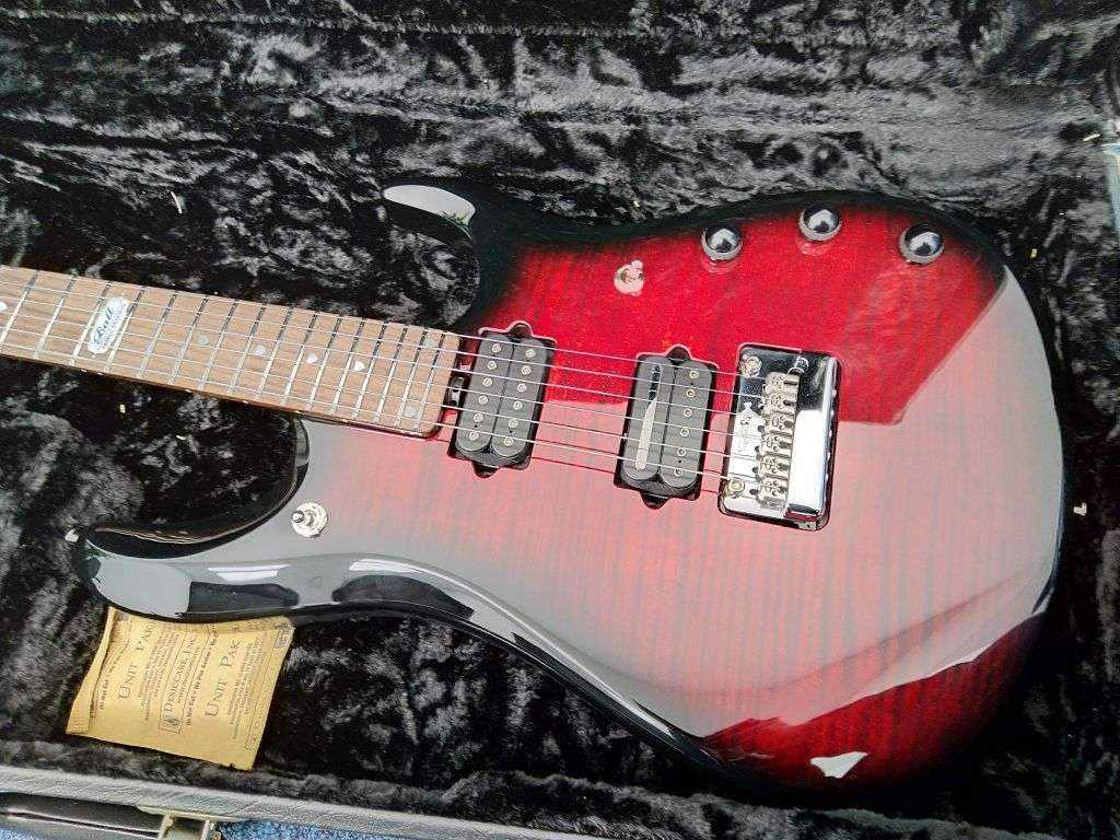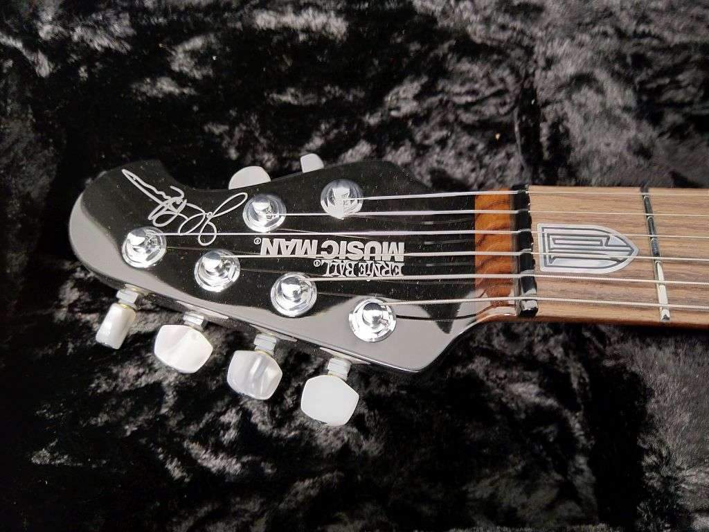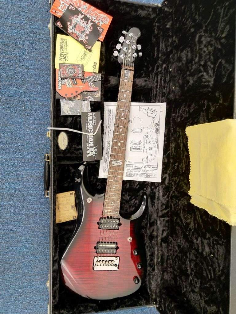 Гриф - красное дерево, на болтах, накладка палисандр. Корпус из ольхи с очень красивым кленовым топом и вставкой из красного дерева в тон блоке. Локовые колки Шаллер, звукосниматели DiMarzio LiquiFire и DiMarzio Crunch Lab. Лады из нержавейки. Машинка с Custom John Petrucci Music Man Piezo. Дата производства - конец 2012 года.