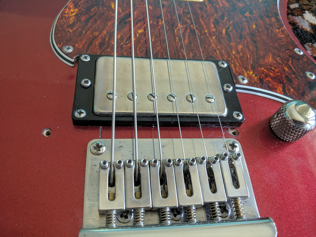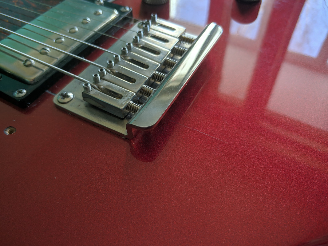 По косметике есть к сожалению минусы доставшиеся от предыдущего владельца - за струнодержателем есть небольшая трещина лака (точно не дерево, ибо снимал смотрел)... видимо перетянули струнодержатель, от того же струнодержателя зачем то была сделана канавка не большая (полагаю что то с заземлением может мутили чего). И наконец последнее - два отверстия от саморезов небольших (почему то именно так решили крепить midi датчик...