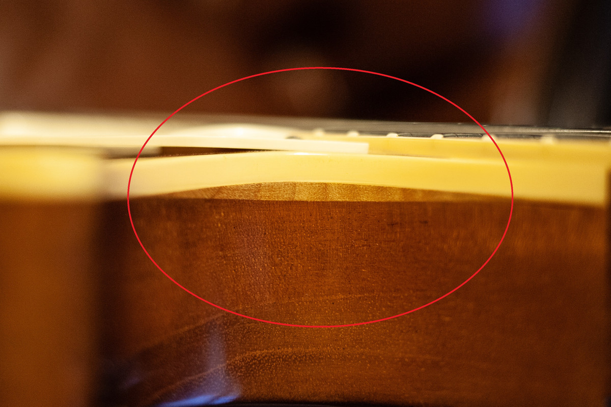 Структура огненного клена может быть заметна сквозь краску топа, узор видно в полости ручек тона и громкости, и на срезе cutaway (фотографии приложены).