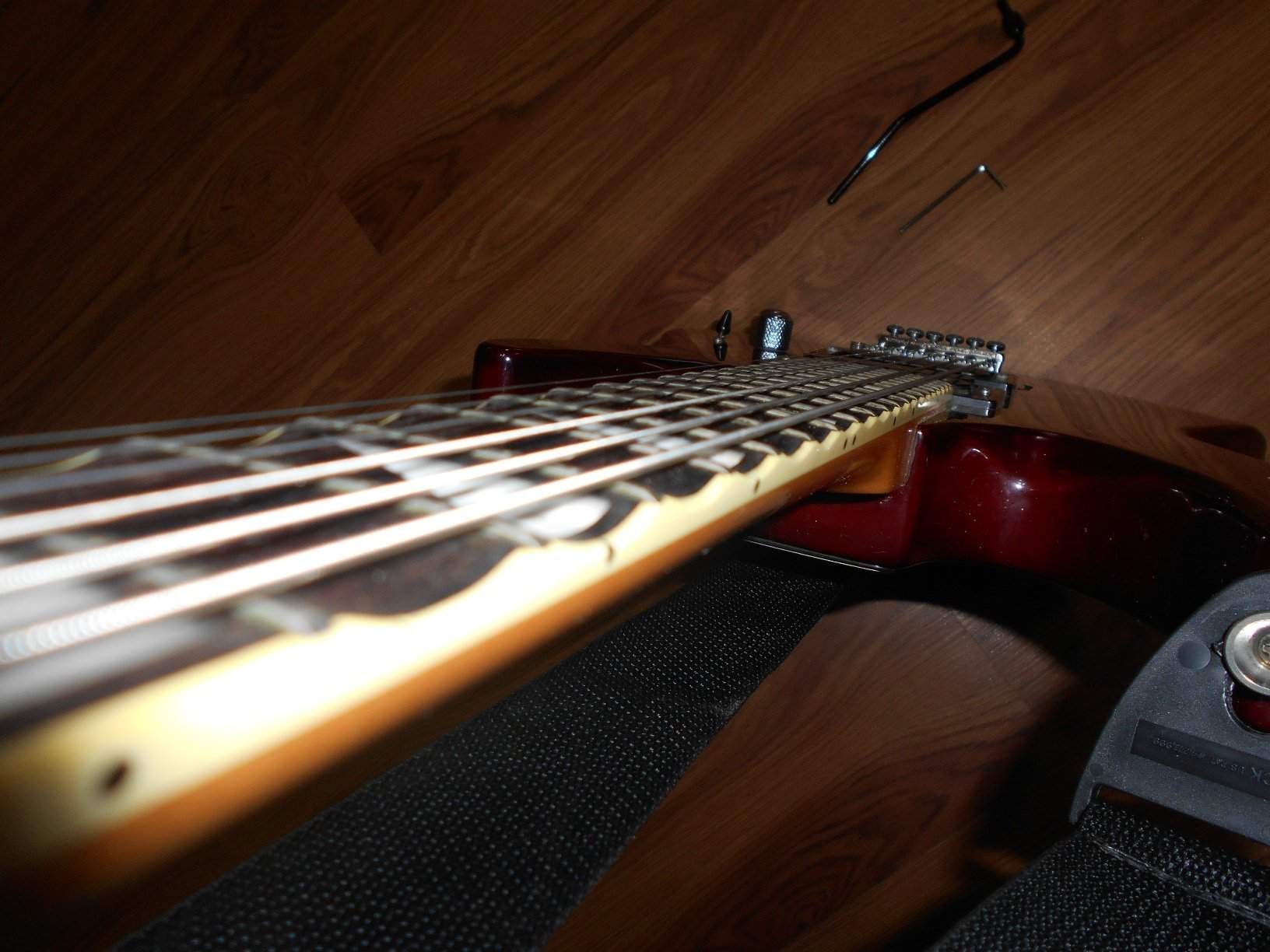 Сейчас стоят струны 12-60 от D'Addarrio, настроена в Drop B, звучит резко и мощно за счёт хамбакера от Jackson в бридже и тепло на клине в нэковом положении. Скалопироварие же в свою очередь помогает делать такие приемы как тэппинг, легато и бэнды легче и быстрее!