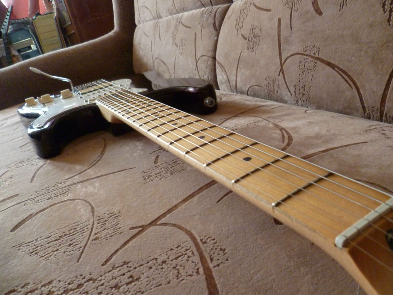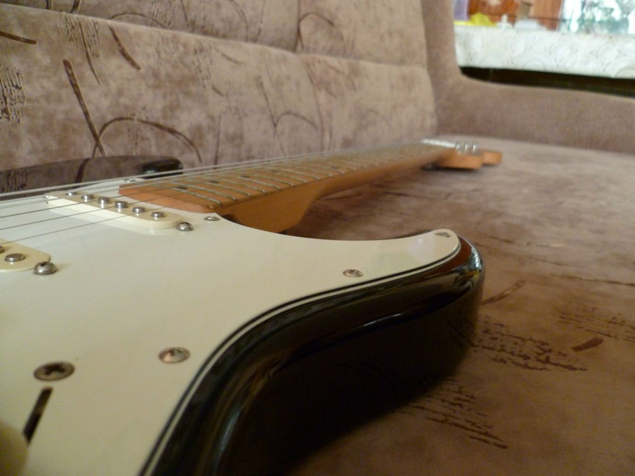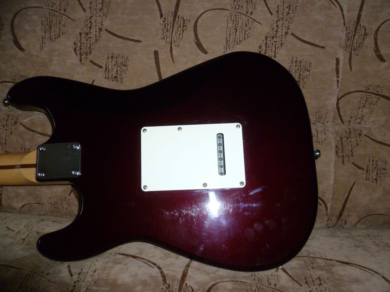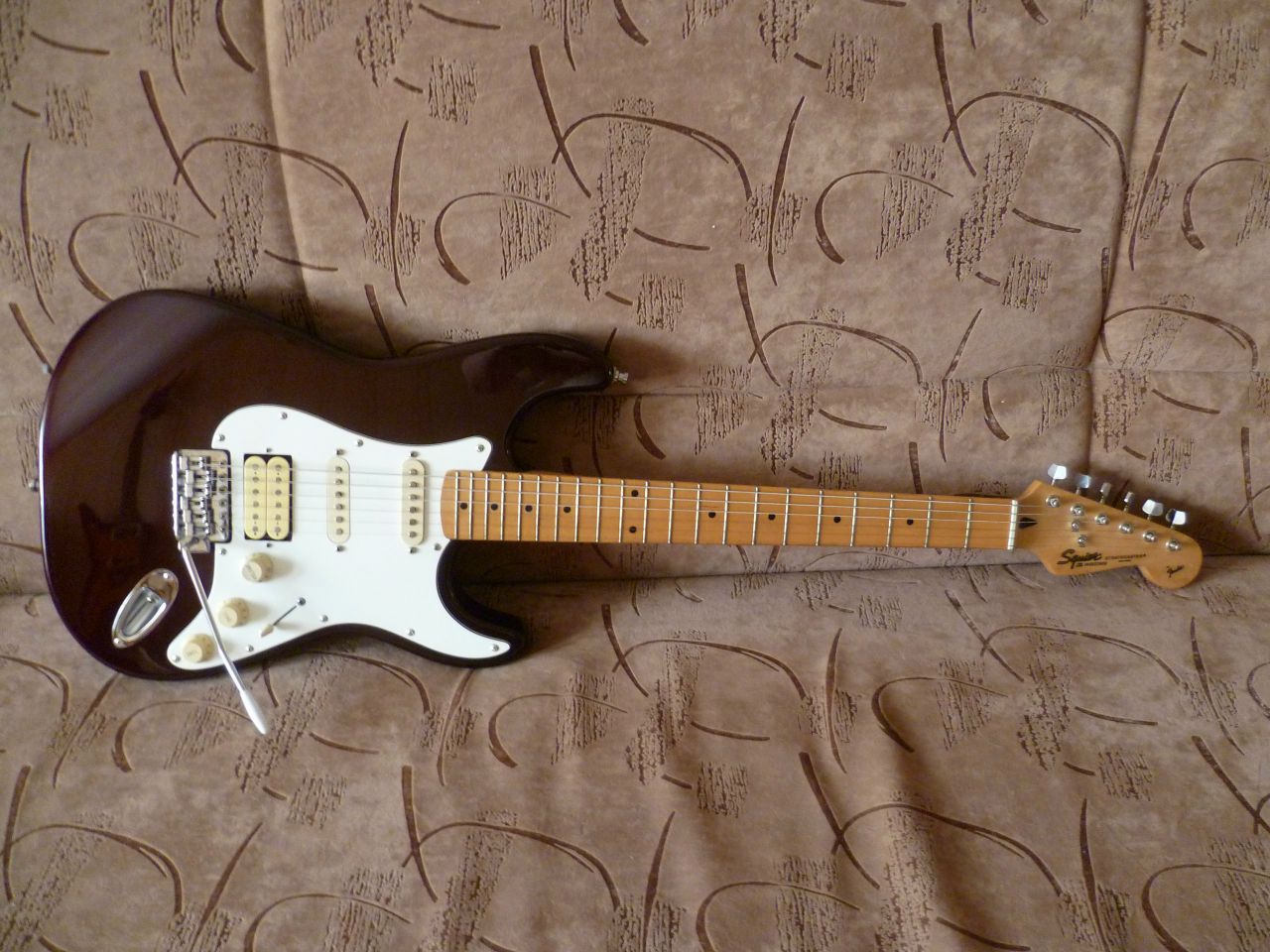 Squier Stratocaster by FenderКорейский кореец из Кореи. 1996 год, юбилейная серия к 50-ти летию фирмы "Фендор". Куплен в магазине "Мелодия" г. Саратов в 1997 году, с тех пор находился в одних руках. За это время появились потёртости от одежды и мелкие царапины. Сколов нет. Мензура 24,75" Экранирован медью. Дека - ольха, гриф - цельный клён без накладки. В целом состояние очень хорошее. В комплекте рычаг тремоло, жёсткий кейс, требующий ремонта. Пересыл по РФ.