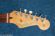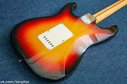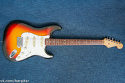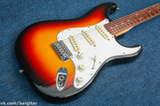 Отличный японский стратокастер от компании Fender, но бюджетной серии Squier Silver Series. Предыдущий владелец очень хотел, чтобы он стал Фендером, поэтому нанёс на голову грифа логотип Fender, в меру прямоты своих рук, и плюс поставил подпятник с надписью Fender Custom Shop. Фендером гитара так и не стала, но в целом это хороший, надежный, отстроенный стратокастер. Соответствует олдскульному звучанию, так ценимому в винтажных гитарах. Следует отметить, что датчики позволяют ей, не теряя винтажного чистого саунда, весьма ярко звучать на перегрузе - ну в умеренных конечно рамках - но хард-рок, хэви-метал гитара потянет уверенно.