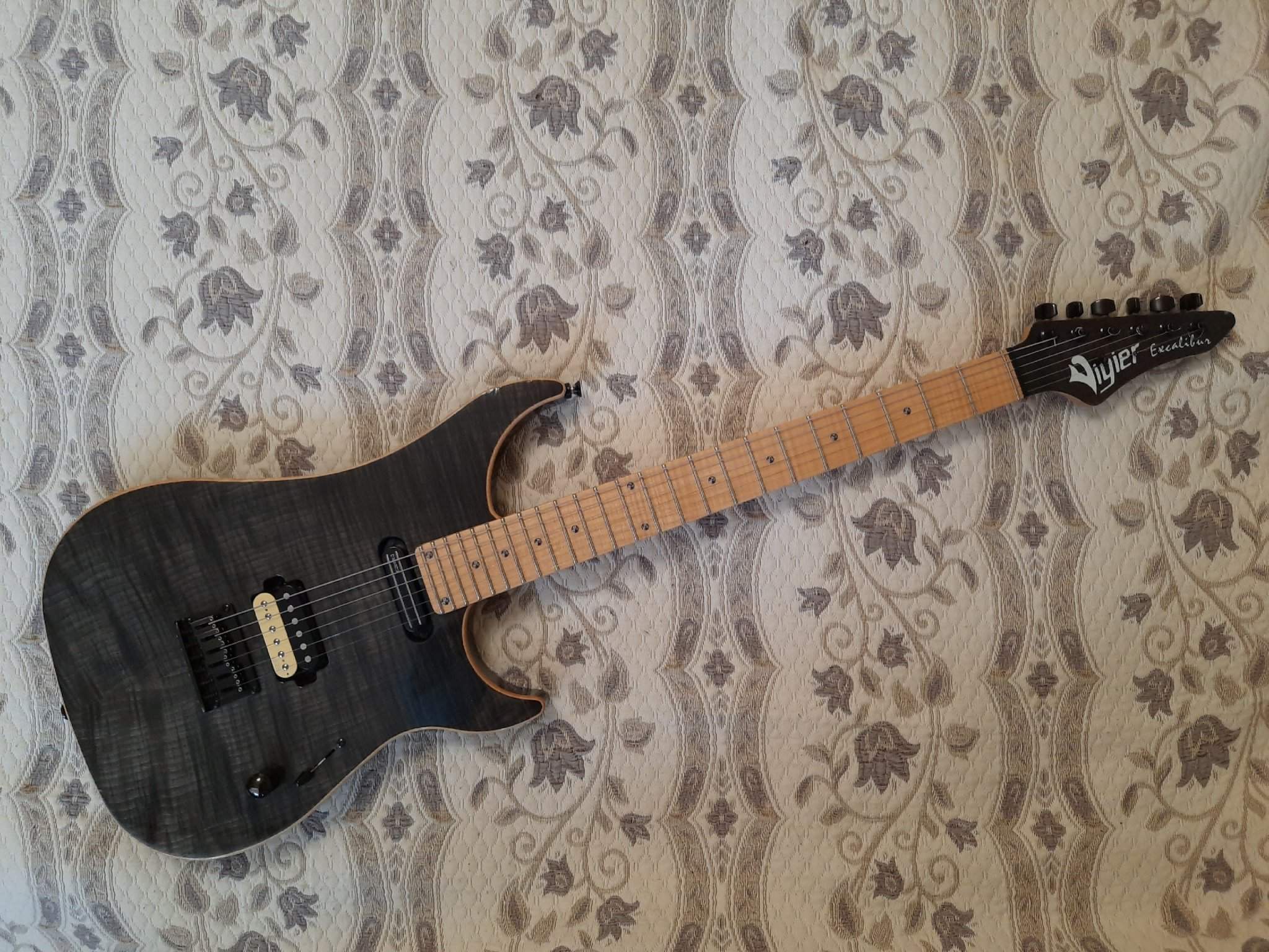 Гриф: клён, естественная сушка 3 года, форма D, покрытие матовое, голова в цвет корпуса. Ширина порога 42 мм, на 24м ладу 57.7 мм. Толщина на 1м ладу 19.5 мм, на 12м ладу 23 мм. Тефлоновый порог, нулевой лад. "Накладка" клён, радиус 300 мм, мензура 650 мм. Колки Вижье с увеличенными гайками локовых механизмов (для увеличения отдачи и сустейна). Маркеров нет, кастом версия, я в итоге наклеил "точки" из набора нот-самоклеек.