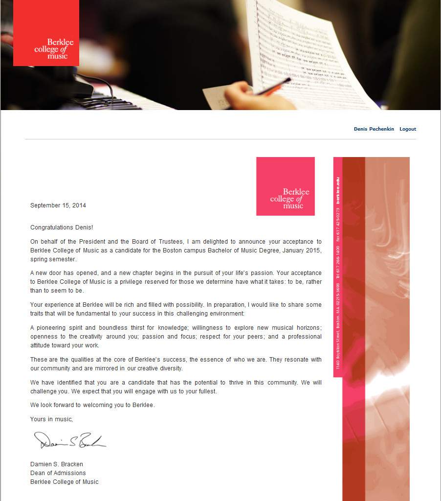 Достижения:- Прошёл конкурс на обучение в Berklee College of Music в 2014 год со скидкой в 20% за достижения (не поехал ввиду финансовой ситуации в 2014)