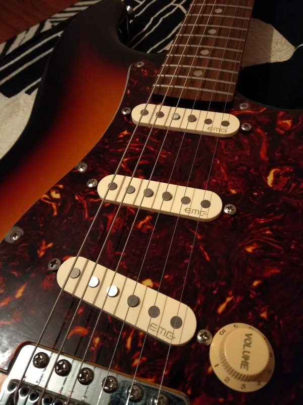 Продаю активные нешумящие звукосниматели EMG SV. Звучание классических винтажных стратовских синглов на alnico 5, но без фона. Полный комплект, потенциометры, пятипозиционник, клеммы, гнездо, коробка, бумажки. Все соединения безпаечные, собирается за 10 минут без паяльника и похода к мастеру. Идеальный вариант чтобы прокачать азиатский или мексиканский стратокастер. Состояние идеальное. Бонусом могу отдать кремовые крутилки, а так же отправить все в собранном виде на белом новом пикгарде (по договоренности)