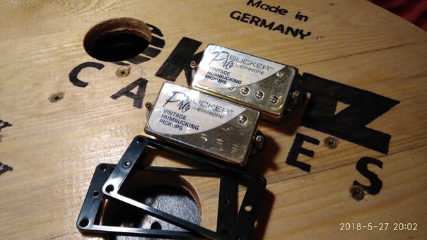 Сэт хамбайкеров для трушного рокешника. Б/у год. Без проблем. 4 провода для отсечки (расцветка Гибсон). Нэк- 8,2кОма, бридж- 8,8кОма. Есть потёртости золотого покрытия. Рамки в комплекте. За доплату укомплектую потенциометрами Пуш-пуллами и нормальными кондерами на 0,023мФ.