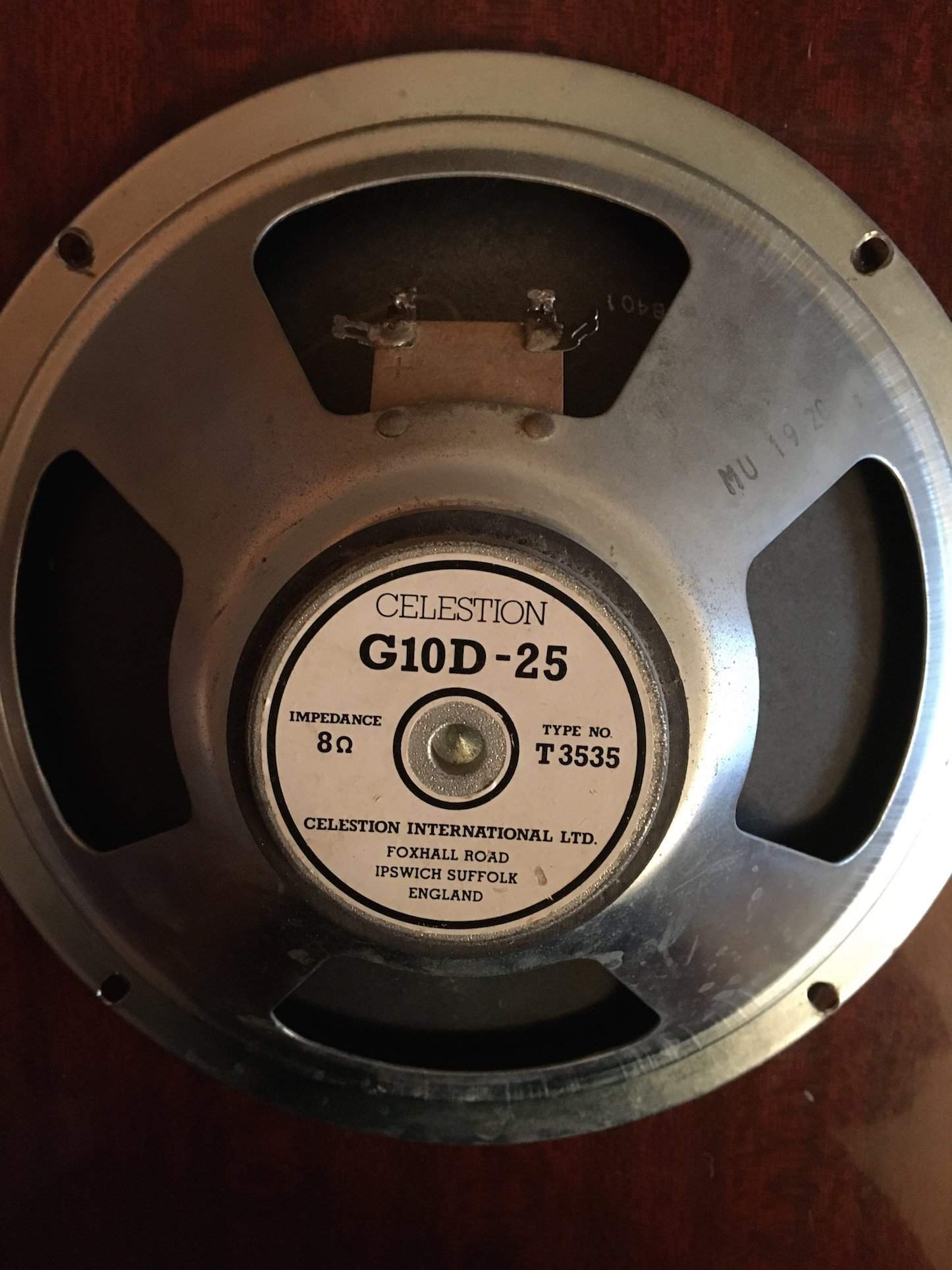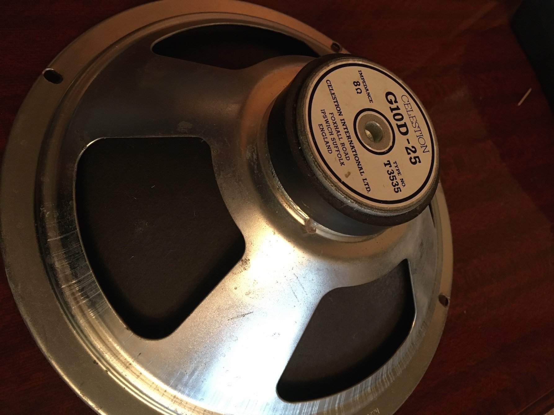 Продам винтажный гитарный динамик Celestion G10D-25, 8 Ом, 10", 25 ватт, Англия, 1986год. Динамик отлично разыгран, выдаёт упругий, насыщенный звук, с прекрасно сбалансированным верхом и низом, слегка подчёркнутой серединкой, но без резкости и ваты. Динамик в отличном рабочем состоянии, стоял в комбоусилителе Marshall Lead 12, сейчас таких не делают. Цена - 4200р.