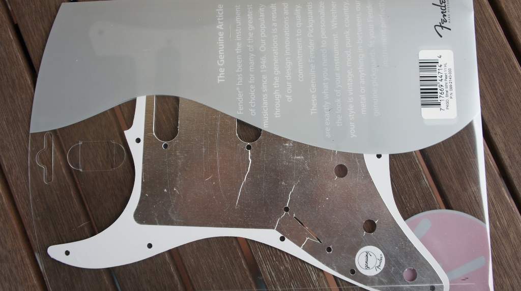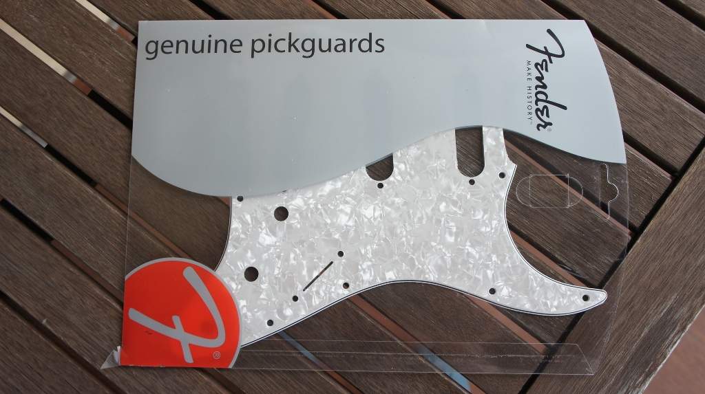 Оригинальный пикгард Fender Stratocaster цвет White Perl, made in USA. 11 отверстий,три сингла, абсолютно новый, в упаковке и под пленкой. Трехслойный, цвет белый перламутр.
