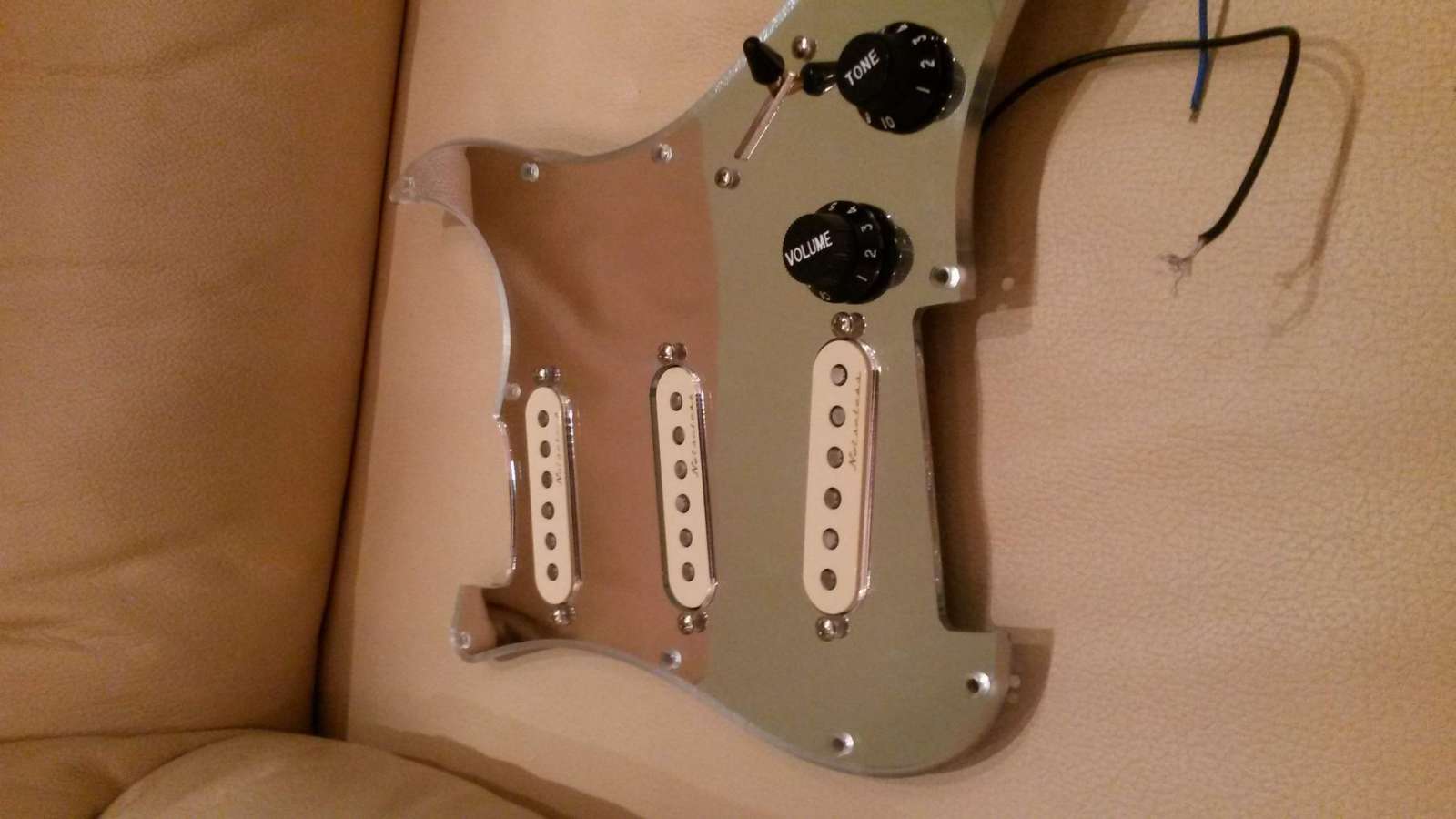 Продается просто обалденно выглядящий пикгард в сборе с установленными датчиками Fender Vintage Noiseless и черной фурнитурой.