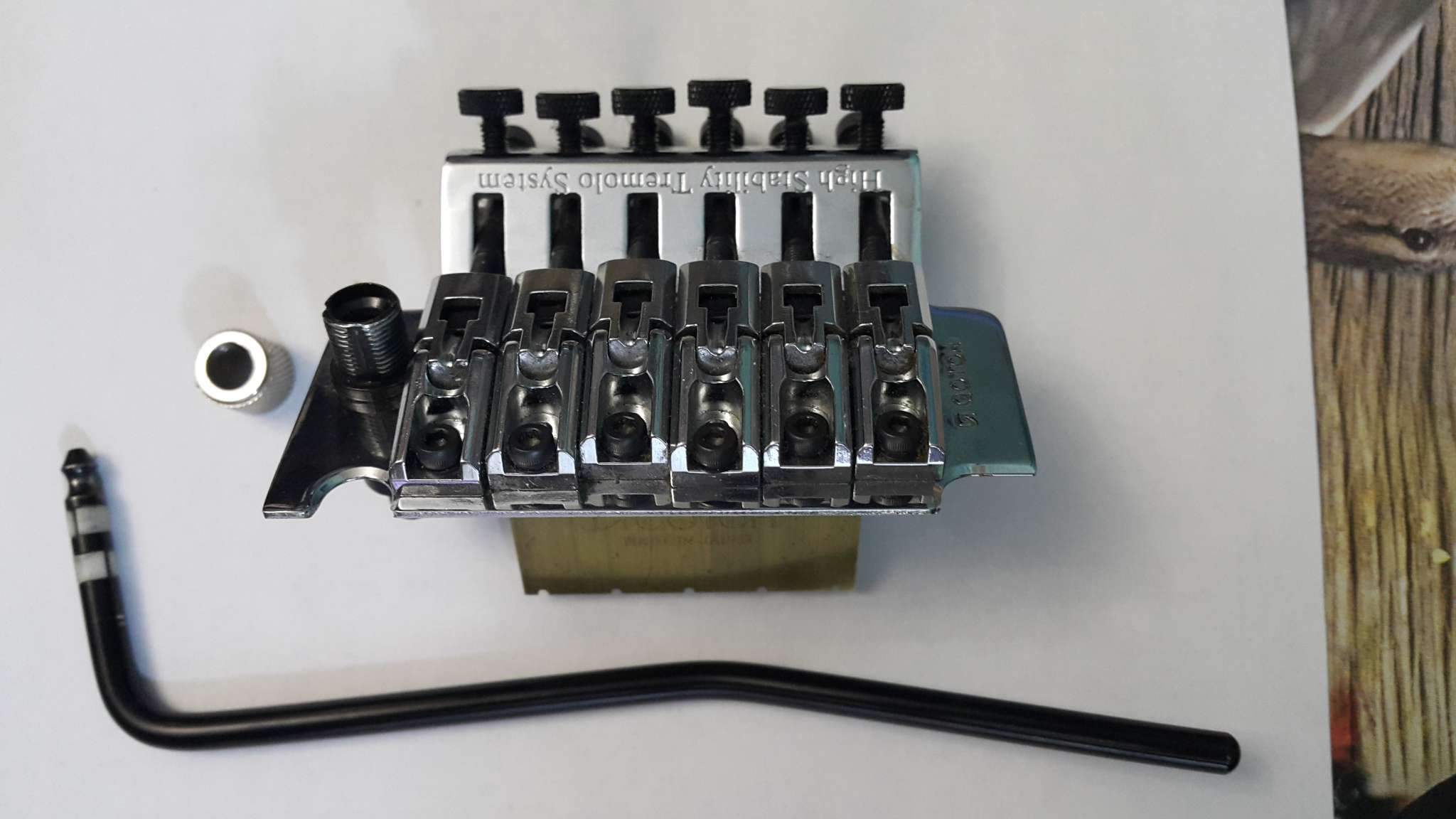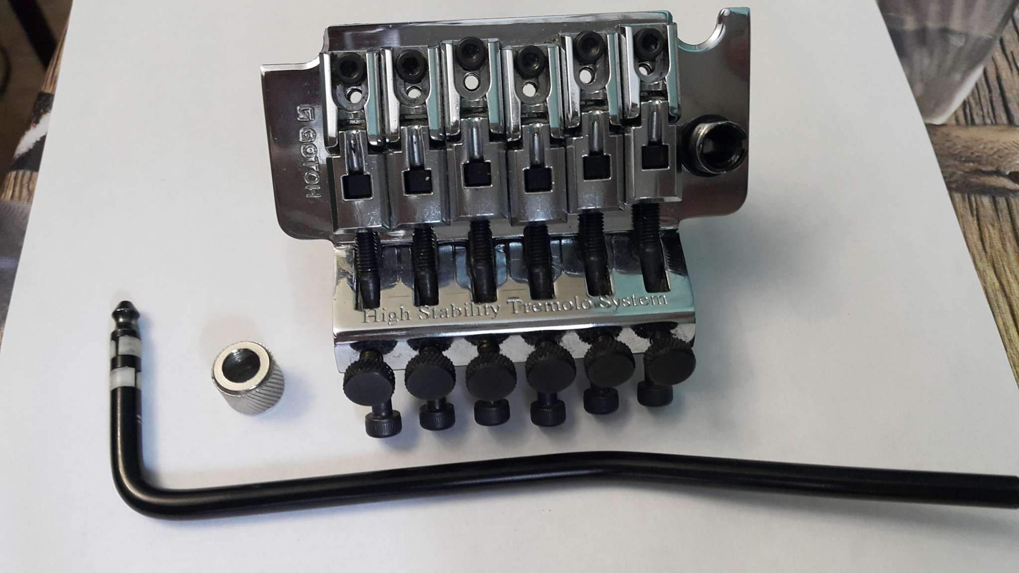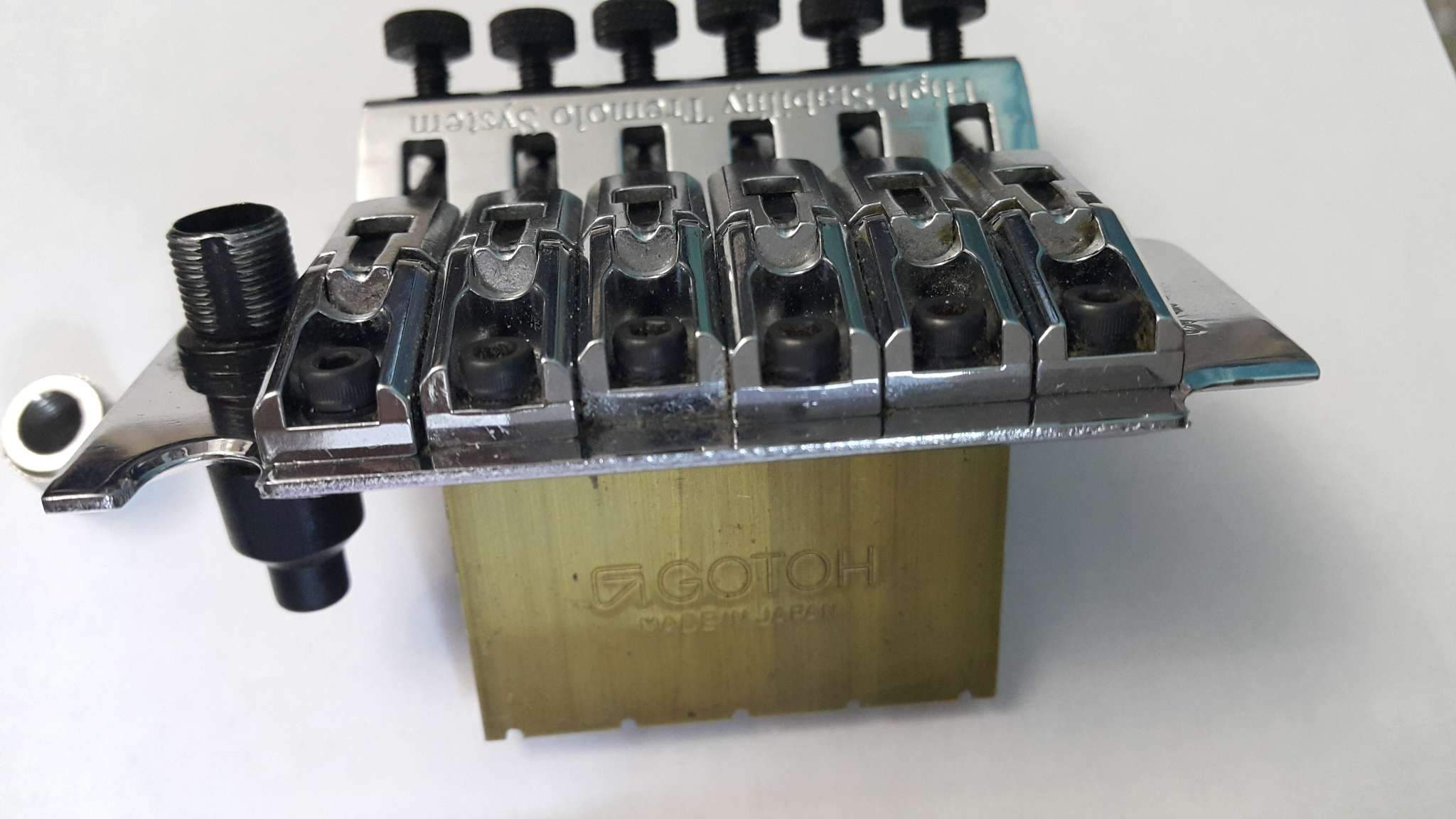 Тремоло Gotoh хром оригинал б/у в прекрасном состоянии, строй держит отлично с сустейн-блоком 36 мм. Стакан не родной, диаметр наружной резьбы для рычага – 9,5 мм, внутренней – 4мм. В комплекте рычаг от Ibanez Edge – вставляется не завинчиваясь. В подарок отдам запчасти от американской (а что-то от японской) машинок Jackson: 4 втулки, 4 винта опорных, 6 седел с винтиками, рычаг, станина, пластинки, сустейн блок 34 мм, 5 позиционный переключатель. По вопросам звоните, не стесняйтесь!